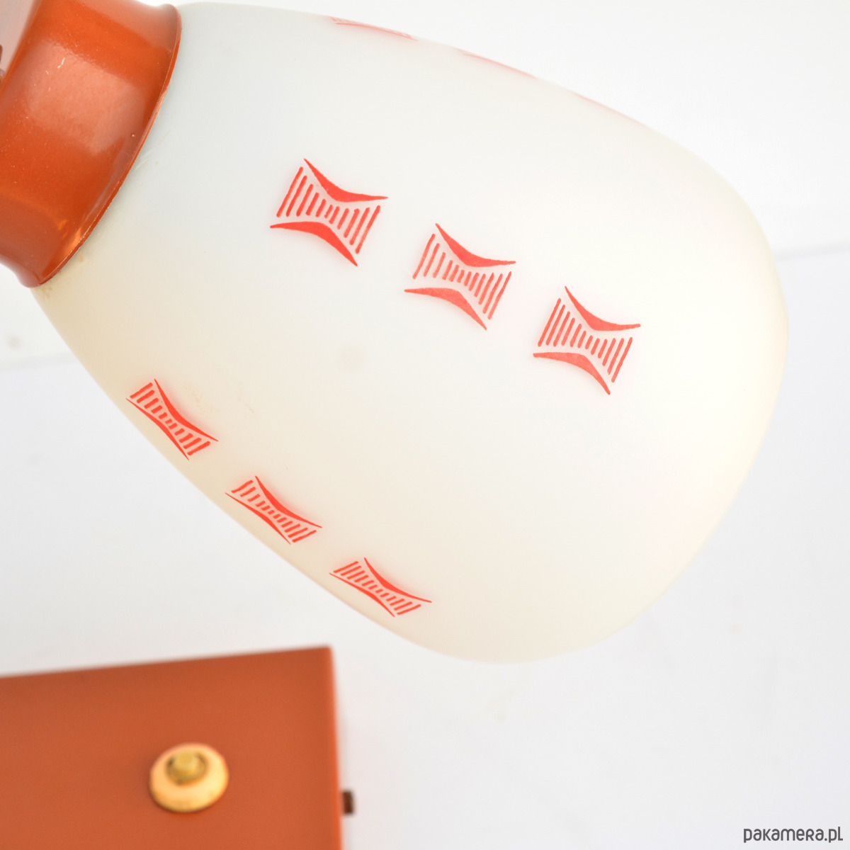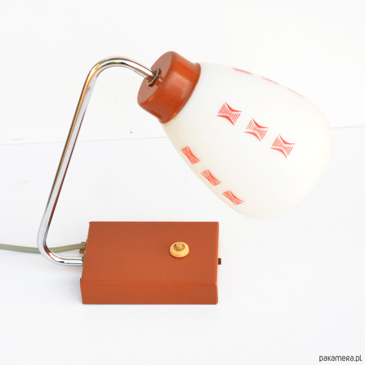 Lampa stołowa lub nocna typ L 197-1383 projektu Josefa Hurki, wyprodukowana w latach 60. w czechosłowackich zakładach Lidokov. Lampa o kloszu szklanym, mlecznym z ciekawym zdobieniem w stylu opart. Podstawa wykonana ze stali w kolorze brązowym, ramie chromowane. Włącznik guzikowy w podstawie. Przedmiot w stanie oryginalnym, bardzo dobrym nosi niewielkie ślady użytkowania. Lampa wymagana żarówka E27 do 60W. Przedmiot sygnowany.Wymiary: wysokość 29 cm | szerokość 13 cm | głębokość 30 cm