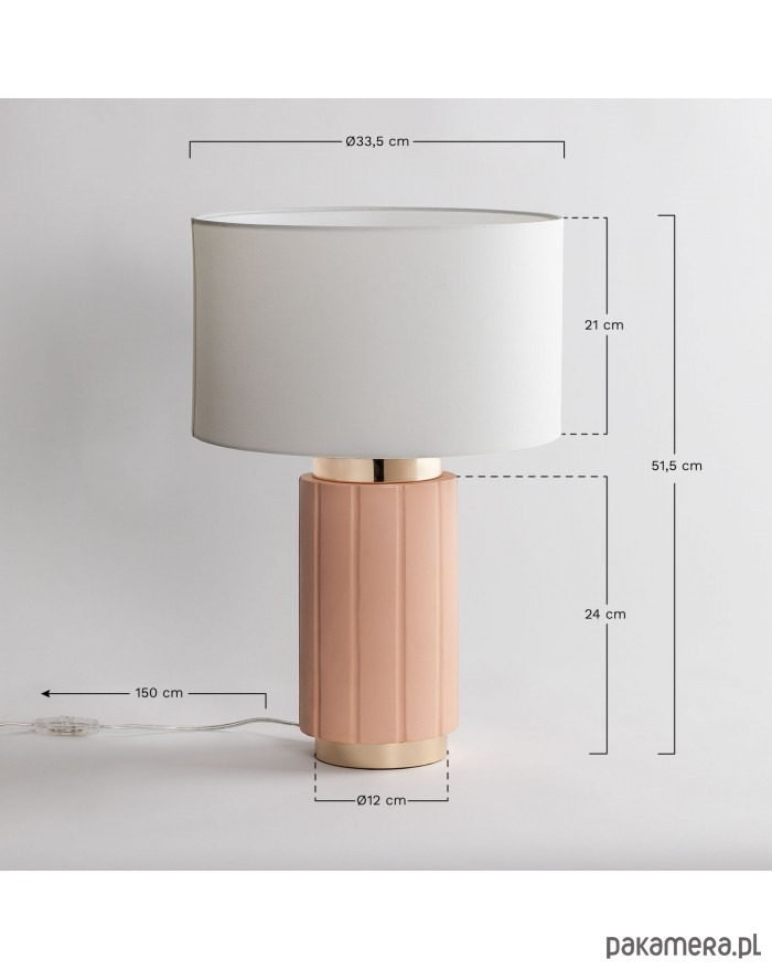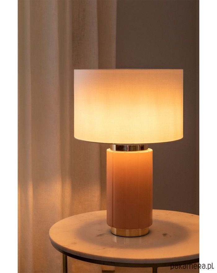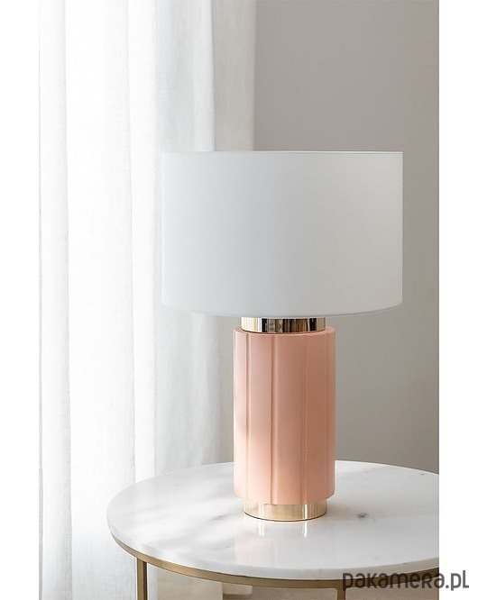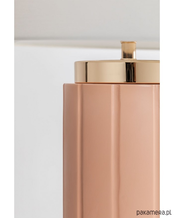 Lampa stołowa w stylu vintage. Podstawa wykonana z żywicy w kolorze pudrowym. Posiada elementy w kolorze złotym. Abażur jest w kolorze białym.