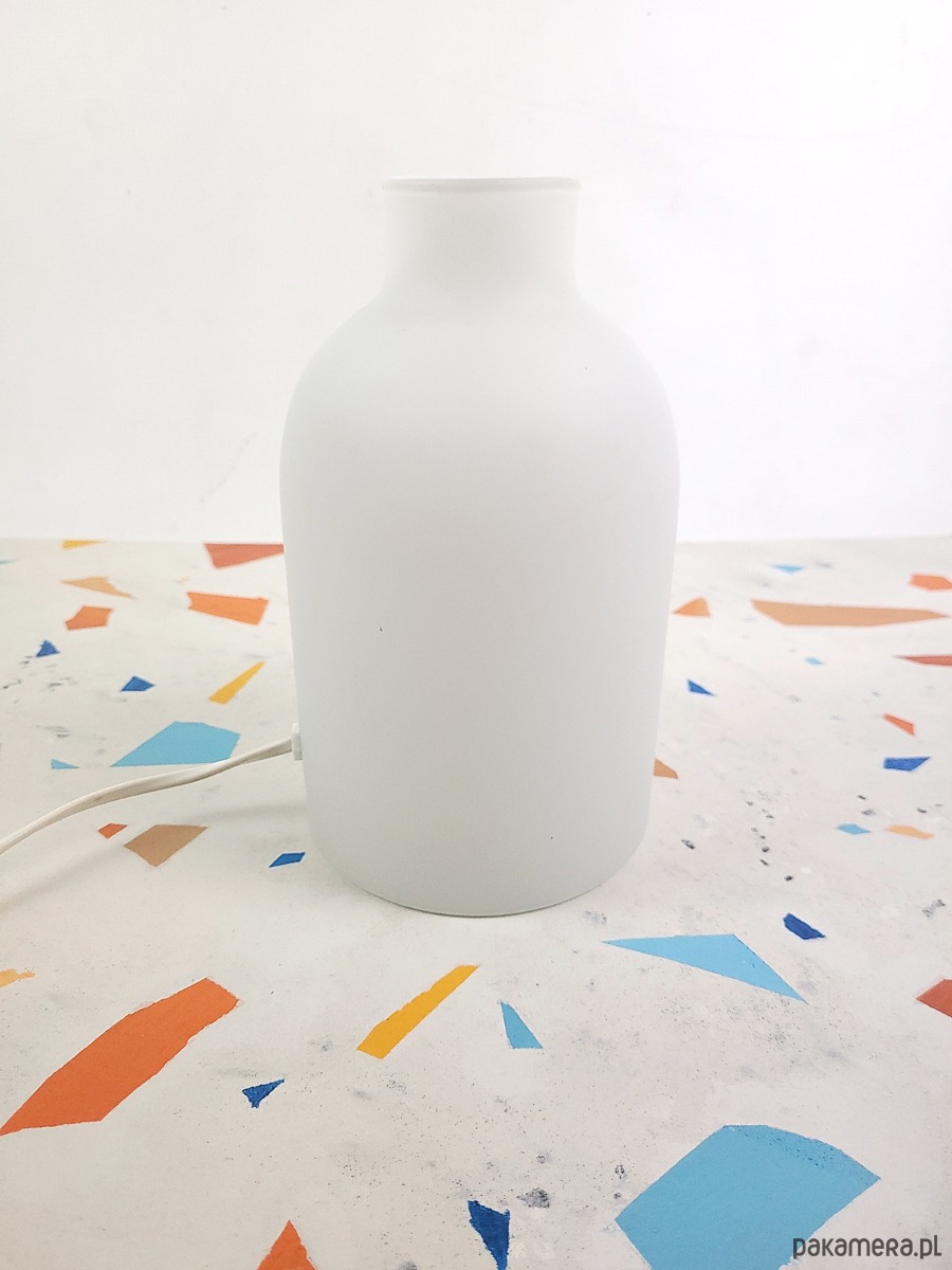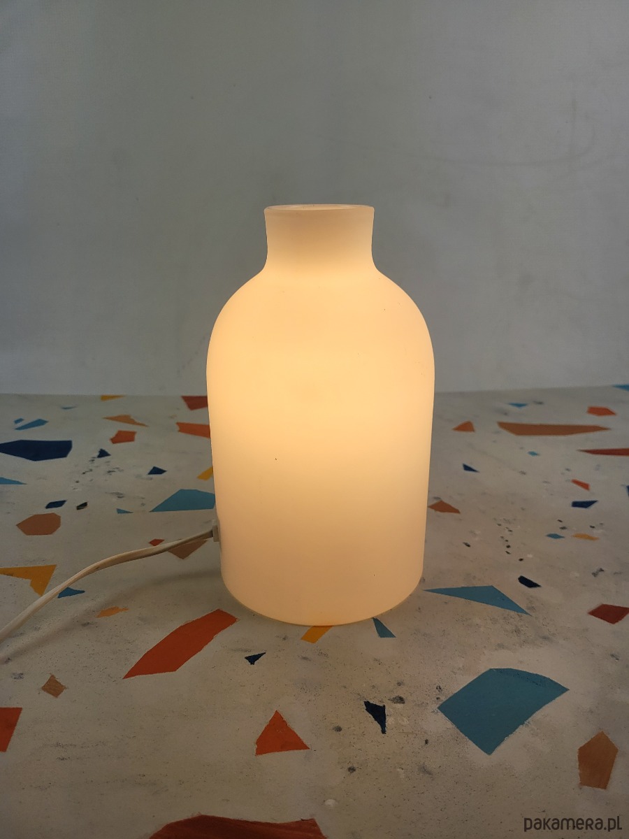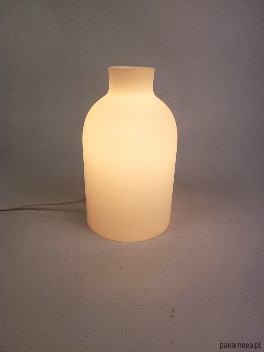 Stylowa lampa stołowa marki Société Centrale d'Eclairage SCE Francja lata 90. Wykonana z matowego, mrożonego szkła to kwintesencja nowoczesnego minimalizmu. Jej subtelna forma, inspirowana klasycznym kształtem butelki, sprawia, że oprawa ta pełni rolę nie tylko źródła światła, ale również wyrafinowanego obiektu dekoracyjnego. Szklany klosz o aksamitnej teksturze doskonale rozprasza światło, eliminując efekt olśnienia i wprowadzając do wnętrza kojący, nastrojowy blask. Dzięki swojej uniwersalnej estetyce lampa świetnie odnajdzie się w skandynawskich salonach, sypialniach w stylu boho czy nowoczesnych biurach, stanowiąc delikatny akcent na komodzie, stoliku nocnym lub regale. Solidne wykonanie z wysokiej jakości szkła gwarantuje trwałość, a czysty, biały kolor oprawy pozwala na łatwe dopasowanie jej do dowolnej palety barwnej pomieszczenia.