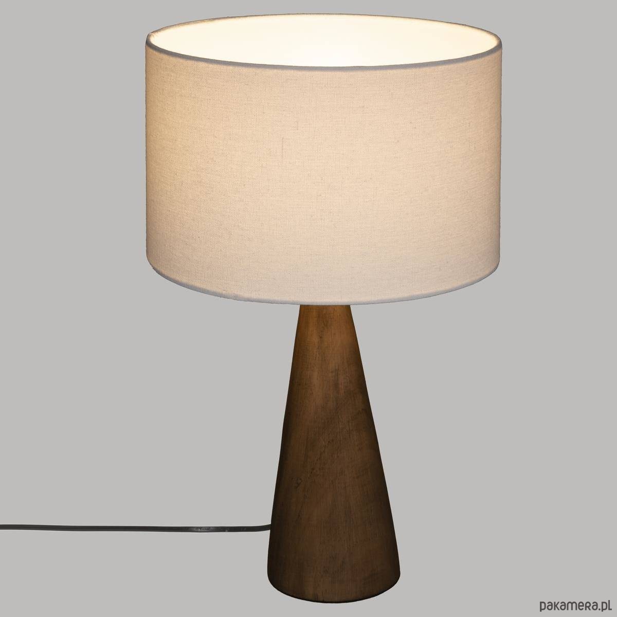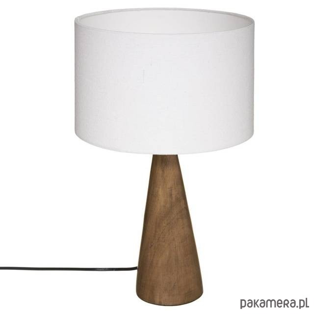 Bardzo ciekawa lampa stołowa na podstawie z drewna mango w kolorze orzechowym. Abażur wykonany z tkaniny, w kolorze białym.