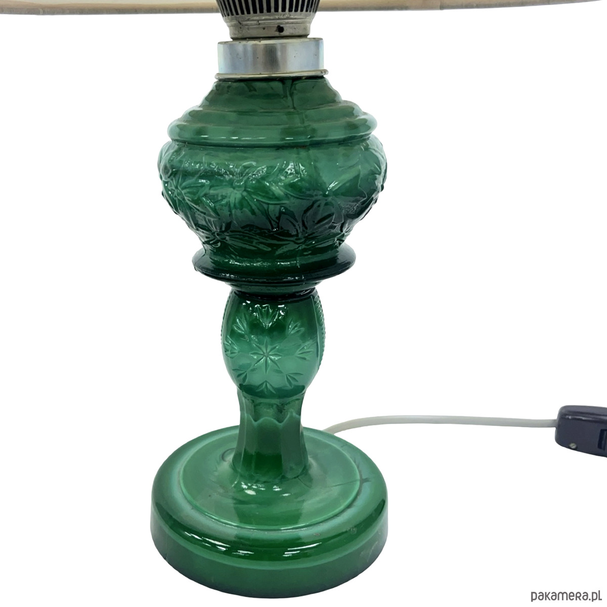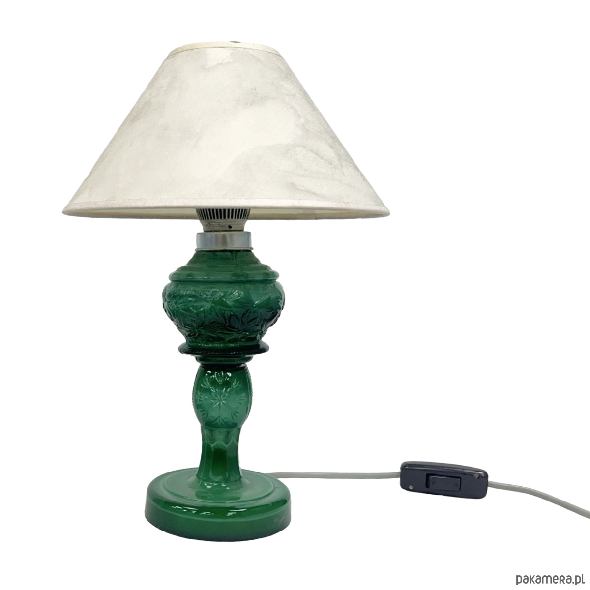 Bogato profilowana podstawa z delikatnym tłoczeniem dekoracyjnym nadaje lampie rzeźbiarski charakter, a mlecznobiały abażur pięknie rozprasza światło, tworząc ciepłą, nastrojową atmosferę. Doskonały przykład wysokiej jakości rzemiosła użytkowego z okresu powojennego modernizmu Europy Środkowej.
