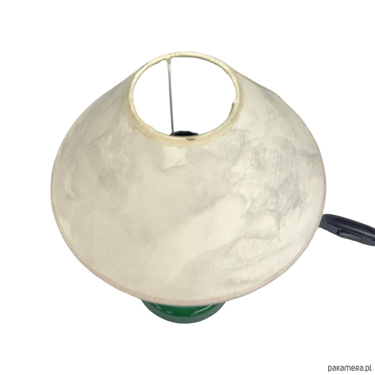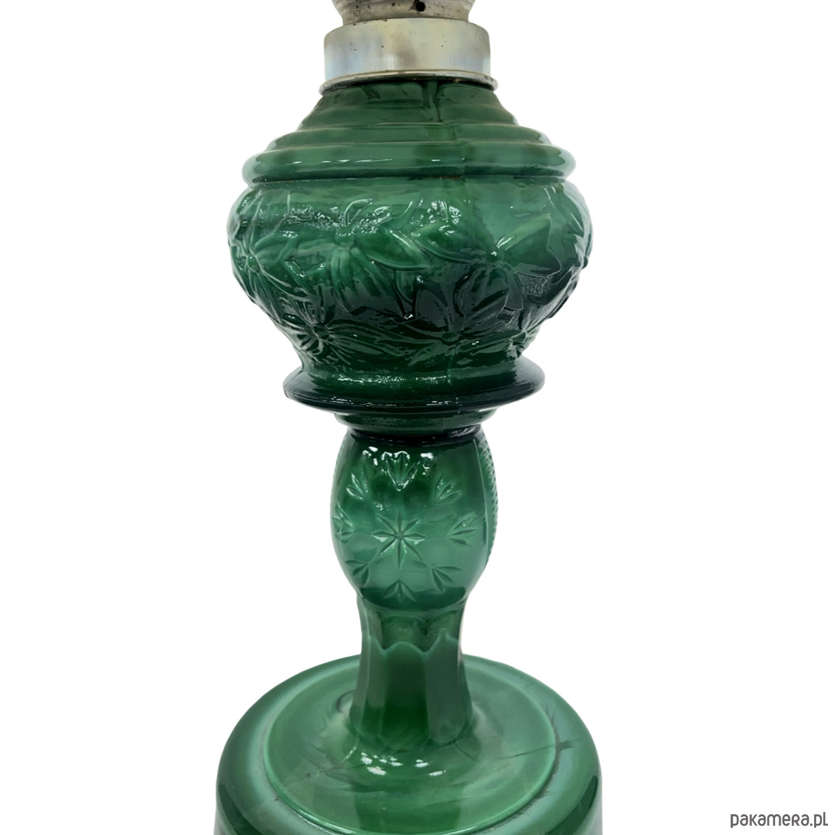 Elegancka lampa stołowa wykonana z dekoracyjnego szkła malachitowego o intensywnej, głębokiej zieleni. Forma nawiązuje do estetyki mid-century modern, charakterystycznej dla czechosłowackiego wzornictwa lat 60. XX wieku.
