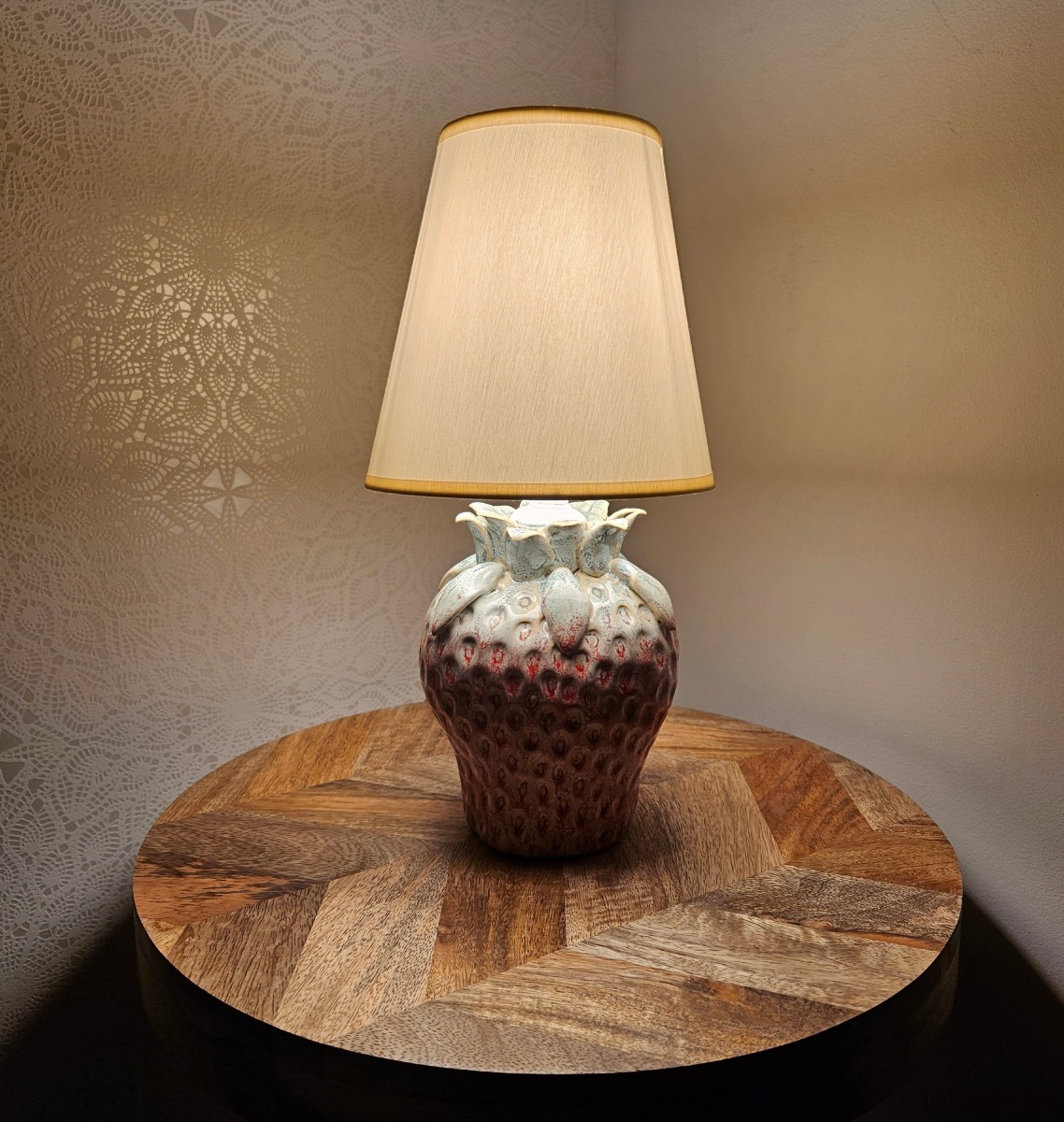 Ta niezwykła lampa stołowa powstała z artystycznie wykonanego wazonu z kamionki w formie truskawki, który został ręcznie przerobiony na funkcjonalne i jedyne w swoim rodzaju źródło światła. Każdy detal – od rzeźbionych liści po charakterystyczną fakturę owocu – nadaje jej niepowtarzalny charakter i sprawia, że stanowi efektowną ozdobę każdego wnętrza.
