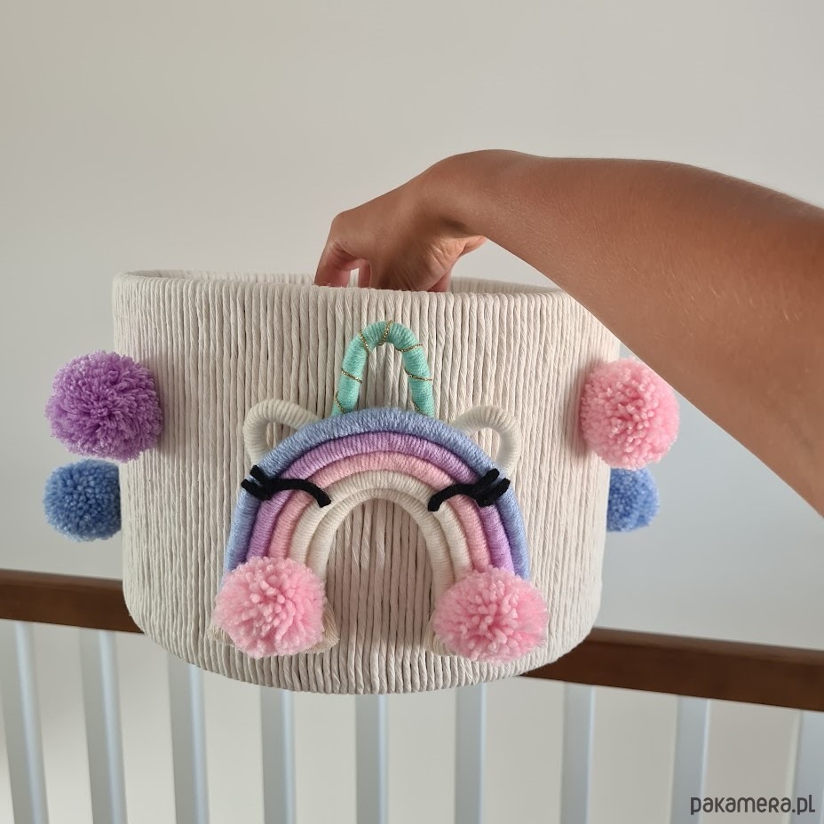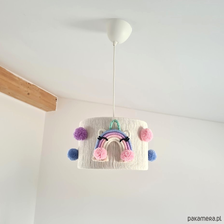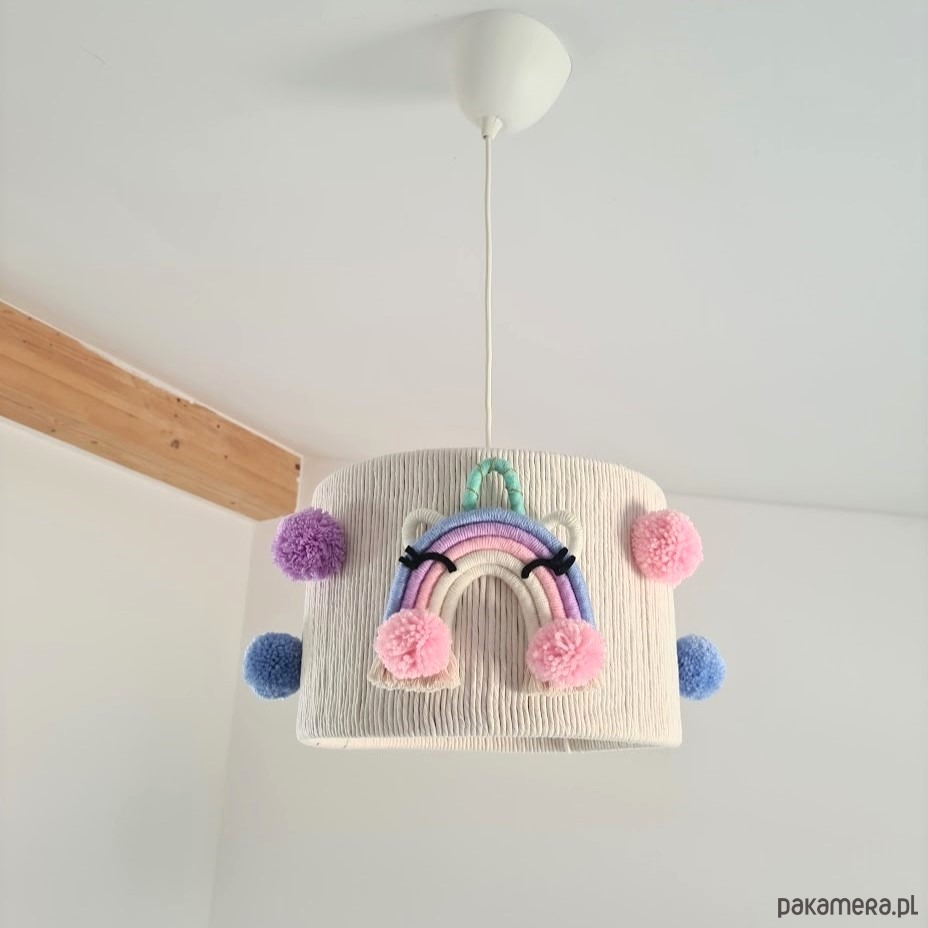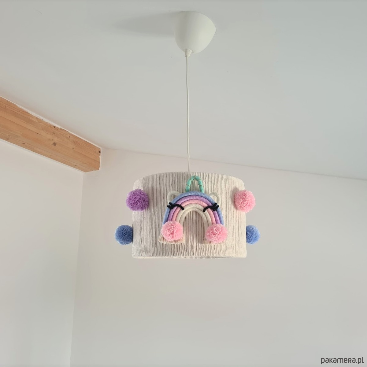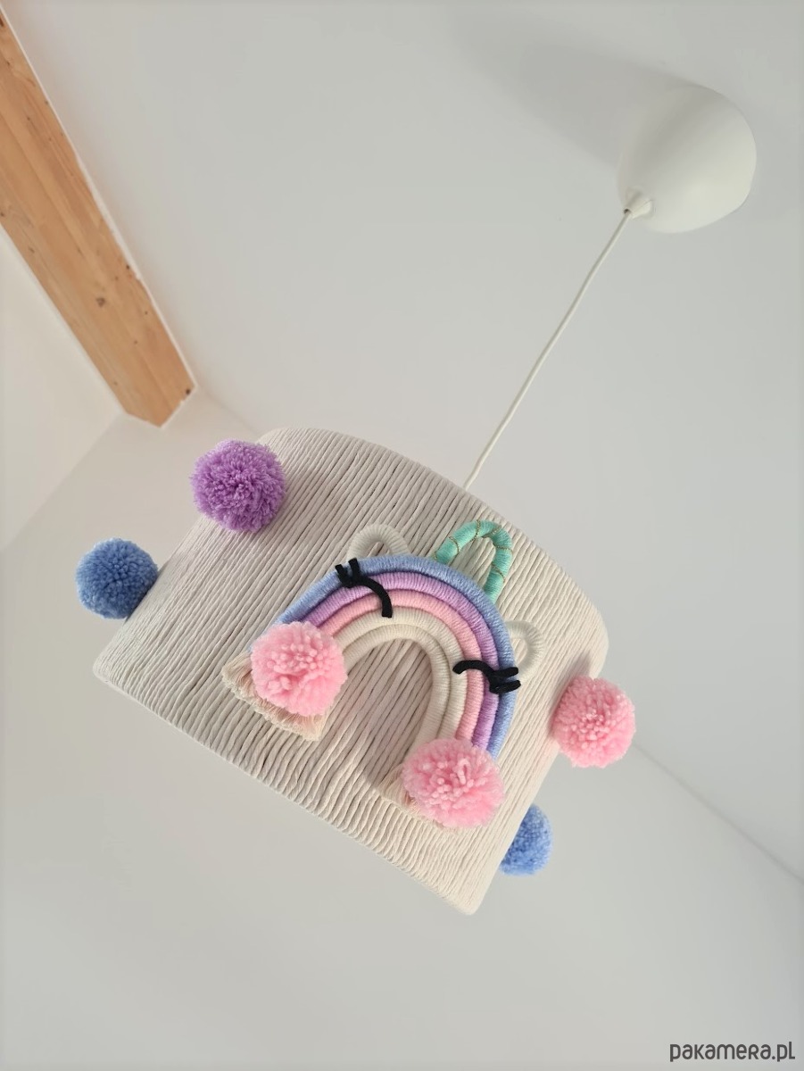 Nadaj unikalnego charakteru ozdobnym kloszem w stylu makramy ozdobionego dwoma dużymi Jednorożcami w oraz sześcioma puszystymi i kolorowymi pomponami.Ta orginalna i autorska lampa dziewczęca w ciagu dnia bedzie stanowić piekną ozdobę pokoju dziewczynki wieczorem zaś posłyży jako główne źródło światła i tym samym wspaniale rozświetli pokoik.