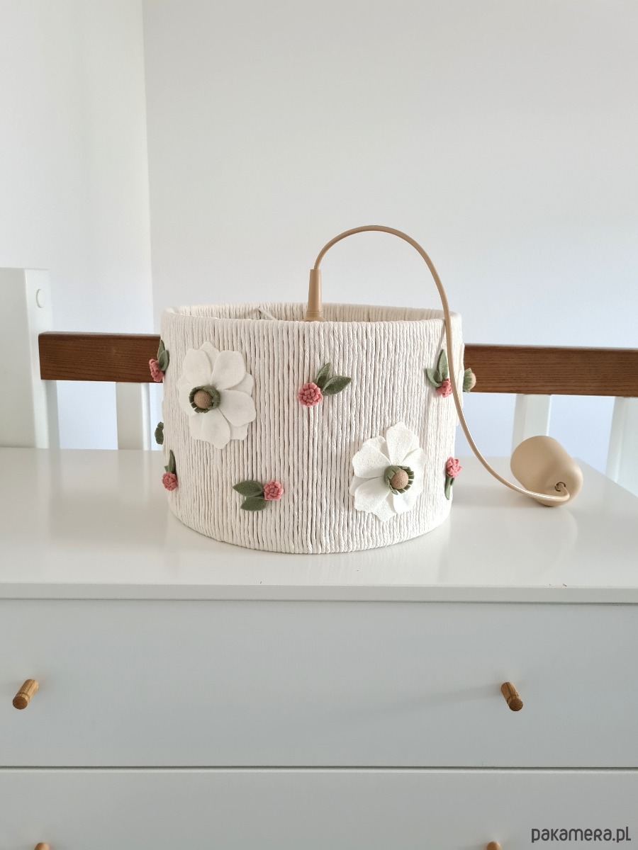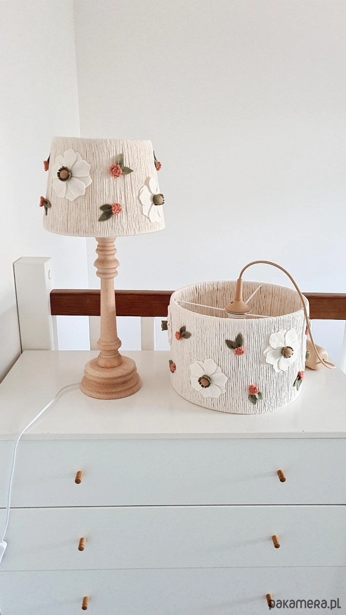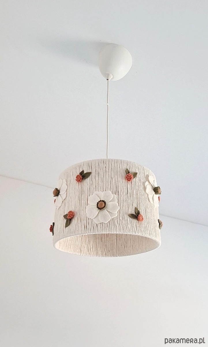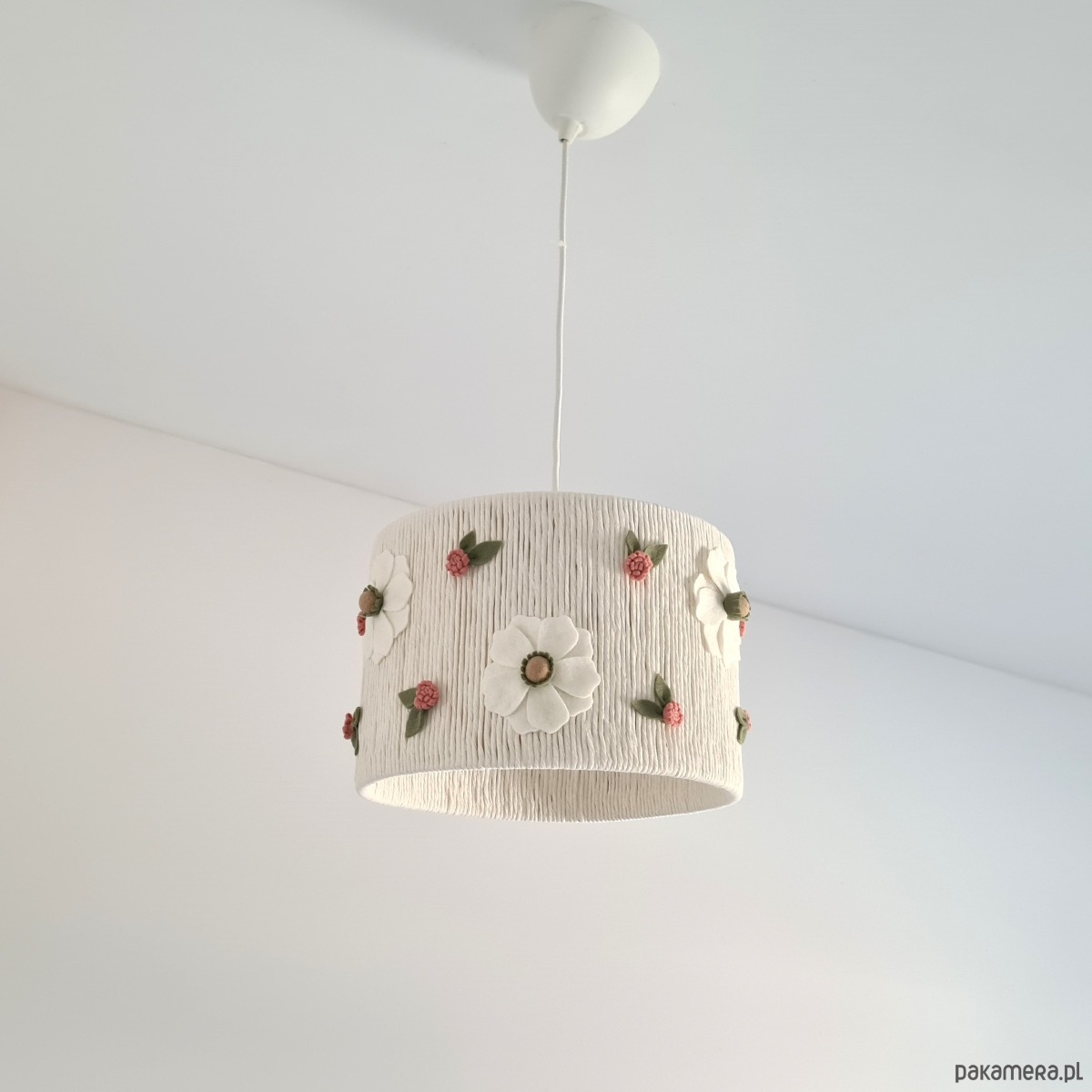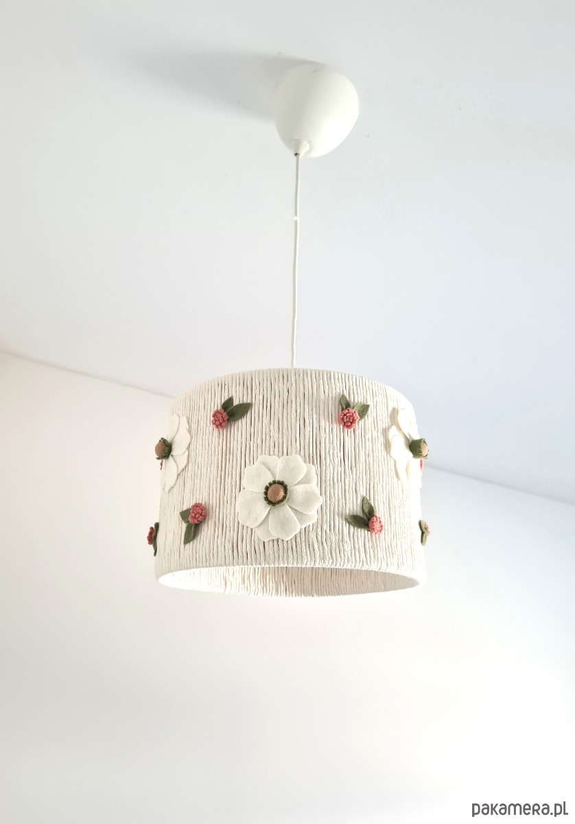 Abażur wykonany z naturalnych materiałów, zdobiony ręcznie tworzonymi kwiatami i listkami, idealnie wpisuje się w styl boho, skandynawski i retro.