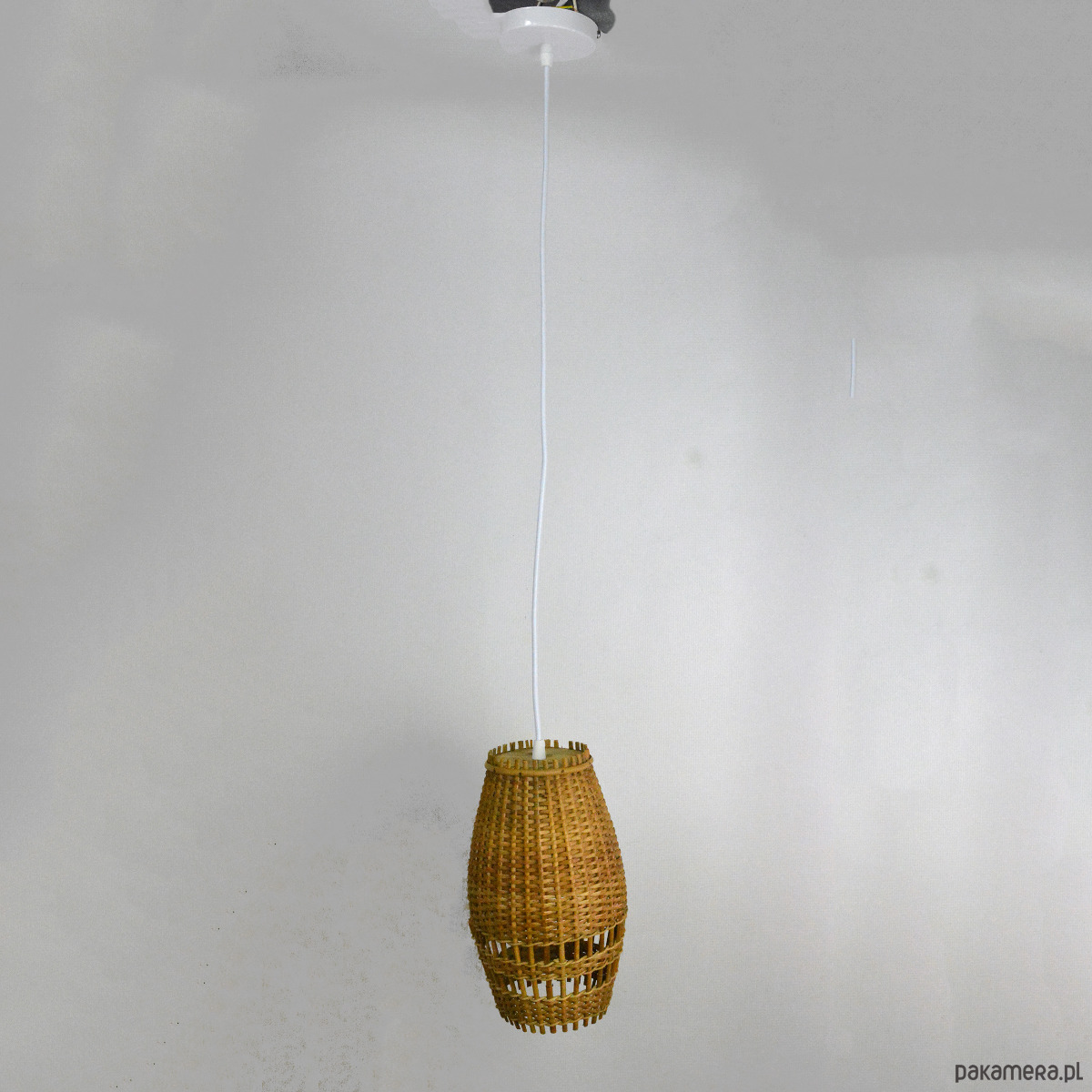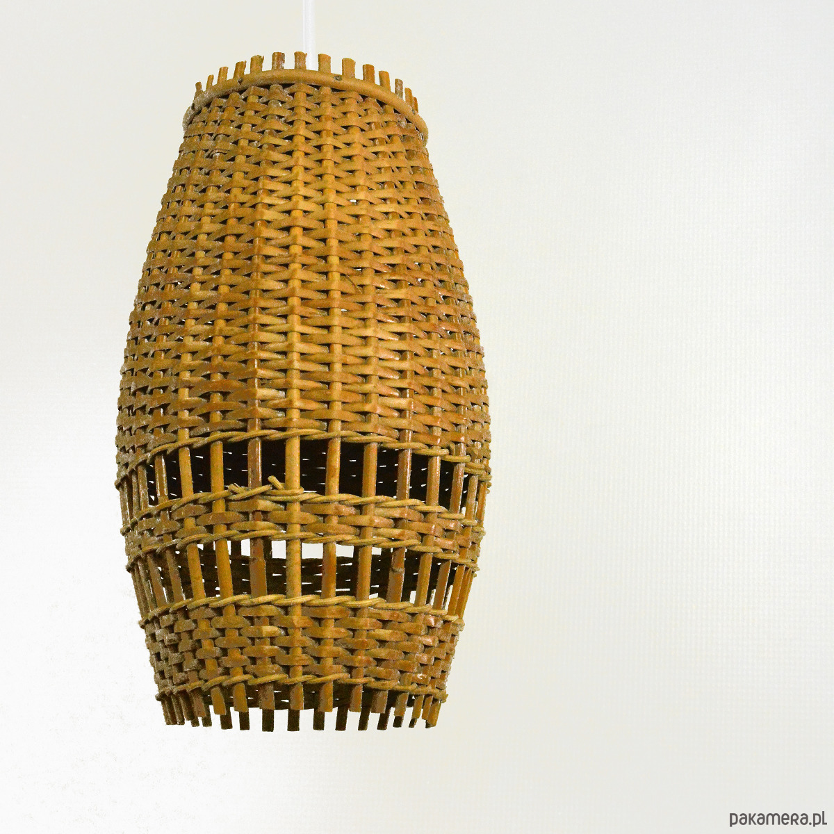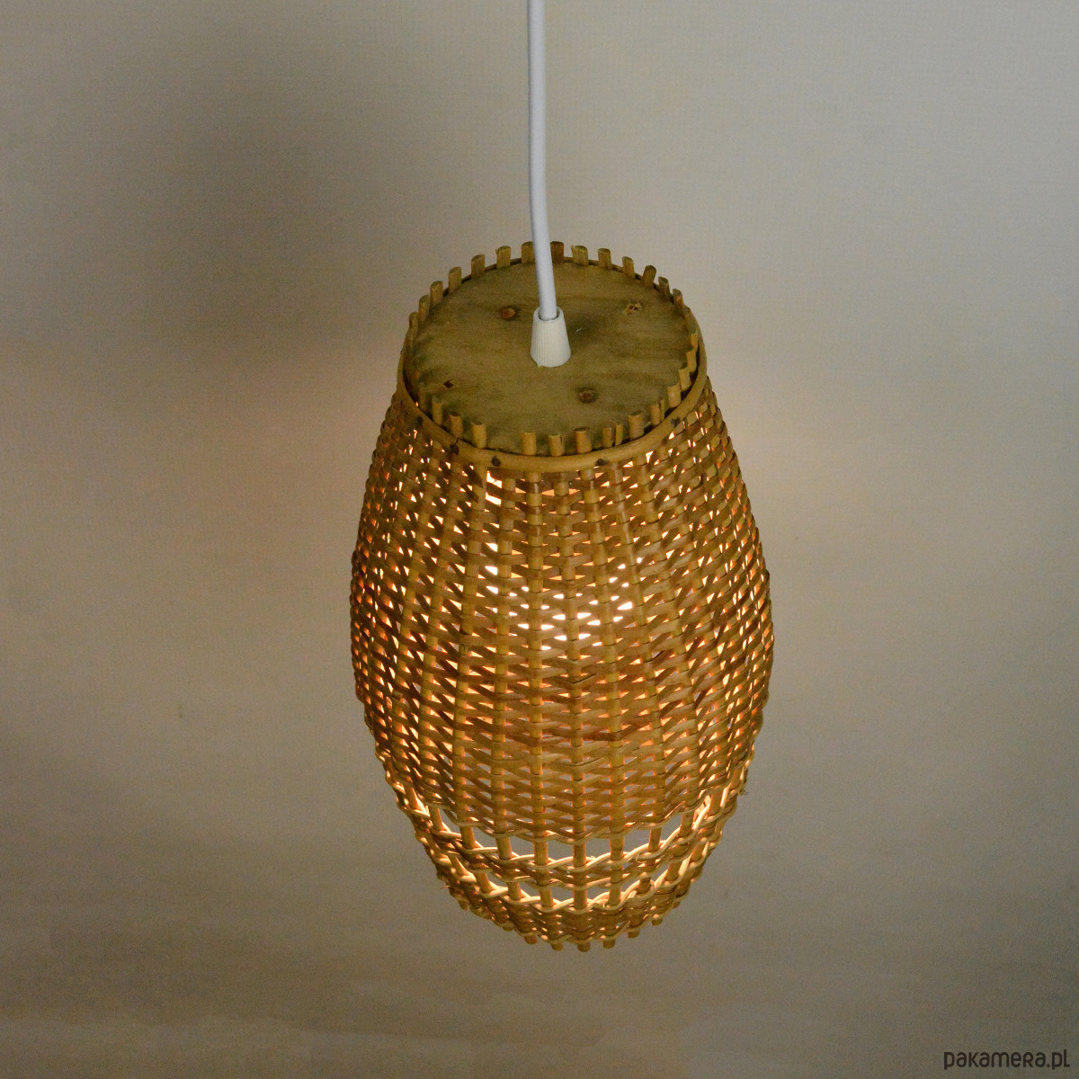 Lampa sufitowa w stylu skandynawskiego modernizmu wyprodukowana w Danii w latach 60. Żyrandol z kloszem wiklinowym i białym okablowaniem podsufitka z tworzywa sztucznego. Lampa na pojedynczą żarówkę E27 do 60W instalacja została wymieniona na nową. Stan zachowania oryginalny dobry, wiklina cała, lekko spatynowana. Przedmiot nosi niewielkie ślady użytkowania. Wysokość można swobodnie regulować, podana wielkość to wysokość maksymalna.