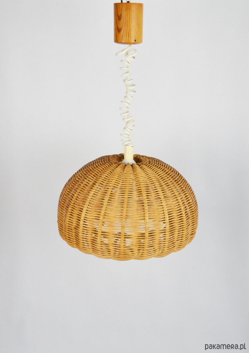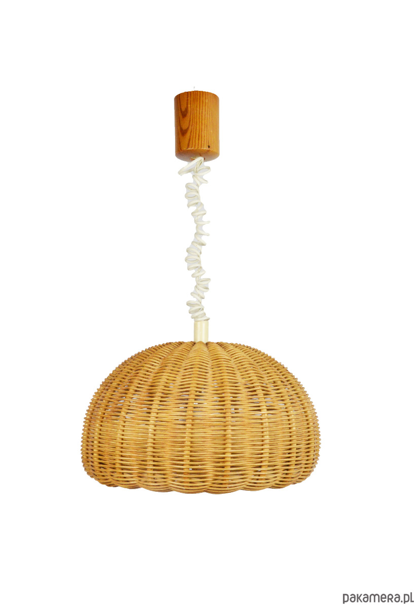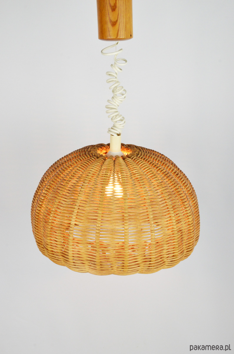 Wiklinowa lampa wisząca z regulacją z lat 70. Stan zachowania dobry, brak ubytków w wiklinie, jedynie system podciągania ma nieregularny kształt wynikający z użytkowania - w pełni sprawny.