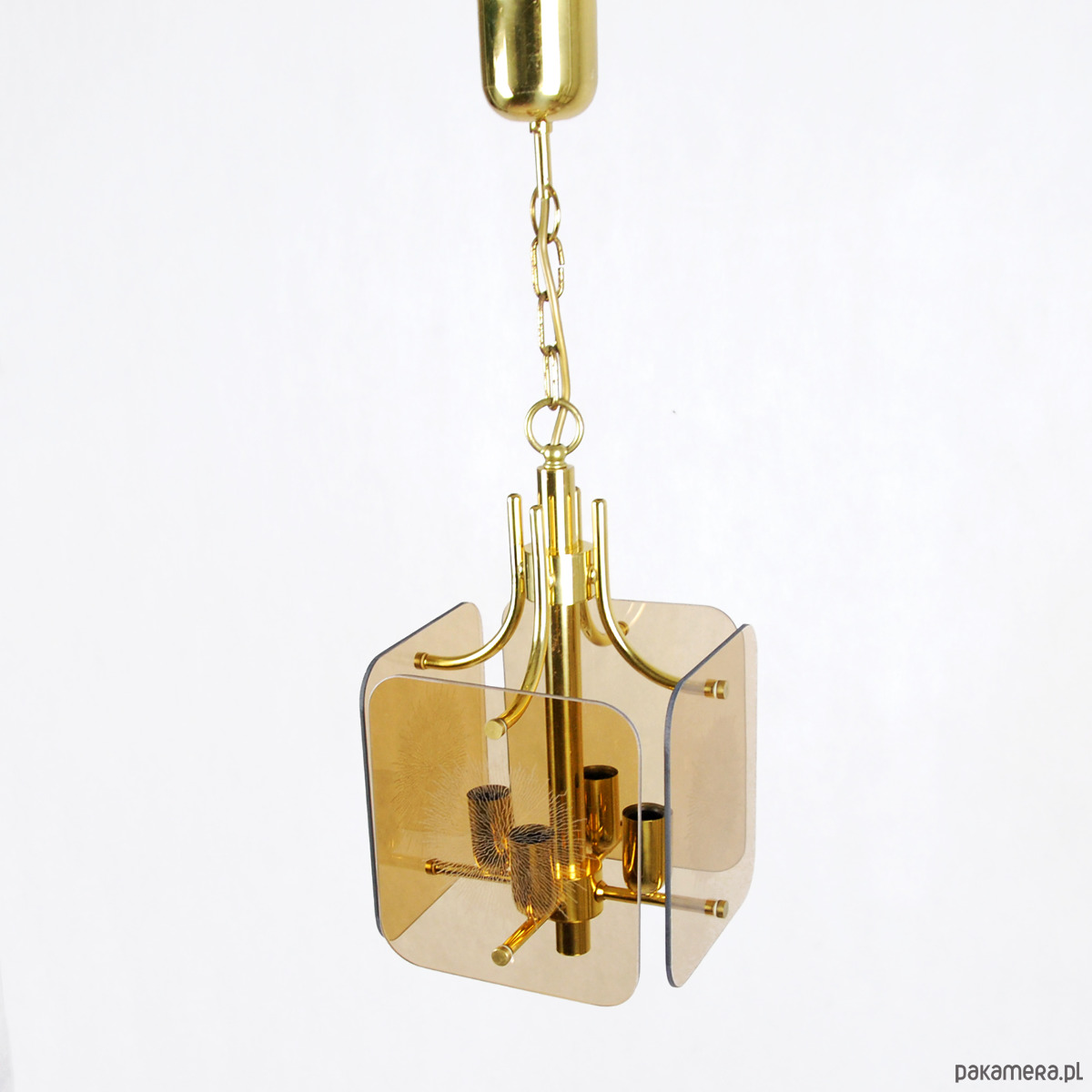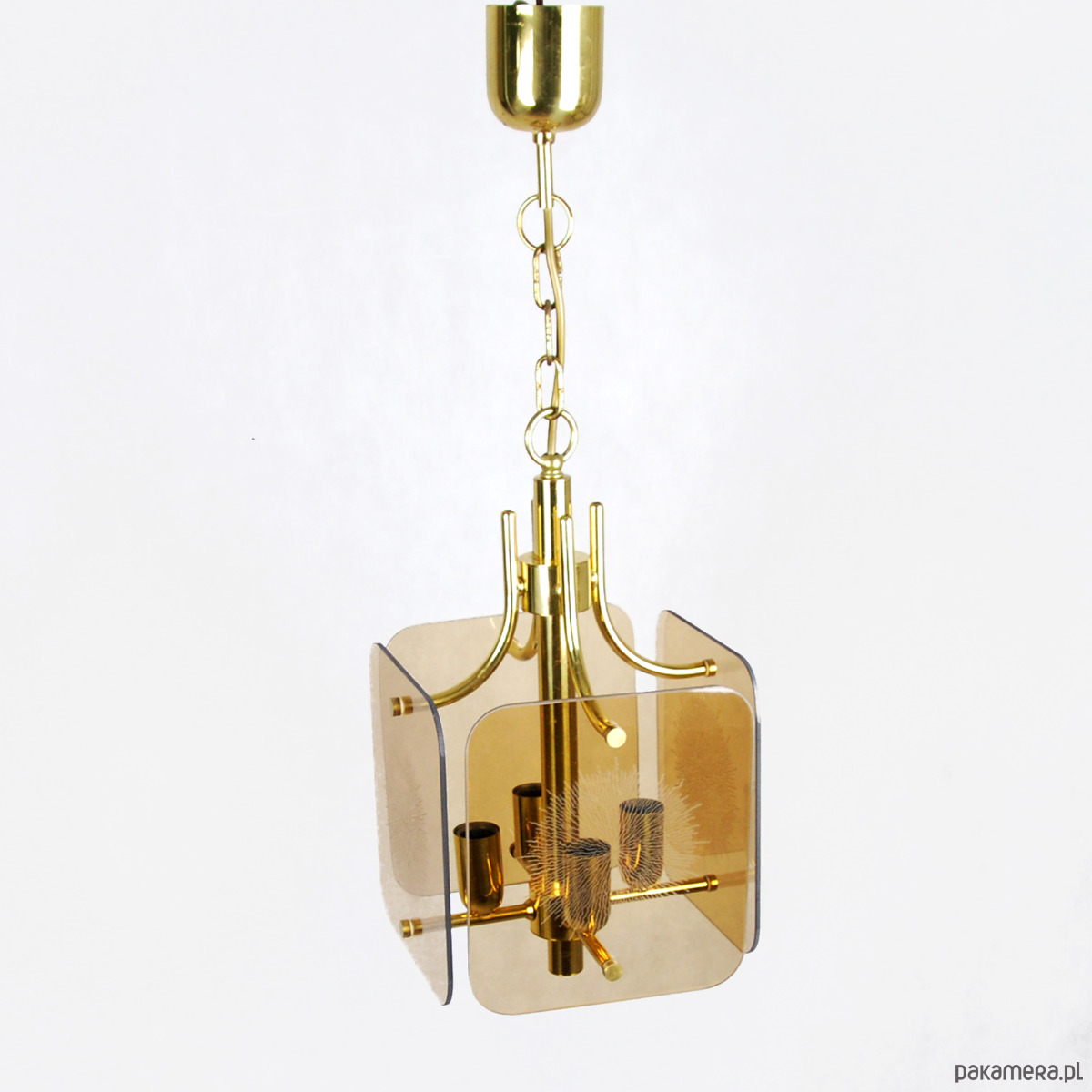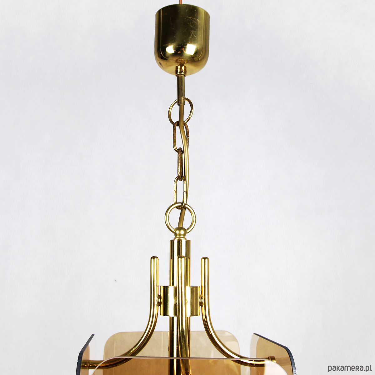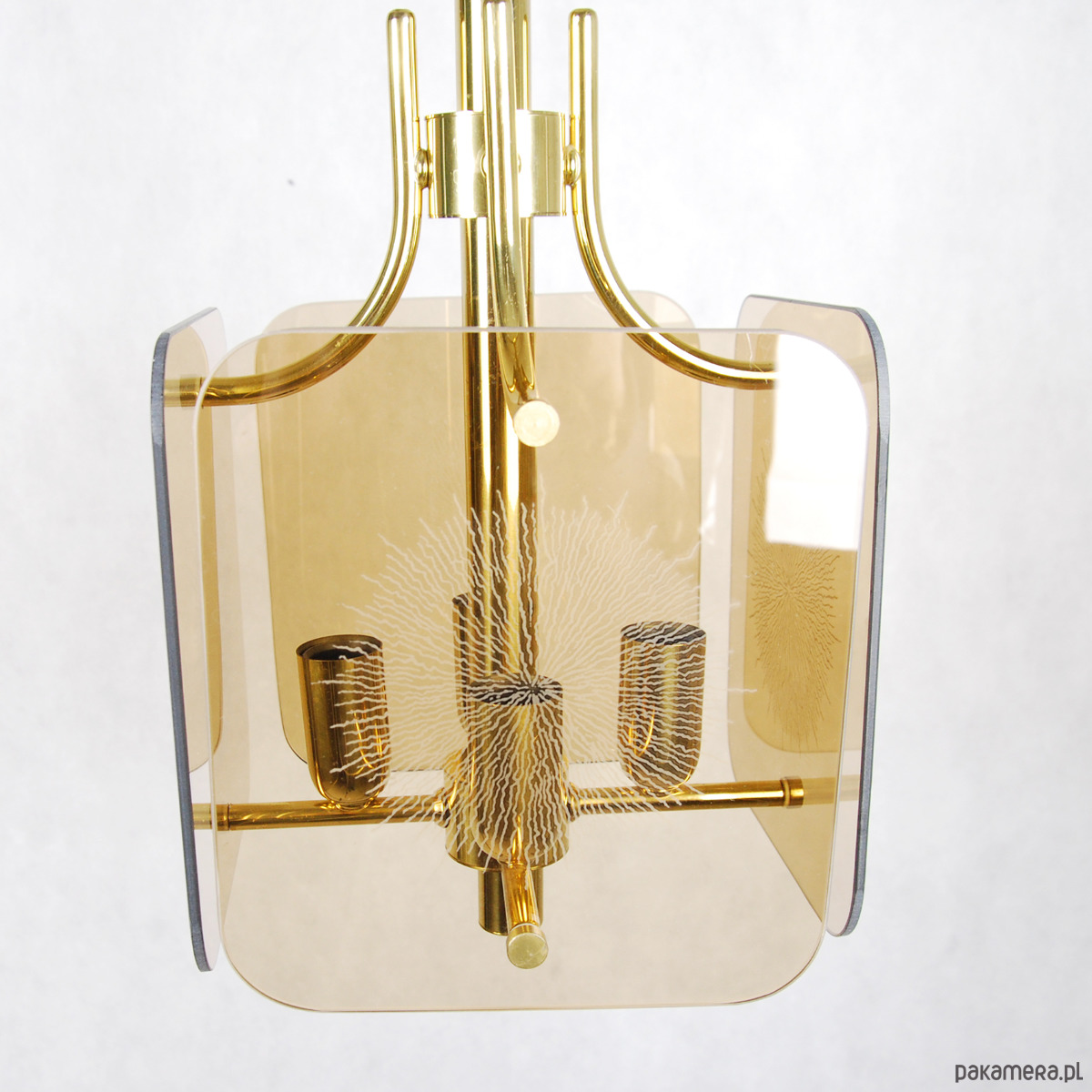 Żyrandol lampa sufitowa typ 55523 z lat 80. zaprojektowana przez Luigi Colani dla JSB Leuchten. Wykonana z mosiądzu i dymionego szkła z dekoracyjnymi rytami. Stan bardzo dobry, utlenienia mosiądzu i niewielkie rysy na części mosiężnej. Lampa sprawna, o czterech punktach świetlnych, każdy na pojedynczą żarówkę E14 do 60W. Na innej naszej aukcji oferujemy jeszcze kinkiet z tego kompletu.Lampa sygnowana.Wymiary:wysokość 64 cm | szerokość 21 cm | wysokość klosza 35 cm
