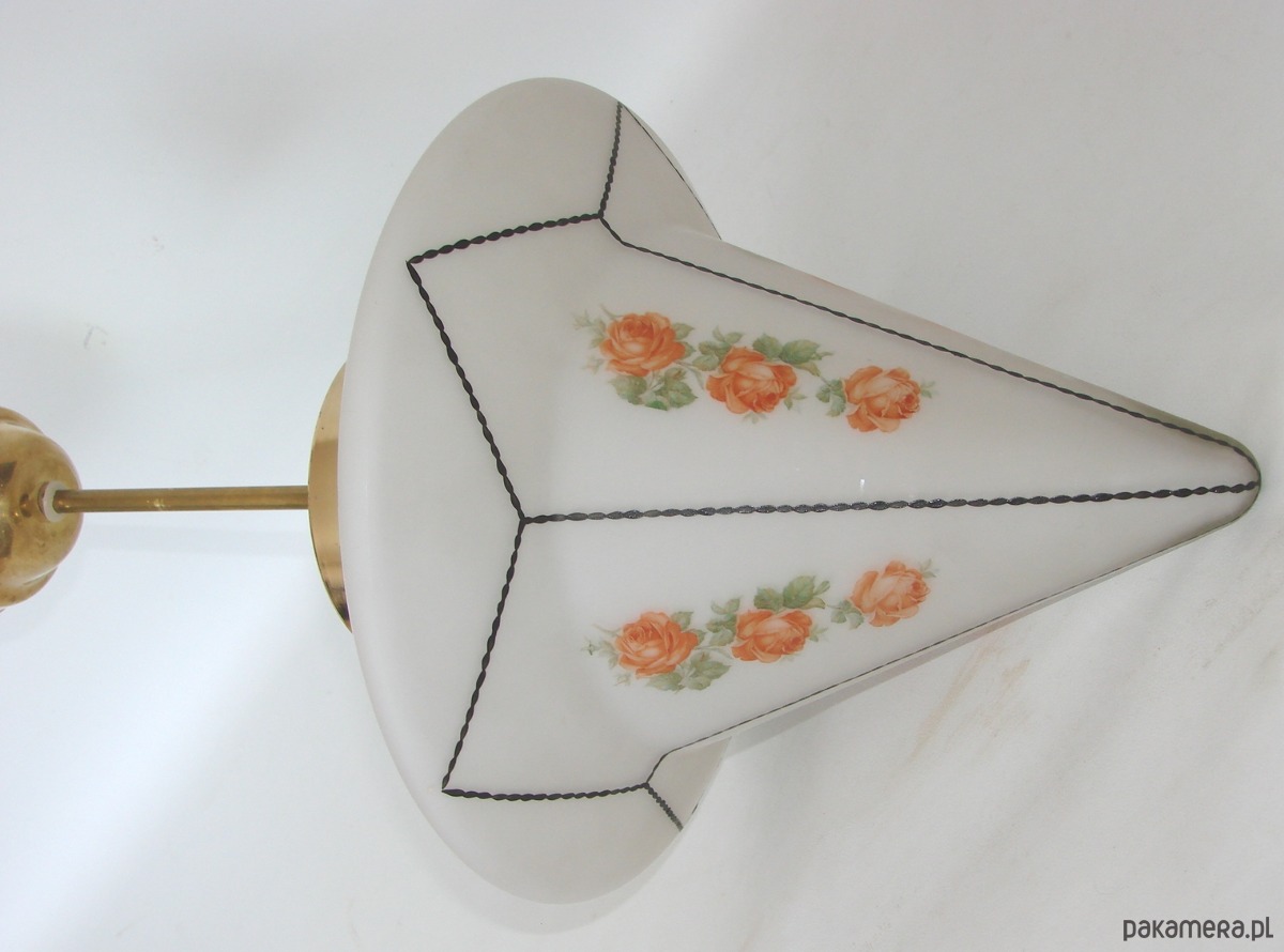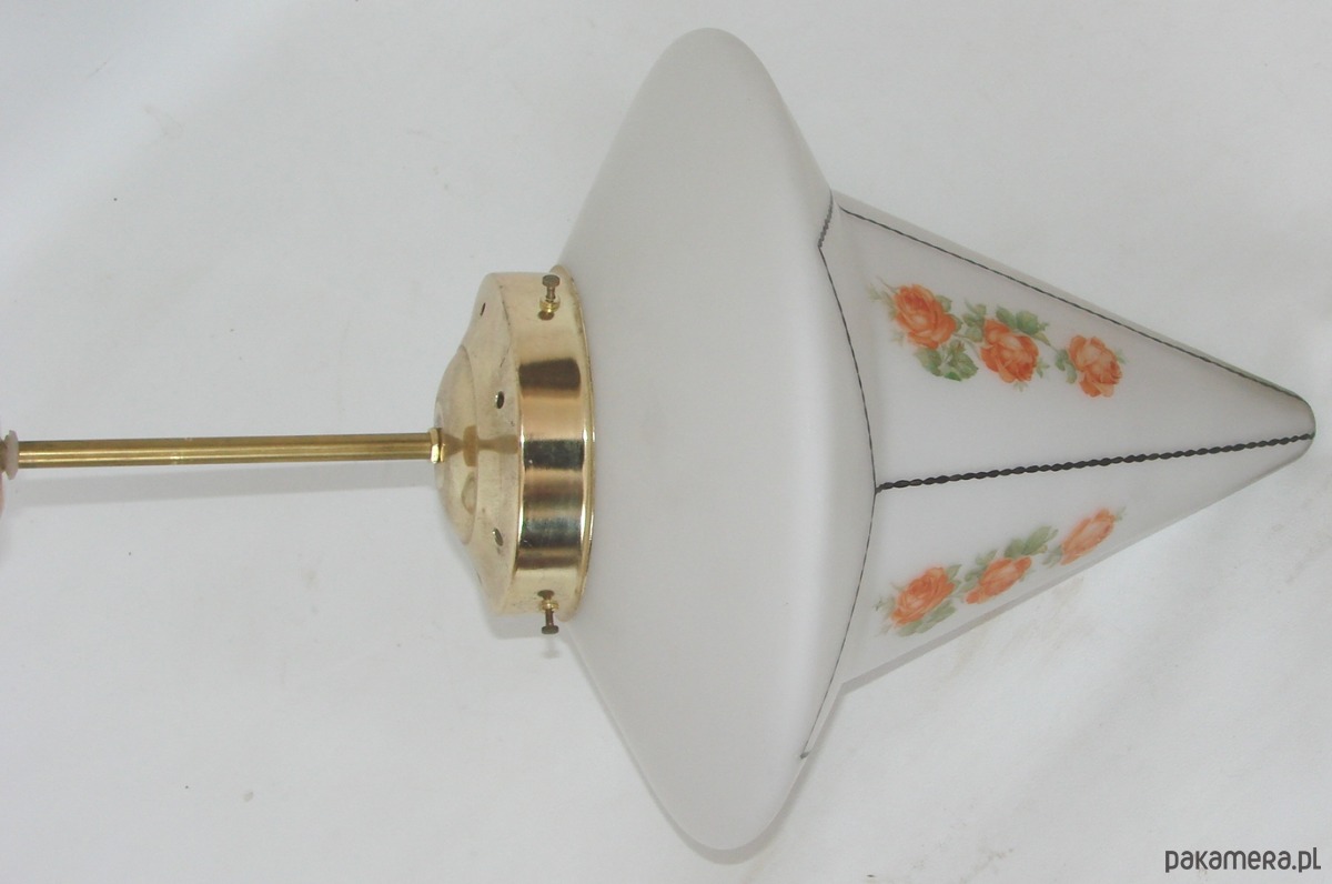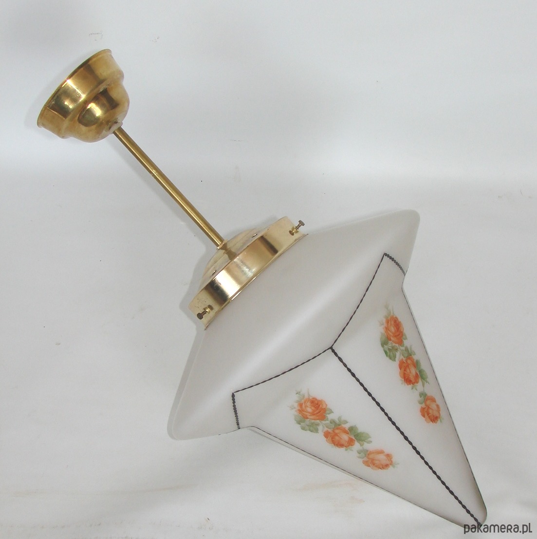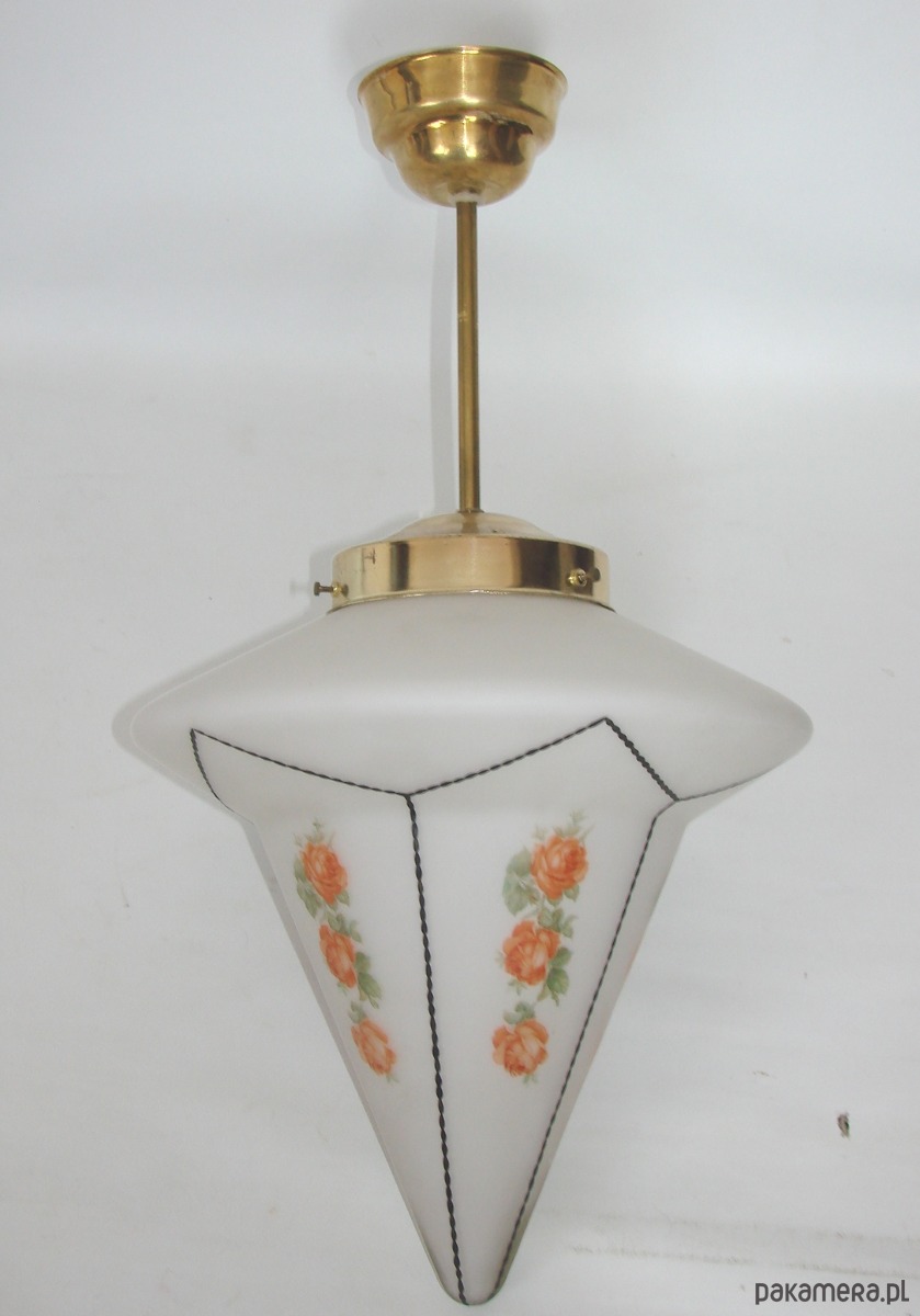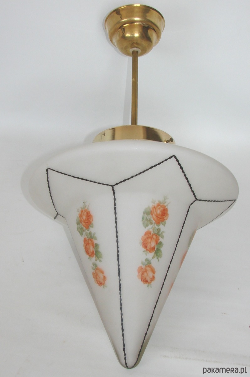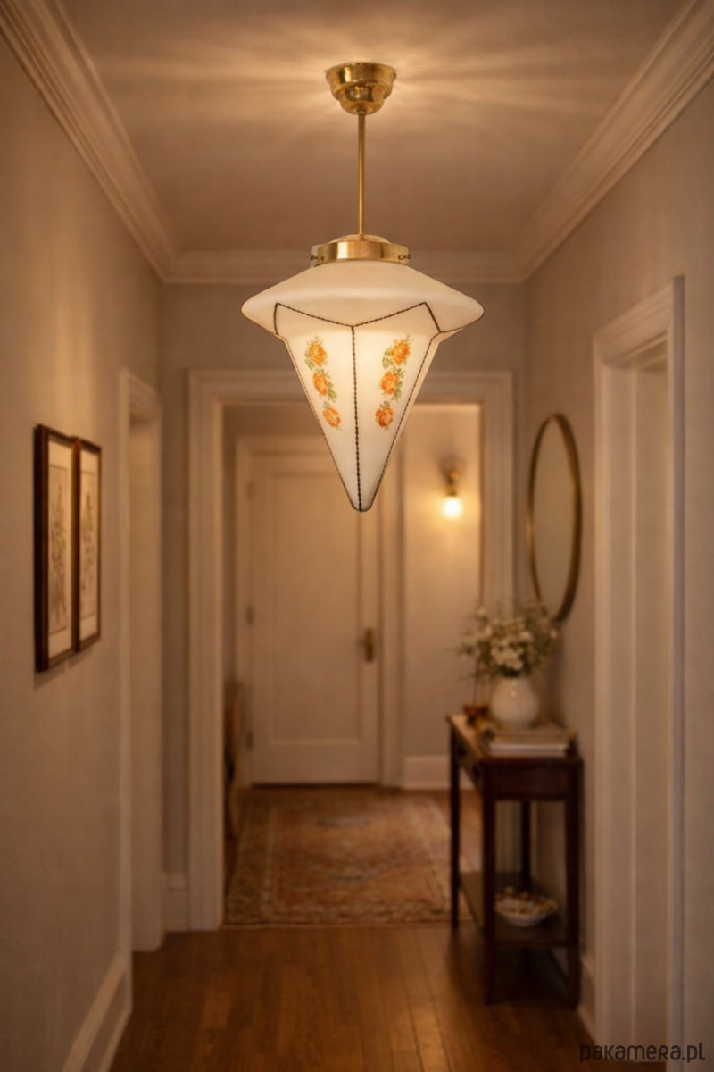 Wyjątkowa lampa wisząca w stylu Art Deco, pochodząca z lat 20. XX wieku. Konstrukcja wykonana z mosiądzu, uzupełniona kloszem ze szkła ręcznie malowanego. Charakterystyczna forma i dekoracyjne detale oddają elegancję oraz kunszt wzornictwa okresu międzywojennego.