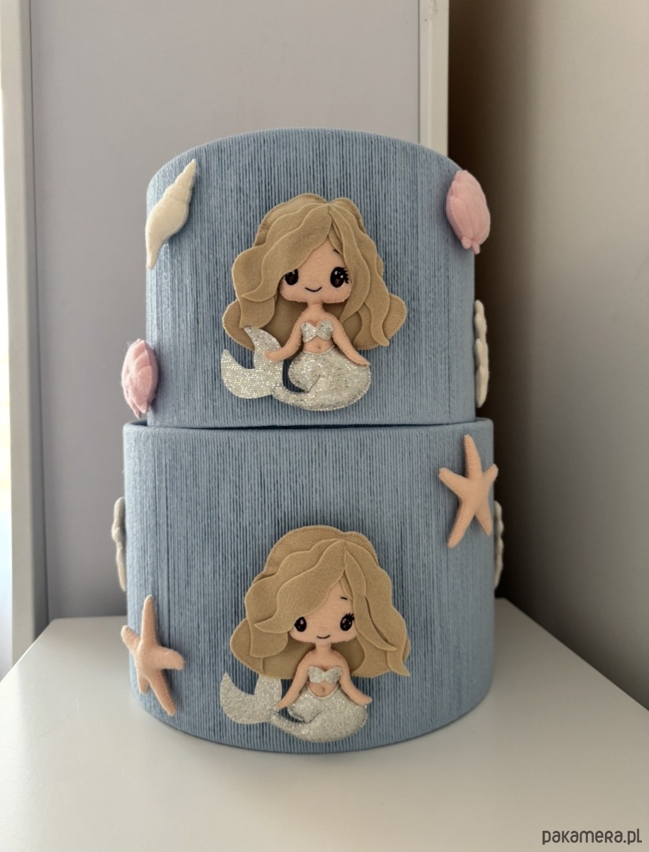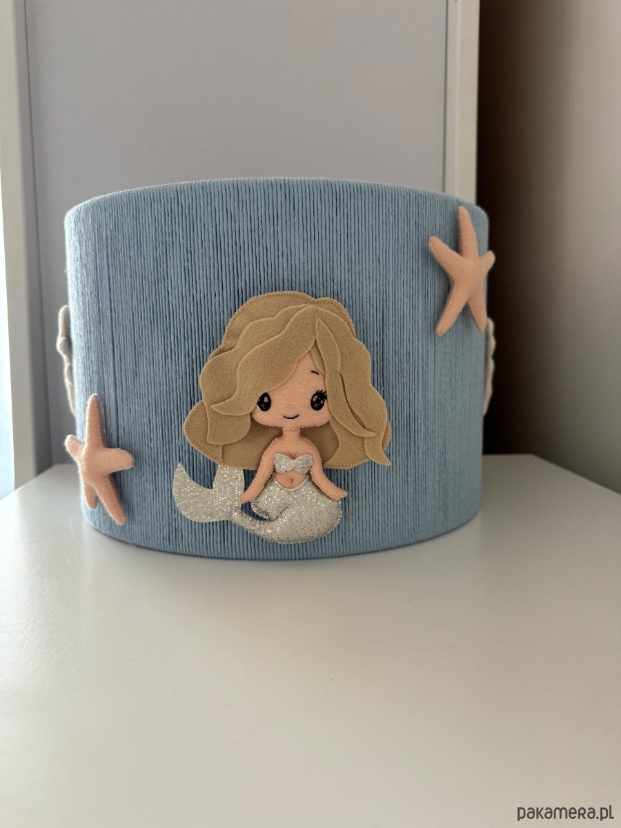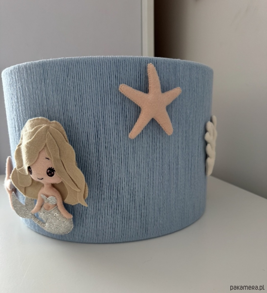 Wprowadź odrobinę bajkowej magii do wnętrza dzięki temu wyjątkowemu kloszowi ozdobionemu delikatną, ręcznie wykonaną syrenką z filcu. Pastelowy, błękitny materiał w połączeniu z subtelnymi, morskimi detalami tworzy spokojną i przytulną atmosferę – idealną do pokoju dziecka.