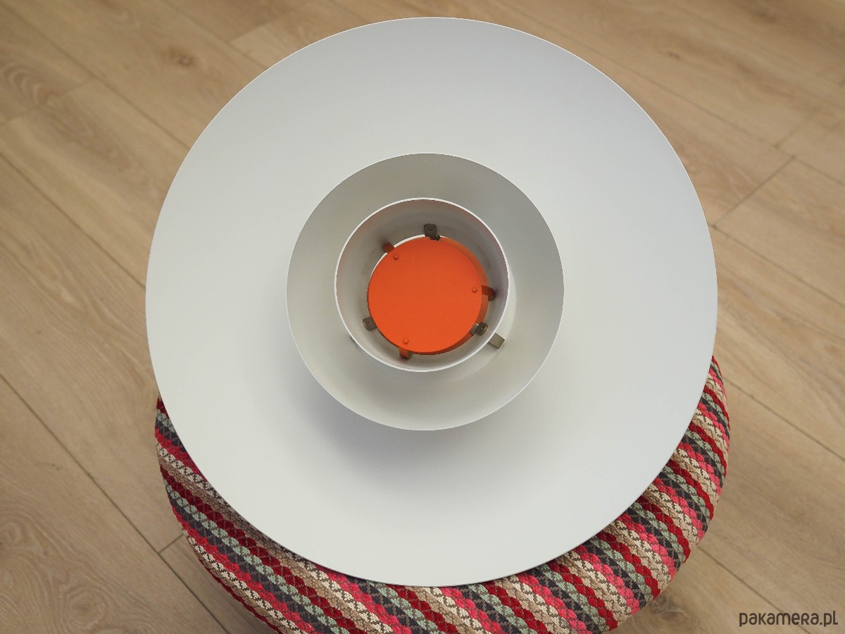 Wykonana z metalu w kolorze białym. Talerzowa konstrukcja nie jest tylko elementem designu, jej głównym założeniem jest rozproszenie światła w celu tworzenia przyjemnego nastroju wnętrza.