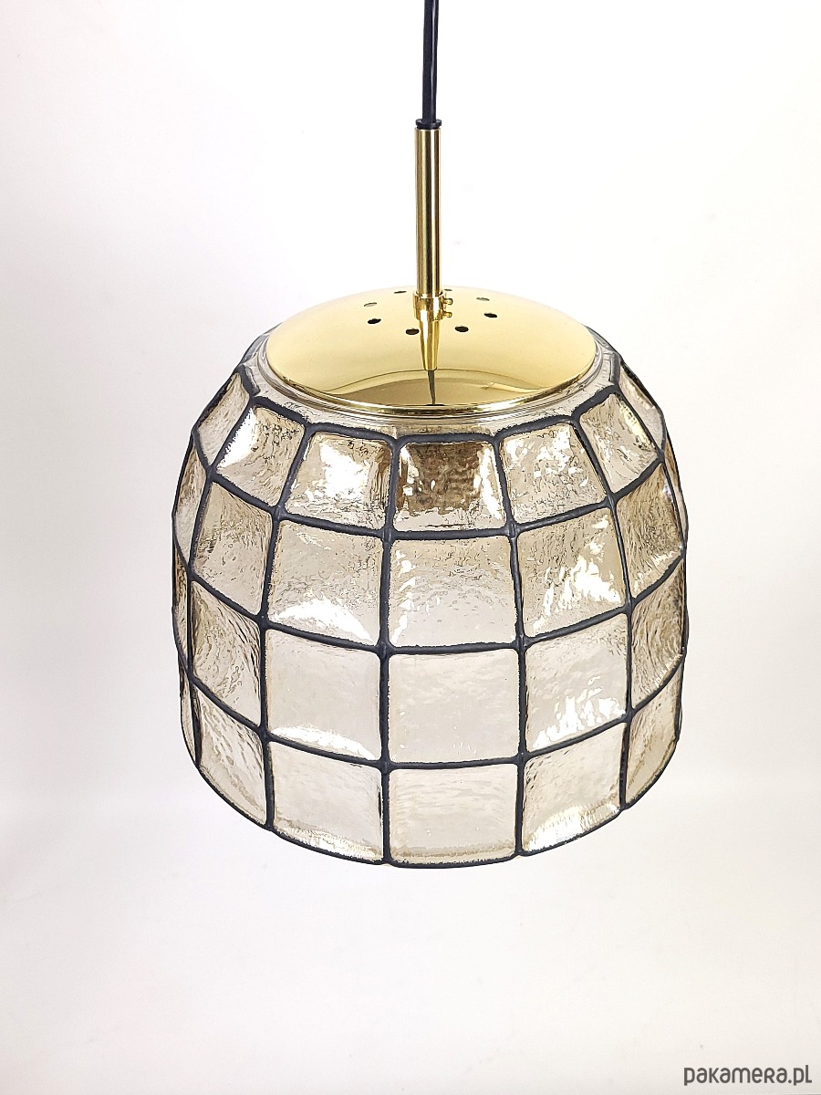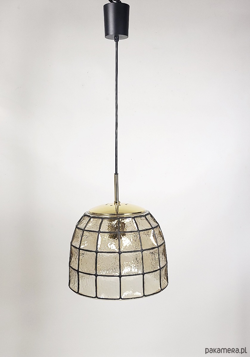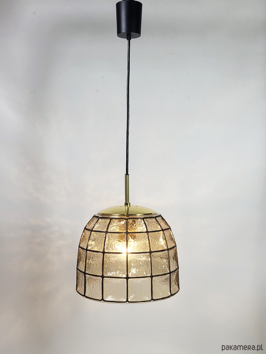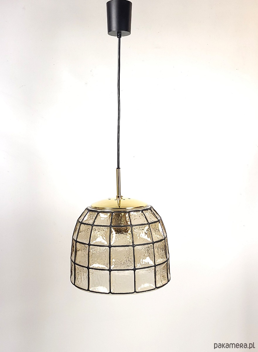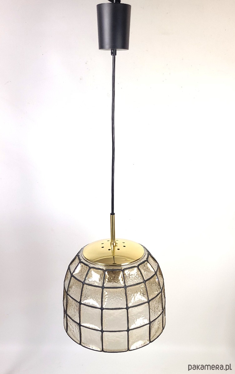 Duża lampa wisząca, Limburg Glashutte, Niemcy lata 70. Lampa składa się z mosieżnej części i szklanego klosza. Lampa w stanie bardzo dobrym, minimalne slady czasu. Lampa posiada długi kabel ,który umożliwia mocowanie lampy na wybranej wysokości.