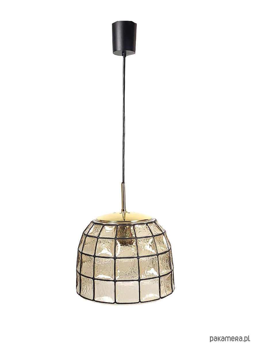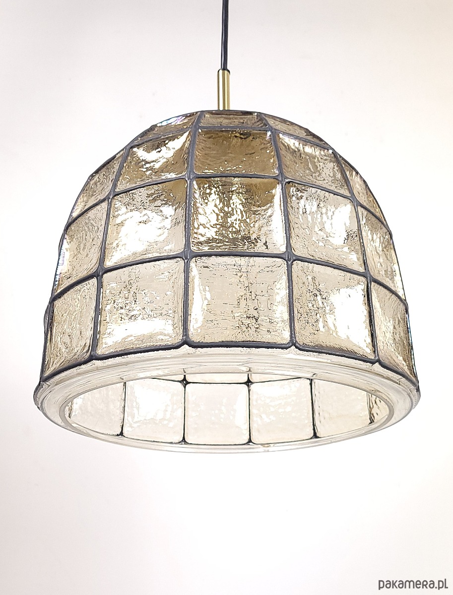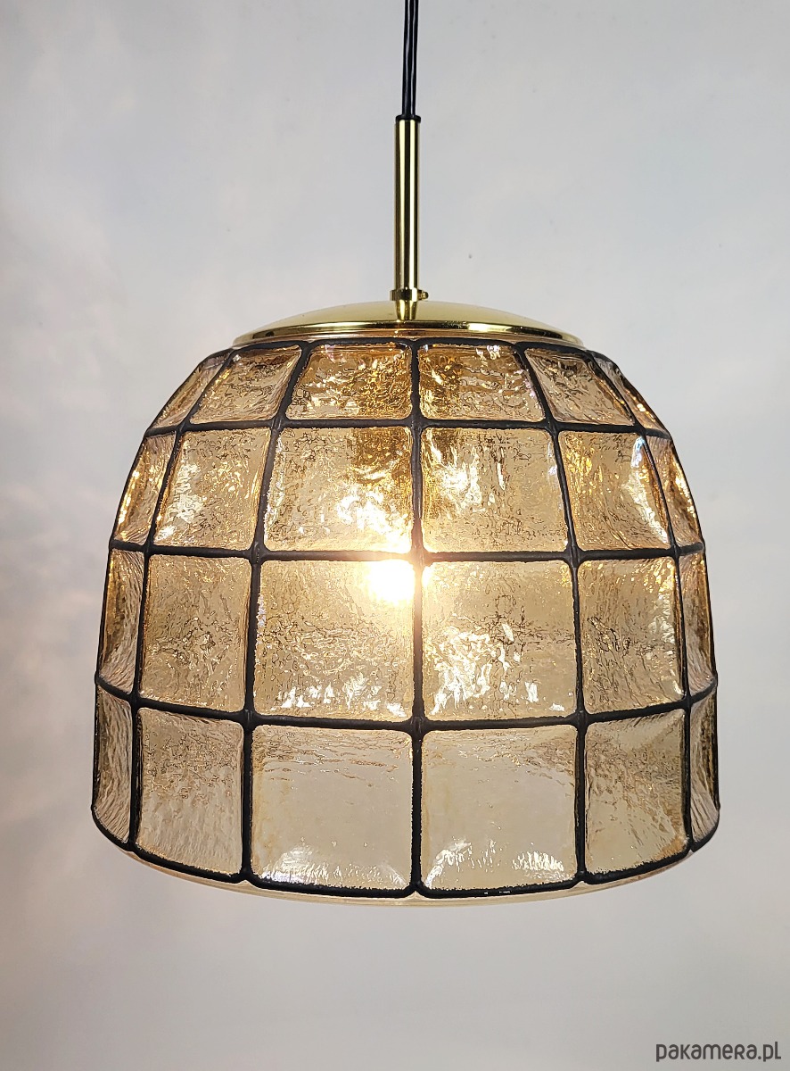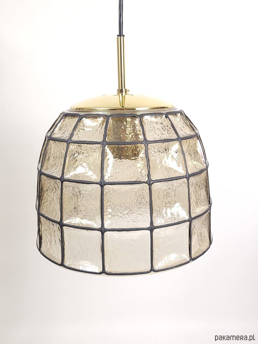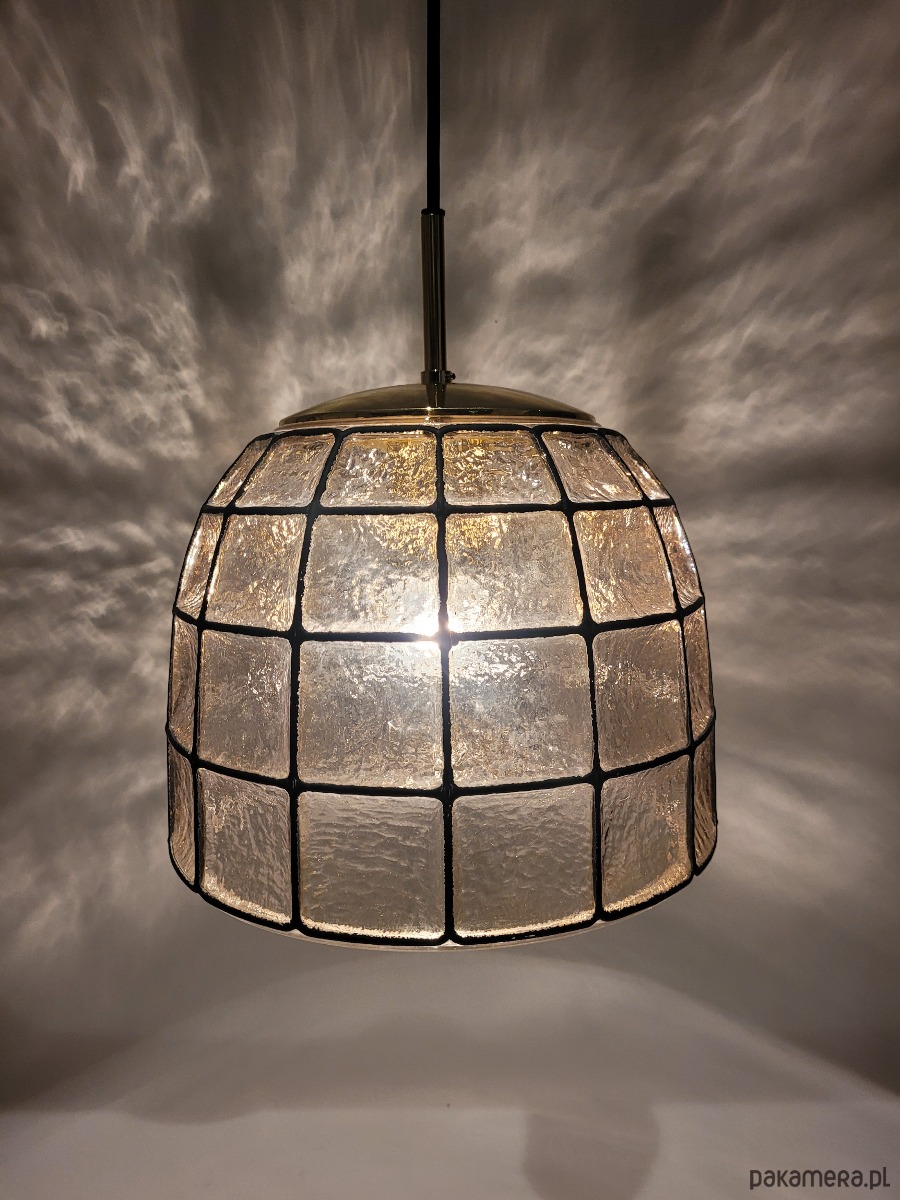 Duża lampa wisząca, Limburg Glashutte, Niemcy lata 70. Lampa składa się z mosieżnej części i szklanego klosza. Lampa w stanie bardzo dobrym, minimalne slady czasu. Lampa posiada długi kabel ,który umożliwia mocowanie lampy na wybranej wysokości.