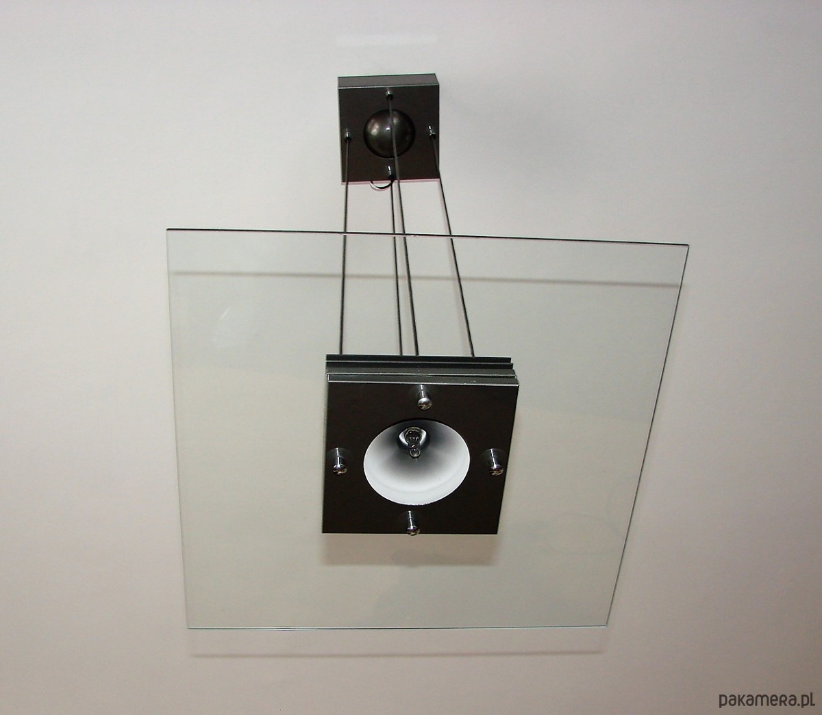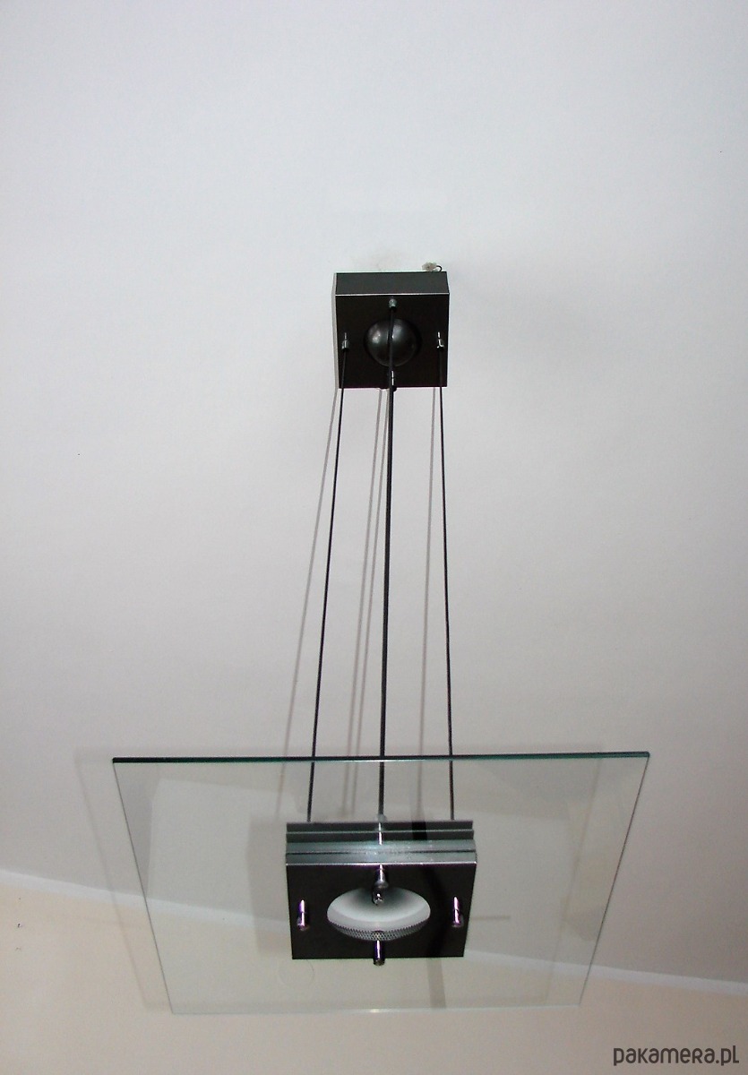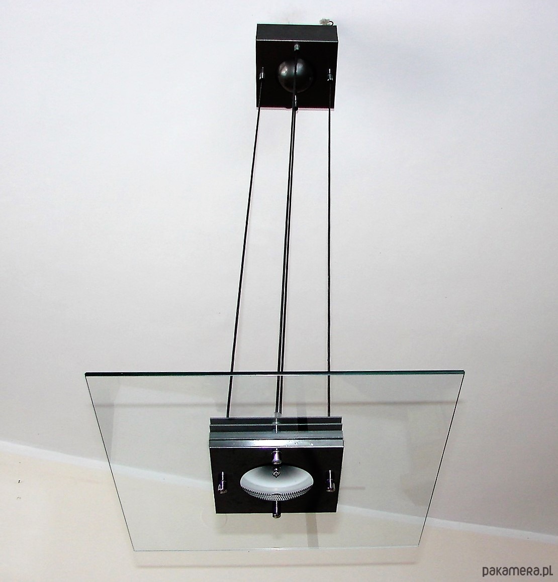 Elegancka lampa wisząca z lat 90 w stylu Modern – charakterystyczny przykład minimalistycznego, a zarazem efektownego wzornictwa końca XX wieku. Konstrukcja łączy solidny metalowy stelaż z dużym szklanym kloszem o wyraźnej formie geometrycznej.