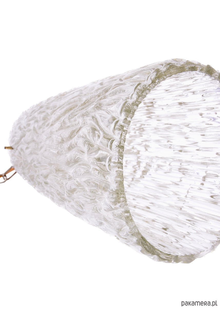 Lampa posiada cylindryczny klosz wykonany z grubego szkła o charakterystycznej, organicznej strukturze przypominającej lód lub korę drzewa – jest to rozpoznawalny motyw stosowany w projektach Fagerlunda. Dzięki temu światło rozprasza się miękko i efektownie, tworząc bardzo klimatyczne oświetlenie.