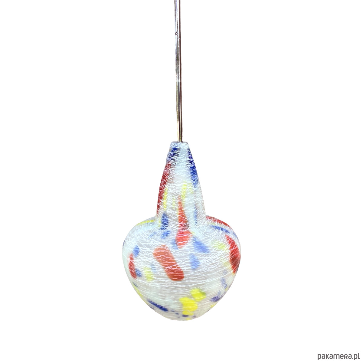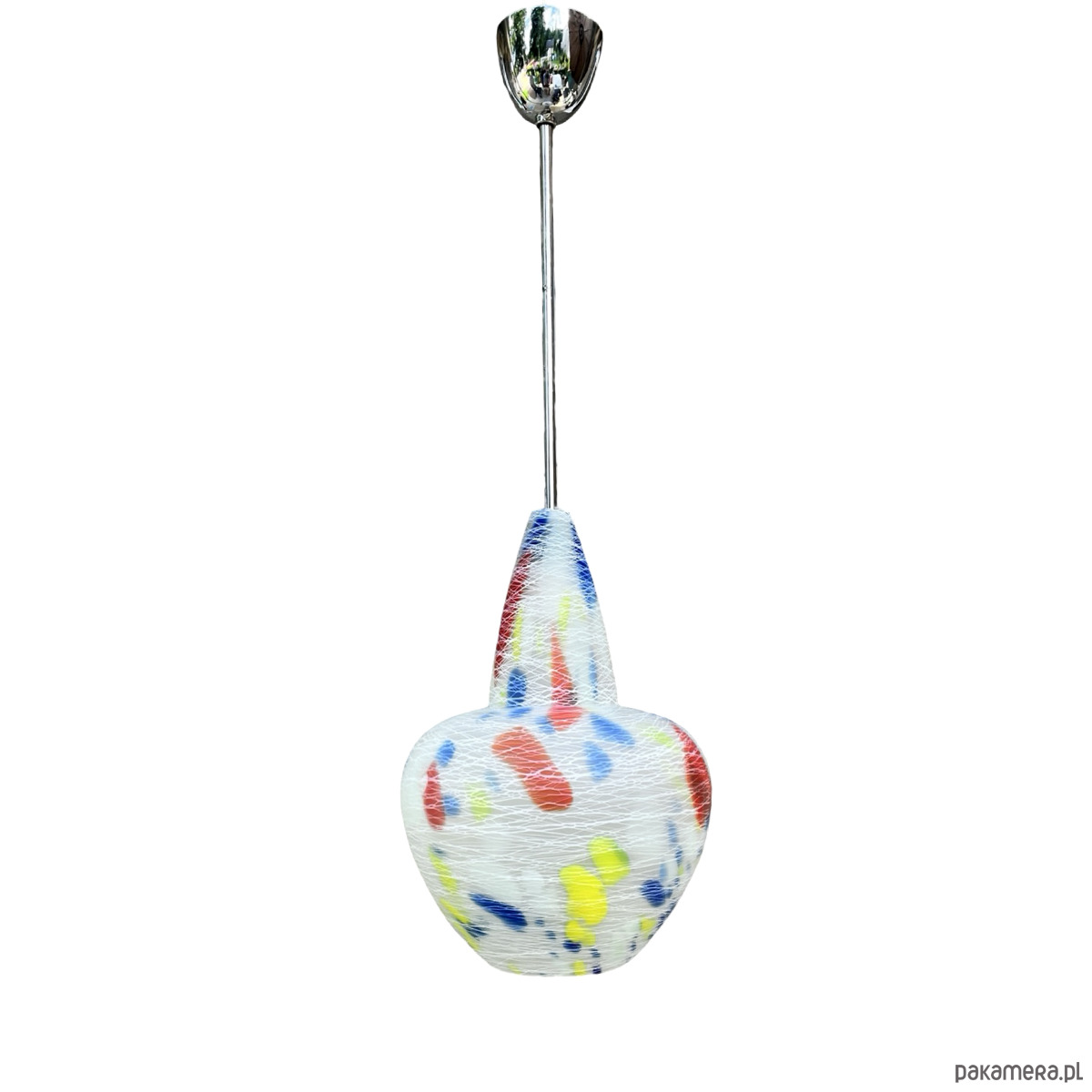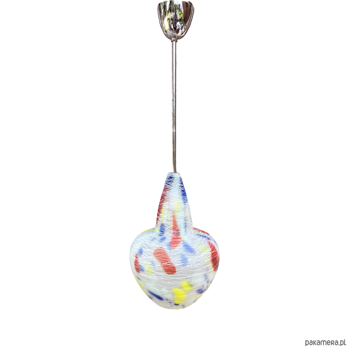 Wyjątkowa lampa wisząca zaprojektowana przez Jaroslav Antonin Junka dla czeskiej wytwórni Zukov w latach 60. Klosz wykonany ze szkła w stylu „Brusel” – ręcznie dekorowany techniką natrysku wybieranego, nadający każdemu egzemplarzowi unikatowy charakter. Kolorowe motywy (czerwień, błękit, żółć) osadzone na mlecznej, spękanej powierzchni „crackle” tworzą wyjątkowy, plastyczny efekt po zapaleniu żarówki.