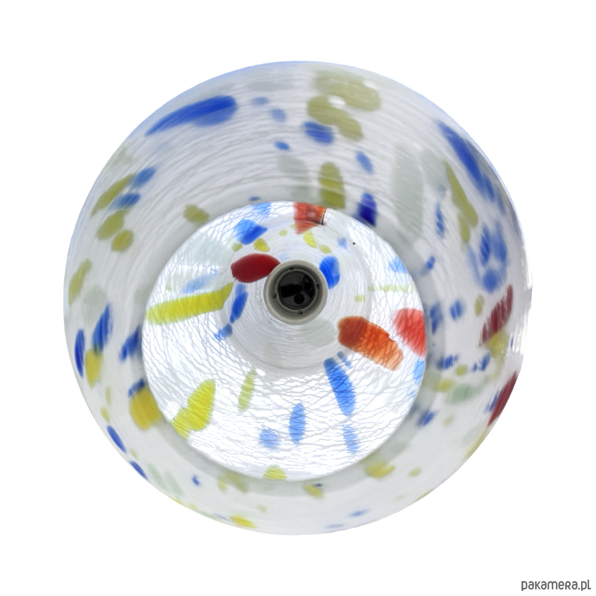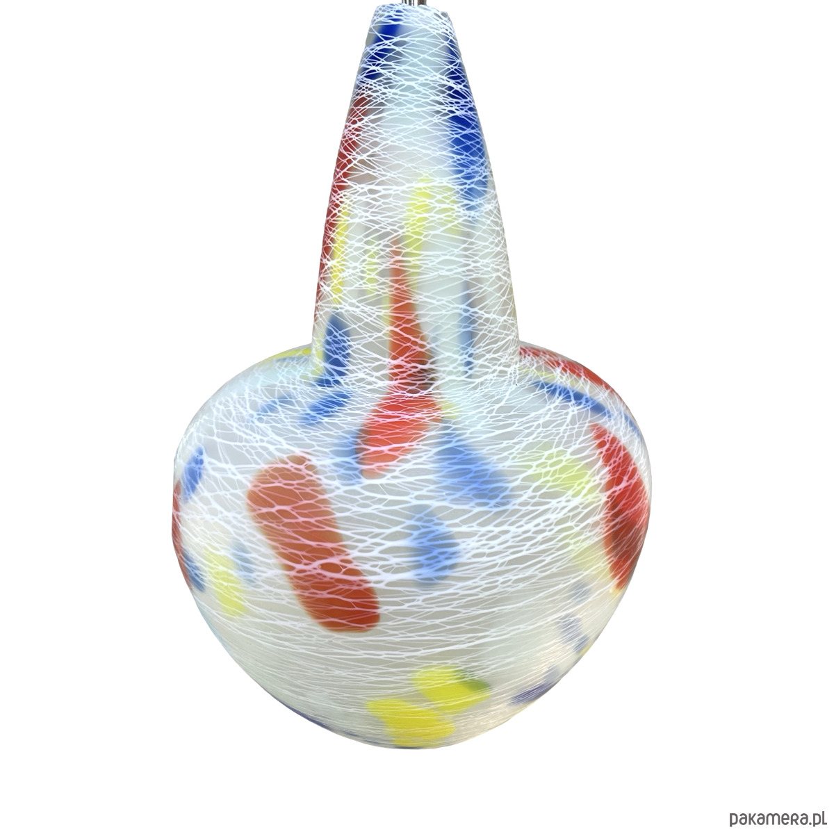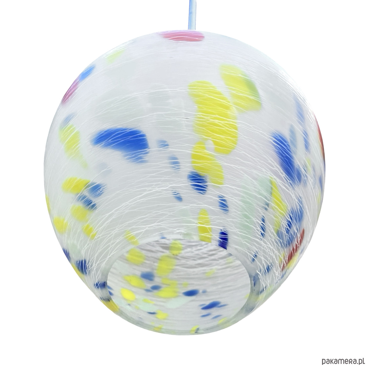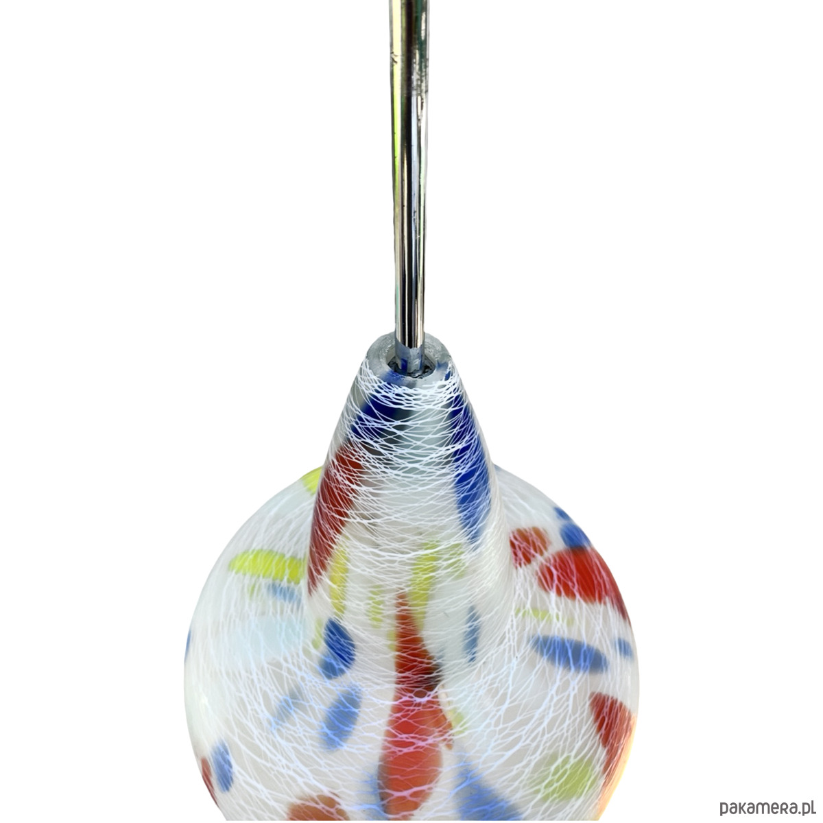 Wyjątkowa lampa wisząca zaprojektowana przez Jaroslav Antonin Junka dla czeskiej wytwórni Zukov w latach 60. Klosz wykonany ze szkła w stylu „Brusel” – ręcznie dekorowany techniką natrysku wybieranego, nadający każdemu egzemplarzowi unikatowy charakter. Kolorowe motywy (czerwień, błękit, żółć) osadzone na mlecznej, spękanej powierzchni „crackle” tworzą wyjątkowy, plastyczny efekt po zapaleniu żarówki.