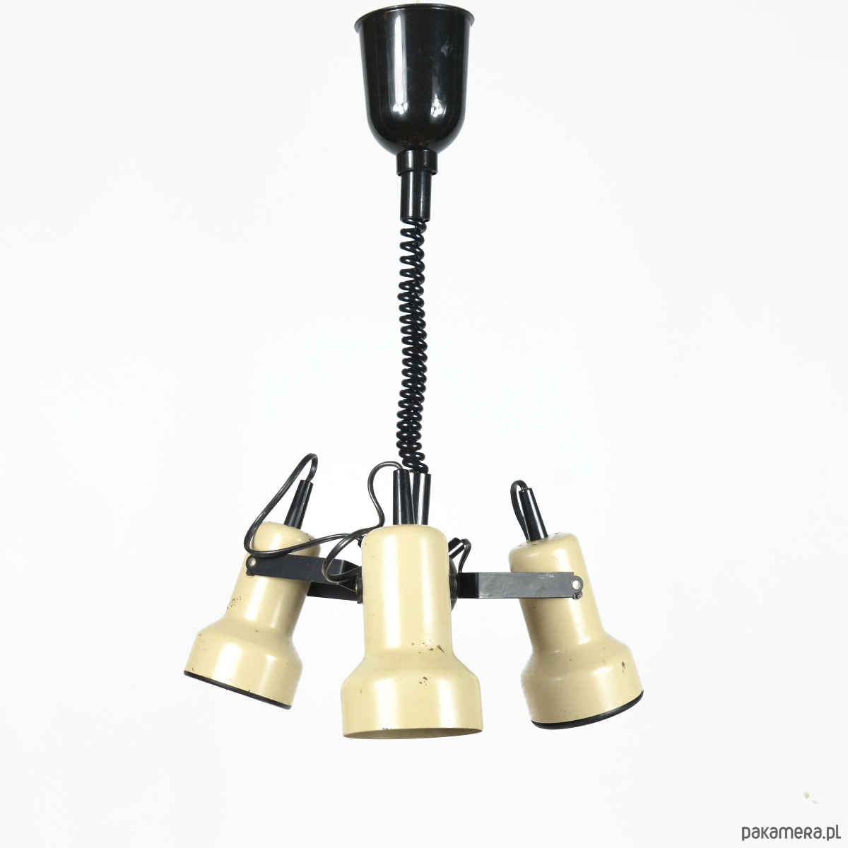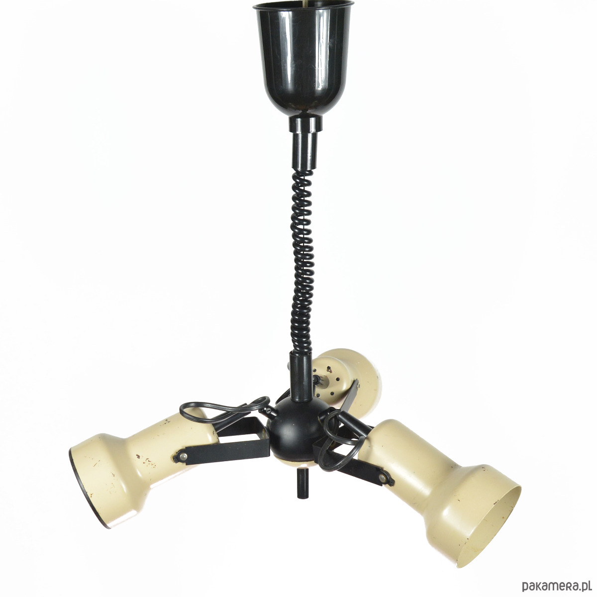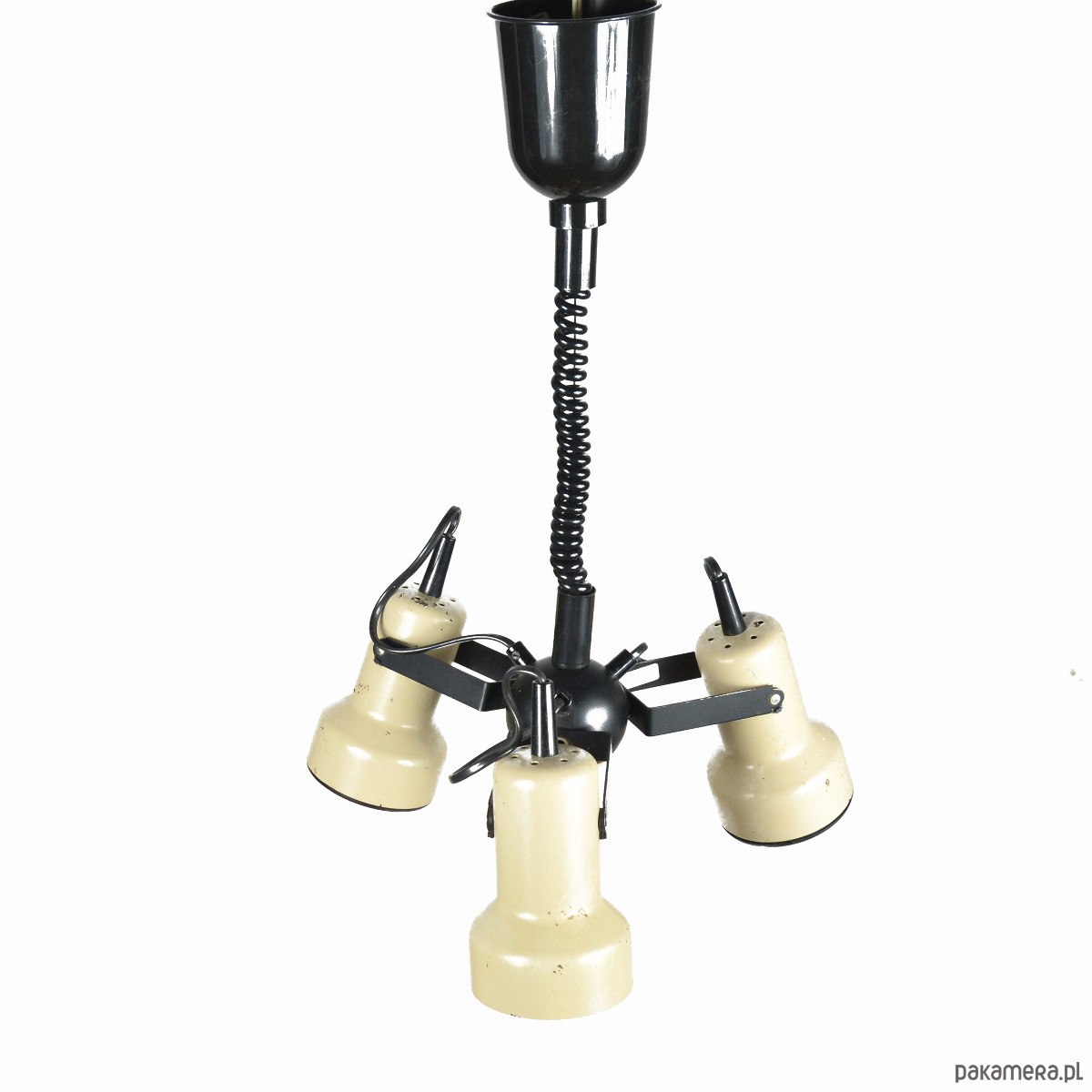 Lampa wisząca o trzech punktach świetlnych wyprodukowana przez Richard Essig Besigheim w Niemczech w latach 70. Modernistyczny, industrialny żyrandol z elementami space age. Lampa wykonana ze stali w kolorze beżowym wykończone elementami z tworzywa sztucznego, zawiesie spiralne z możliwością regulacji wysokości. Klosze lampy można swobodnie obracać i zmieniać kąt świecenia. Lampa sprawna, działa na standardowe żarówki na duży gwint E27 do 100W. Stan zachowania dobry, przedmiot nosi małe ślady użytkowania, niewielkie braki lakieru i zmatowienie wewnątrz klosza. Uszkodzenia widoczne na zdjęciach. Instalacja została wymieniona.Wymiary: wysokość 53-140 cm | średnica 45 cm | wysokość klosza 14 cm | średnica klosza 10 cm