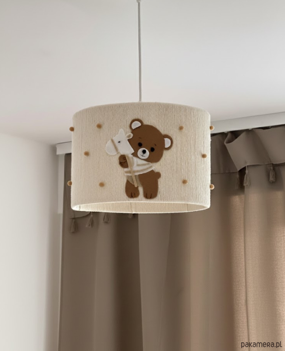 Uroczy klosz do lampy dziecięcej. Wykonany z wysokiej jakości materiału w ciepłym, neutralnym odcieniu ecru, ozdobiony aplikacją misia trzymającego konika wykonanego z filcu oraz subtelnymi, dekoracyjnymi kropeczkami. Całość tworzy przytulny i harmonijny efekt.