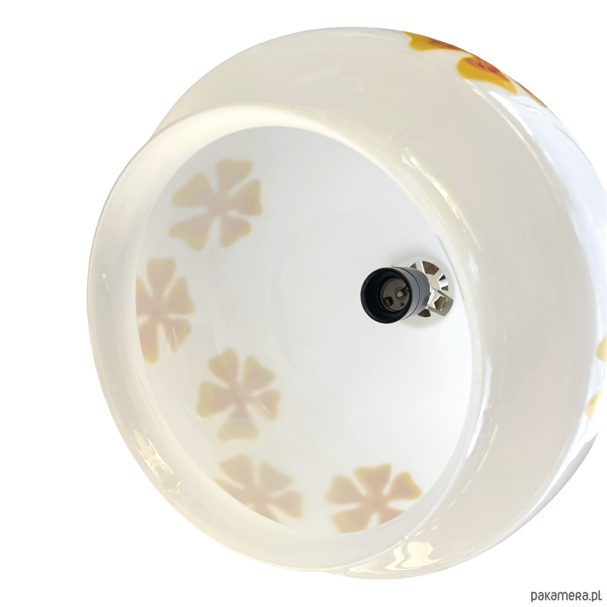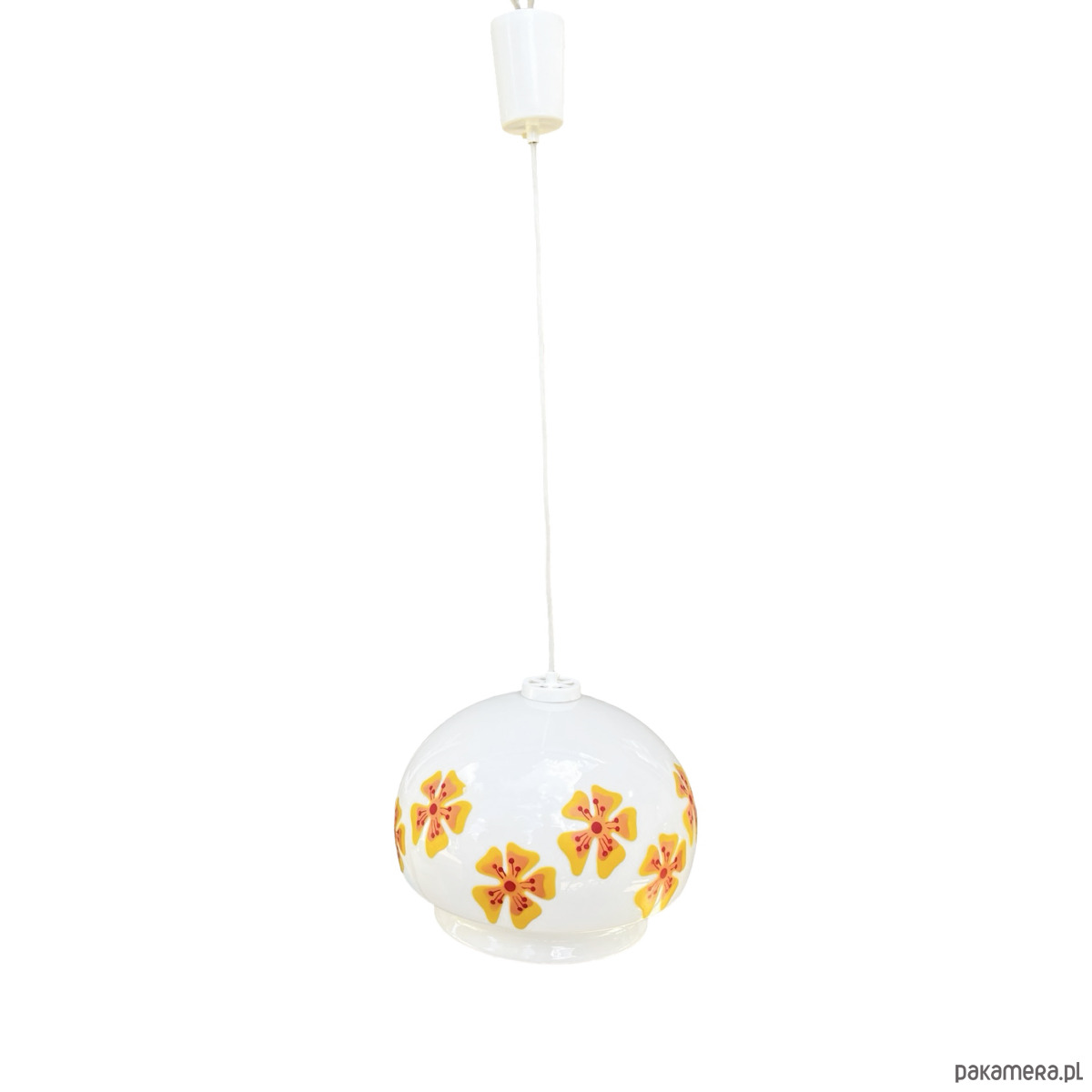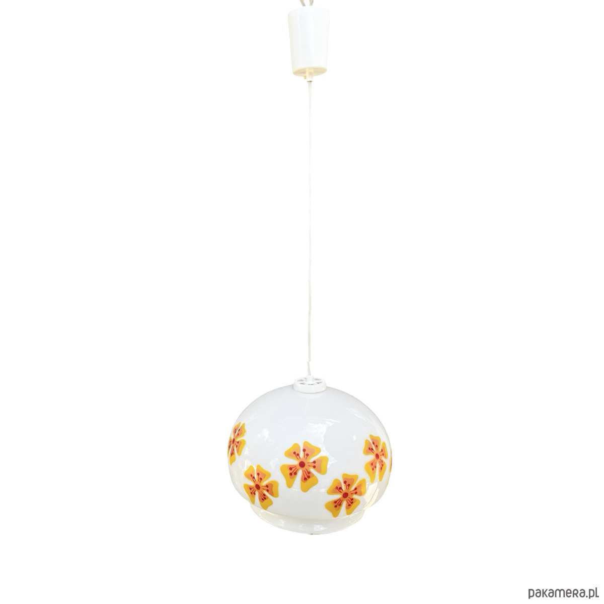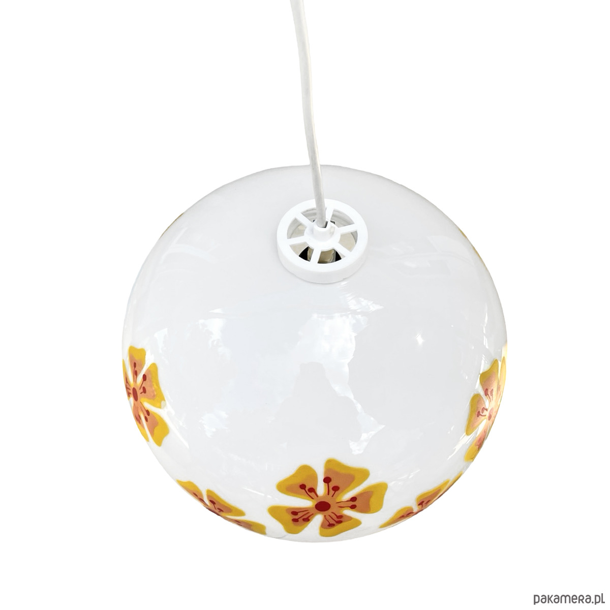 Klosz w formie dużej, półkulistej kuli wykonany jest z białego szkła zdobionego ręcznie malowanymi motywami kwiatów w odcieniach pomarańczu i czerwieni. Charakterystyczna powierzchnia klosza pokryta jest farbą satynową, dającą efekt delikatnego „zamszu”, co dodatkowo podkreśla wyjątkowy charakter lampy.