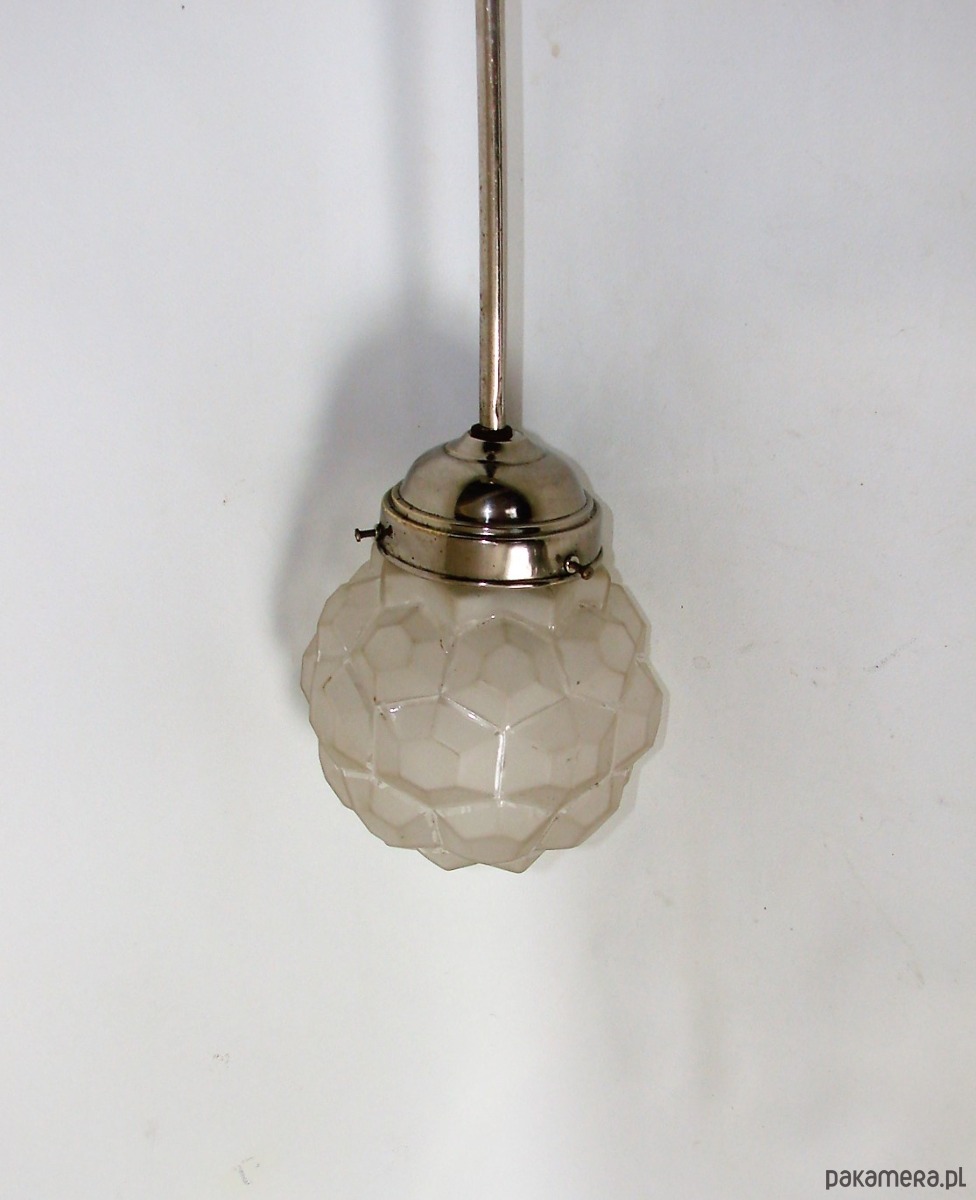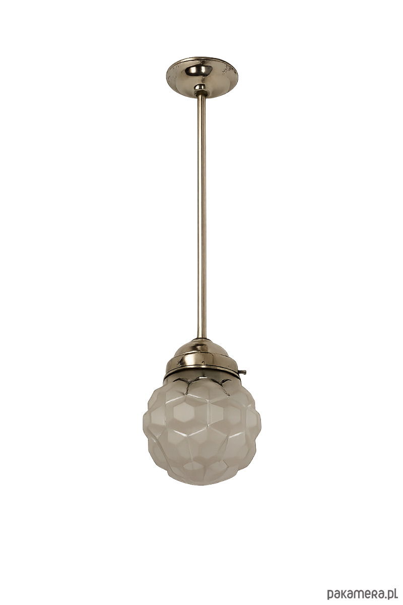 Klasyczna lampa wisząca z lat 30. w formie krótkiego montażu sufitowego (semi-flush) — bez łańcucha i bez długiej sztycy. Konstrukcja łączy mosiądz, metal oraz szklany, żłobiony klosz o subtelnej strukturze, charakterystycznej dla wzornictwa międzywojennego.