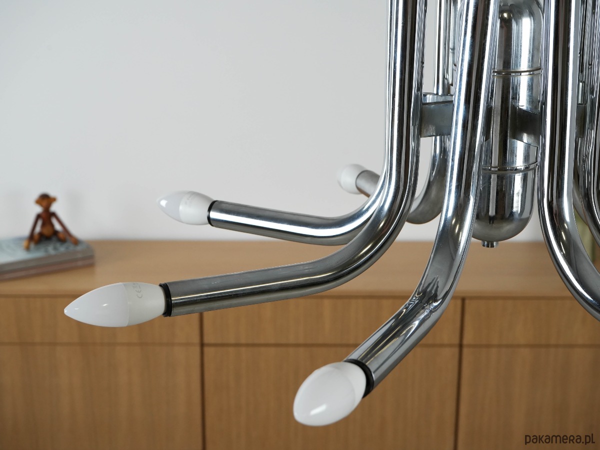 Wykonana z metalu w kolorze srebrnym. Unikatowa konstrukcja nie jest tylko elementem designu, jej głównym założeniem jest rozproszenie światła w celu tworzenia przyjemnego nastroju wnętrza.