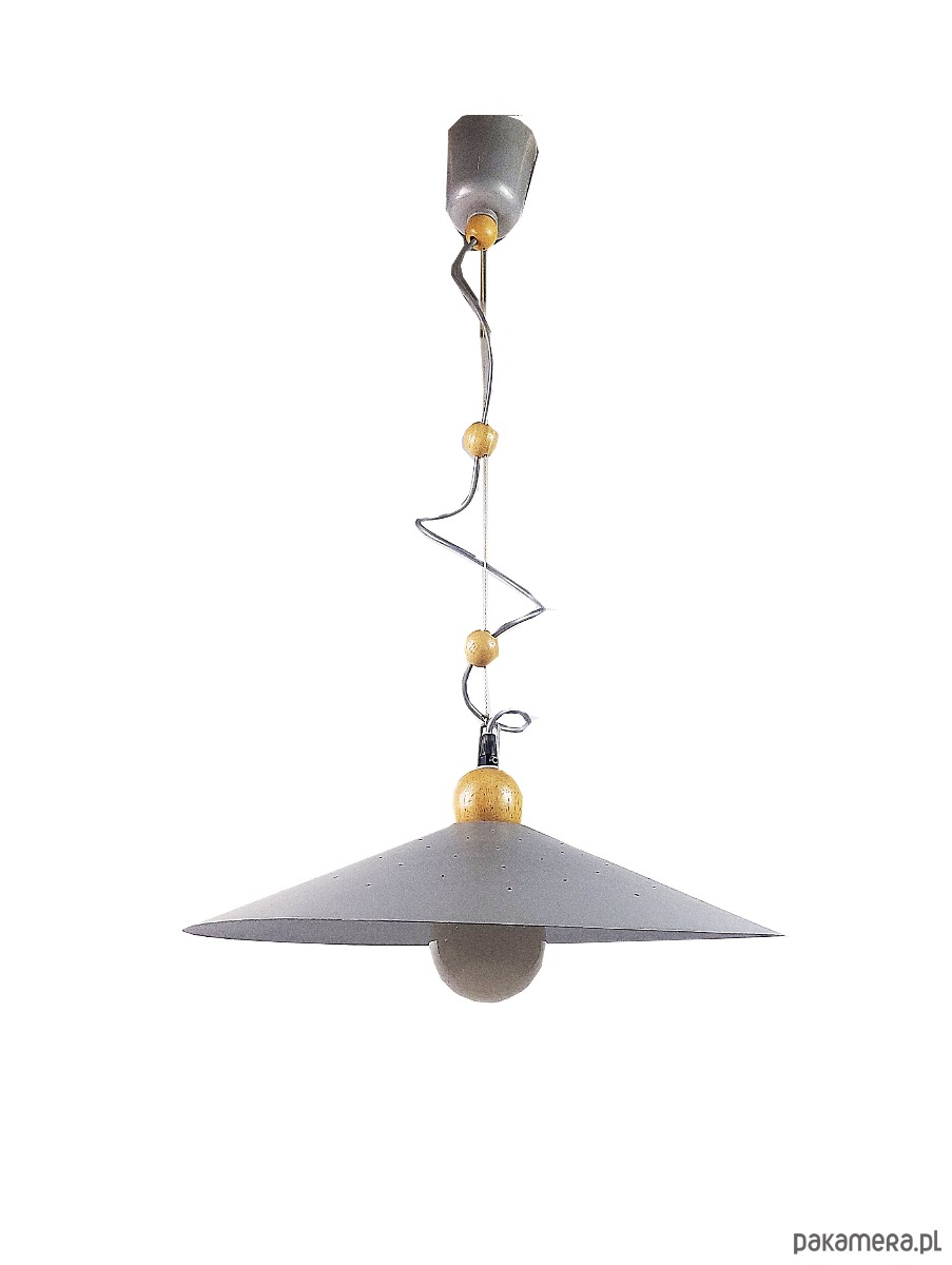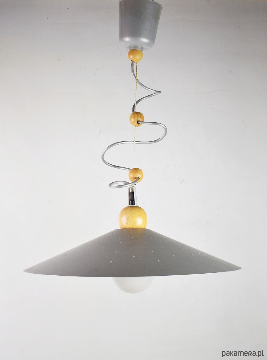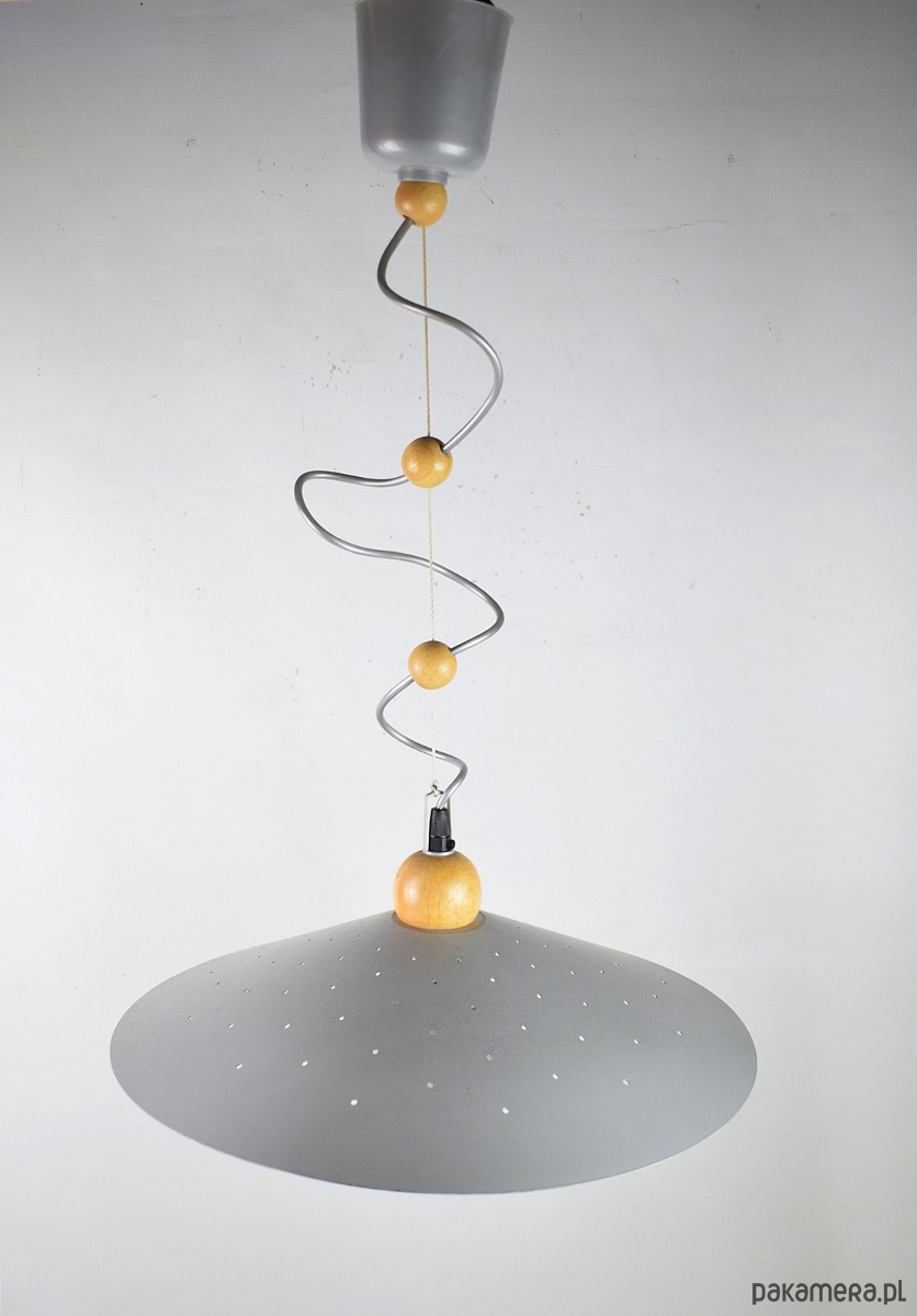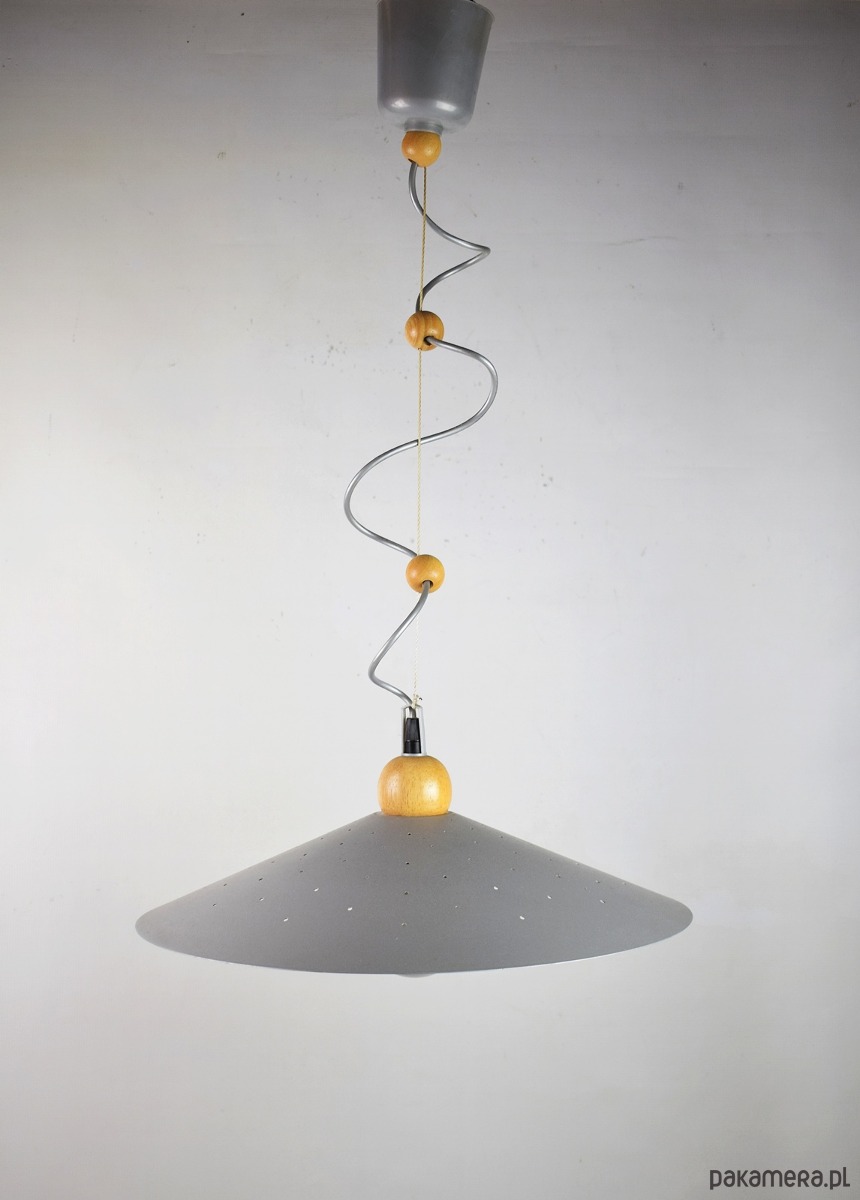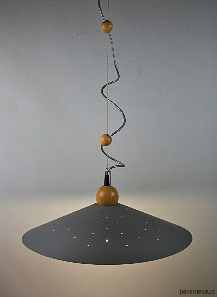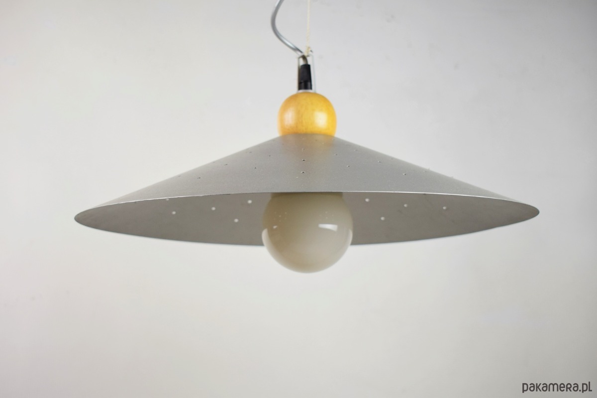 Wyjątkowa lampa wisząca z lat 80., utrzymana w stylu skandynawskiego modernizmu. Jej forma łączy prostotę z subtelną dekoracyjnością – szeroki, stożkowy klosz z perforowanego metalu w odcieniu szarości pięknie rozprasza światło, tworząc przytulną atmosferę.