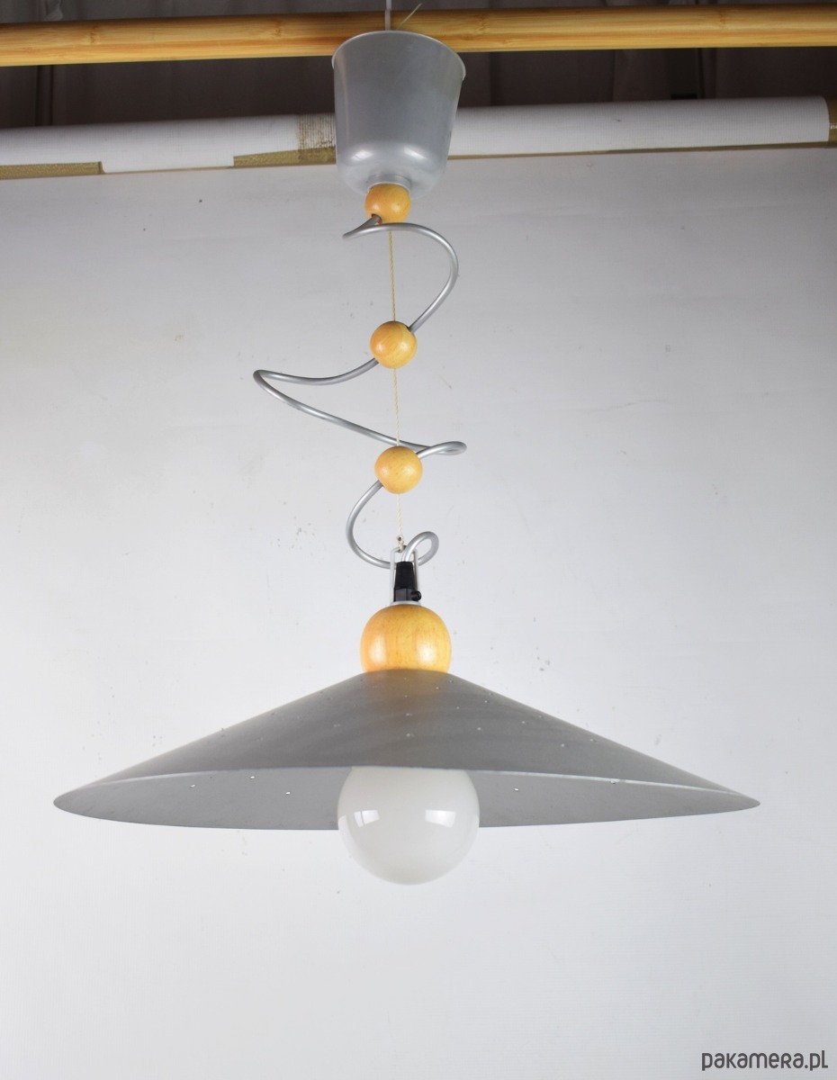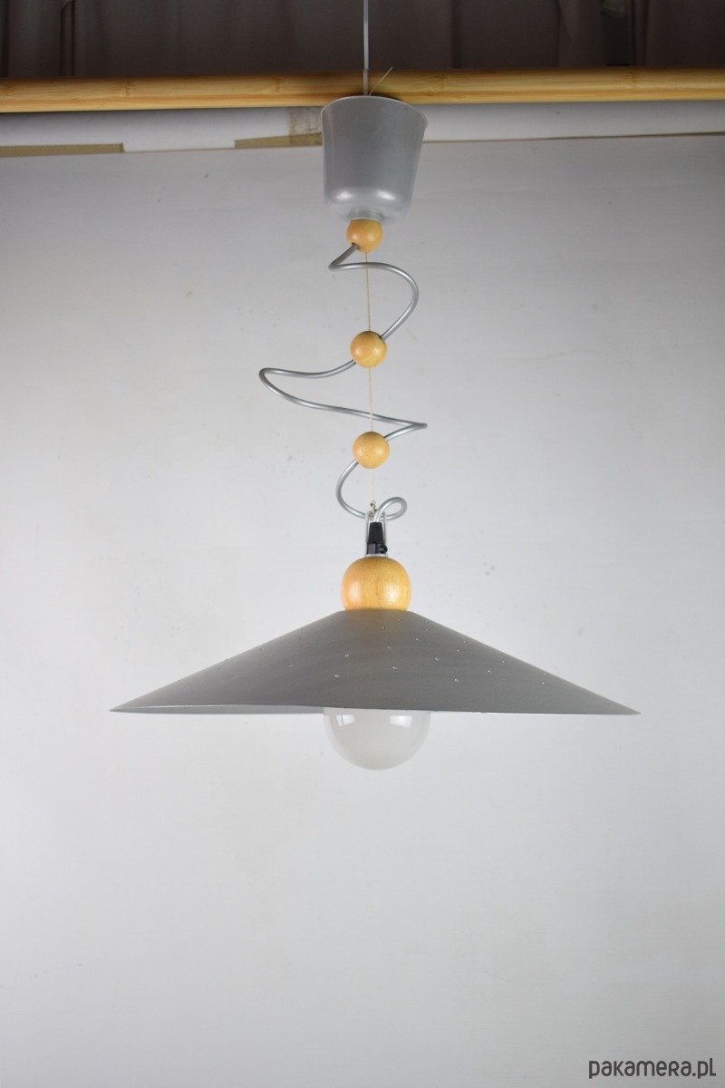 Wisząca lampa vintage z lat 80. – skandynawski design z elementami drewna i metalu