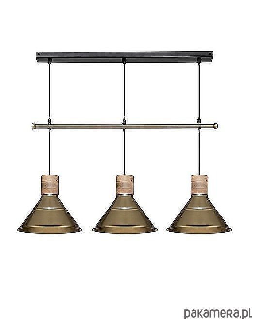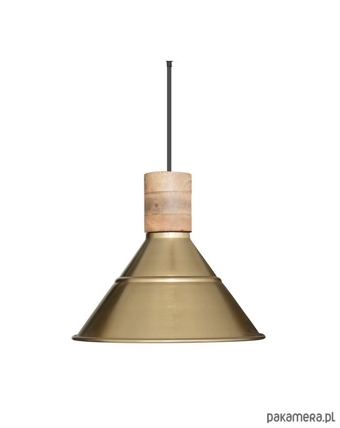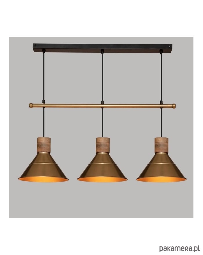 Bardzo ciekawa lampa wisząca w industrialnym stylu. Utrzymana w kolorze złotym. Delikatnie matowa. Wykonana ze stali. Posiada dodatki wykonane z drewna mango.