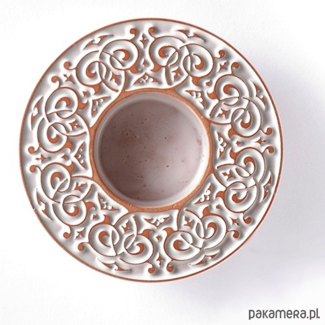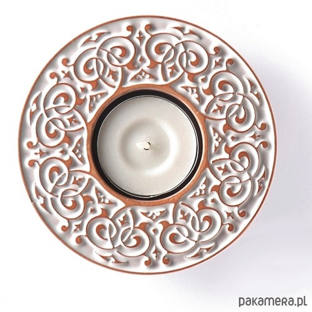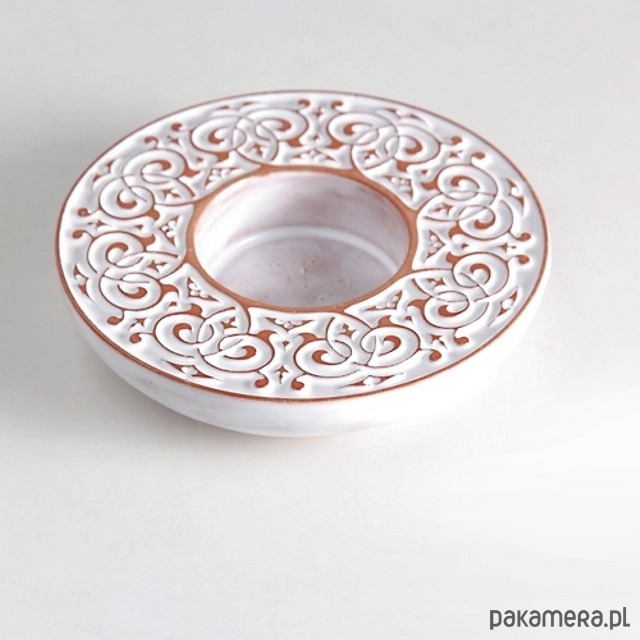 Ceramiczny lampion (świecznik) z misternym, lekko wypukłym ornamentem. Wykonany z ciemnejj gliny, pokryty błyszczącym białym szkliwem. Od spodu sygnowany. Polecam serdecznie.