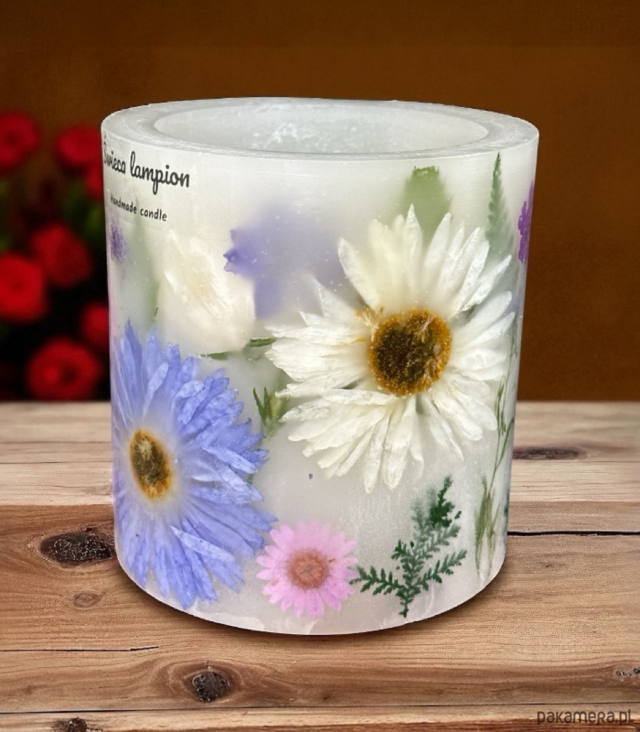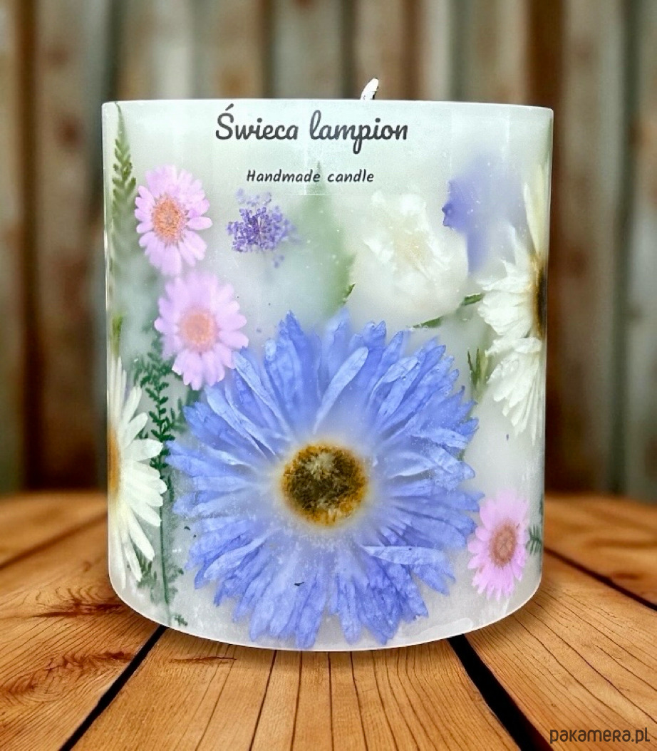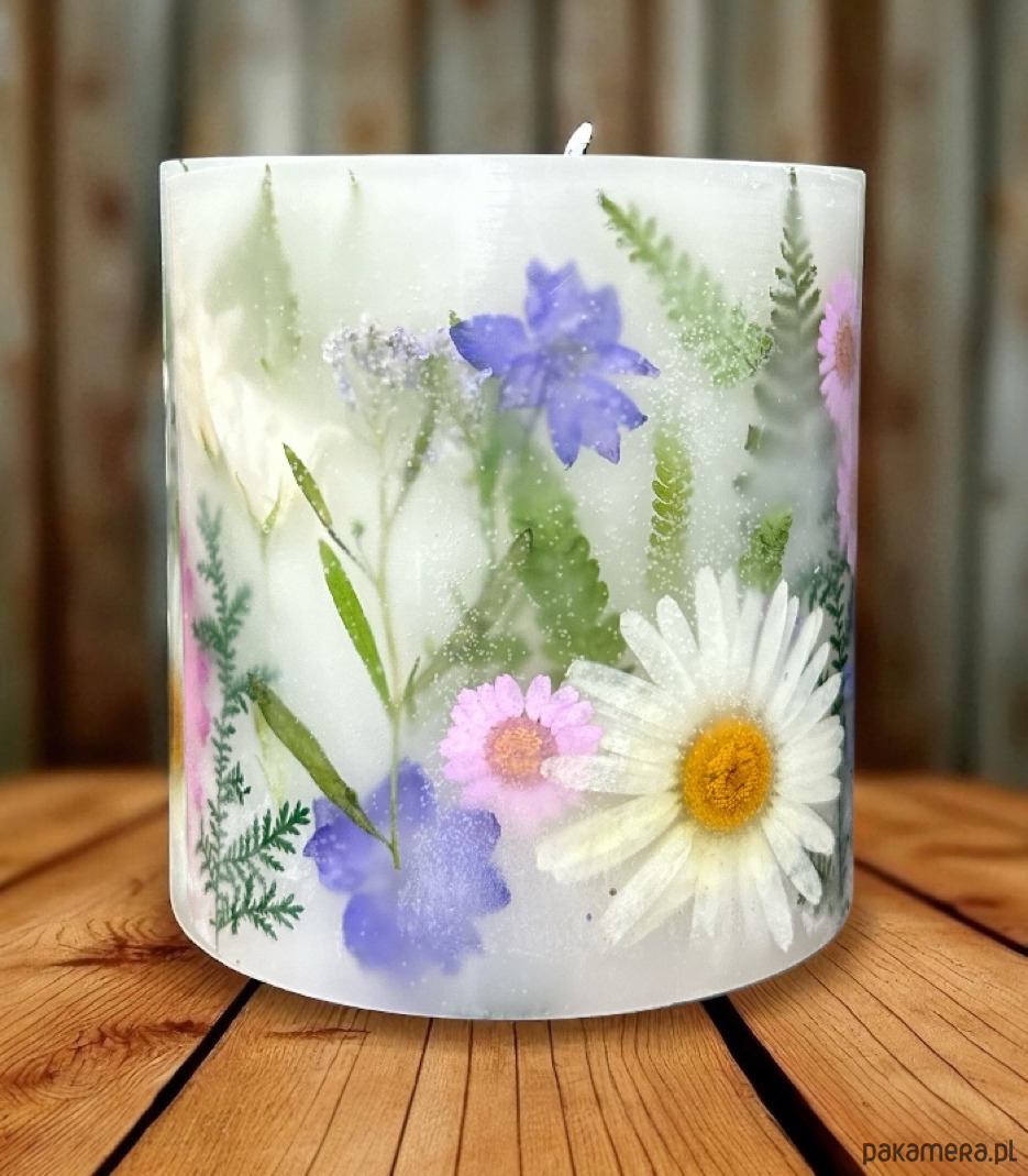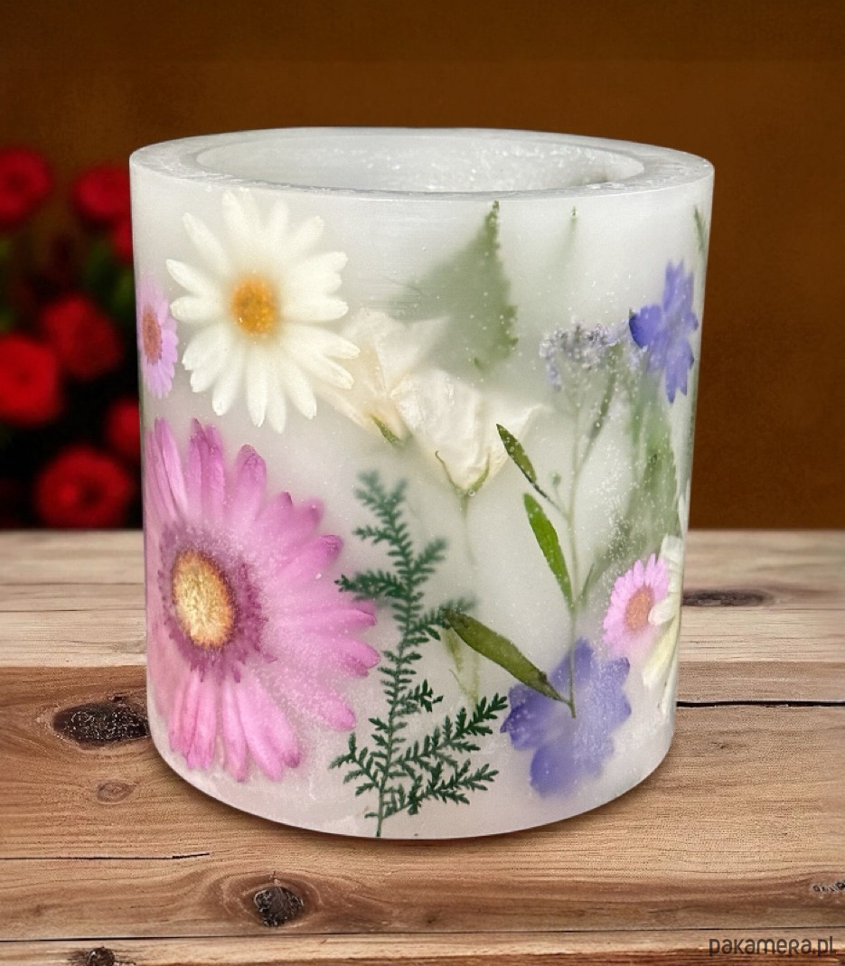 Wykonuję go ręcznie, z przezroczystej, czystej hydrorafinowanej parafiny (najwyższej jakości ), która subtelnie otula zatopione w niej rośliny.