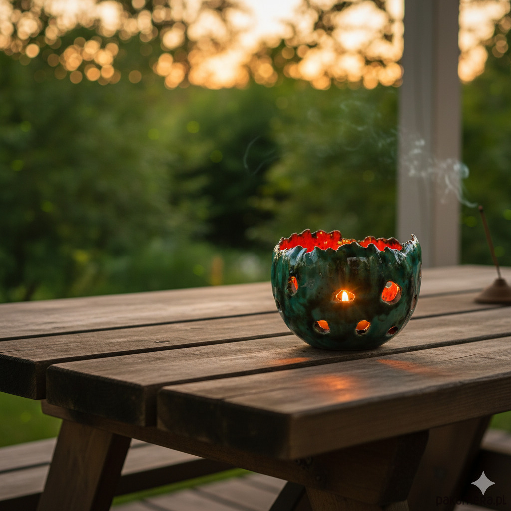 Nieregularny, pofalowany brzeg misy sprawia wrażenie, jakby ten "arbuz" został niechlujnie, ale z pasją, oderwany od reszty. To nie jest perfekcyjnie wycięty kawałek, lecz naturalny rozpad, który dodaje mu artystycznego wyrazu. Lampion ten, niczym dojrzały owoc, kusi, by zajrzeć do jego wnętrza i odkryć jego ognistą duszę, ukrytą pod chłodną, zielonkawą powłoką. Jest to ceramiczny "arbuz", który zamiast gasić pragnienie, rozpala wyobraźnię.