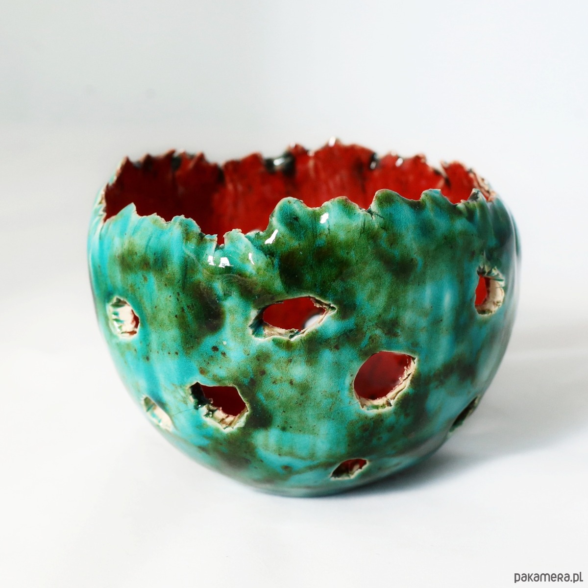 Ten ceramiczny lampion jest niczym fantastyczny, pęknięty arbuz z innej galaktyki. Jego zewnętrzna powłoka, z jej głębokimi odcieniami turkusu i zieleni, z ciemniejszymi, niemal morskimi smugami, przywodzi na myśl skórkę dojrzałego arbuza, jednak takiego, który spędził tysiące lat na dnie oceanu, zyskując patynę i barwy podwodnych skarbów. Nie jest gładka i idealna, lecz naznaczona nieregularnymi falami i zagłębieniami, jakby była rzeźbiona przez morskie prądy.