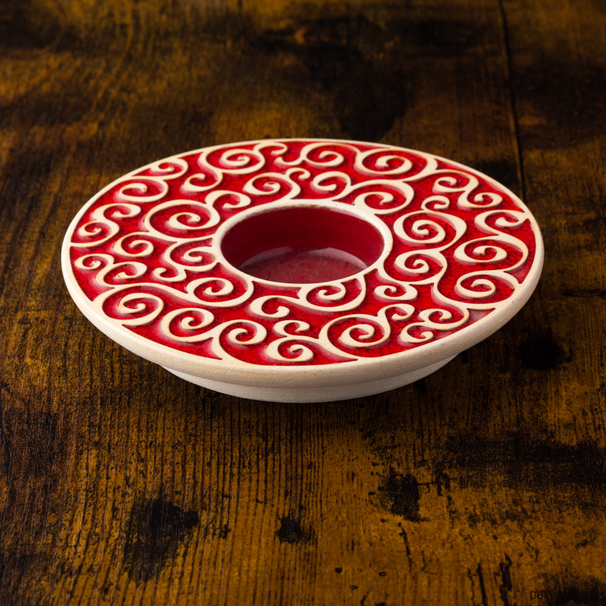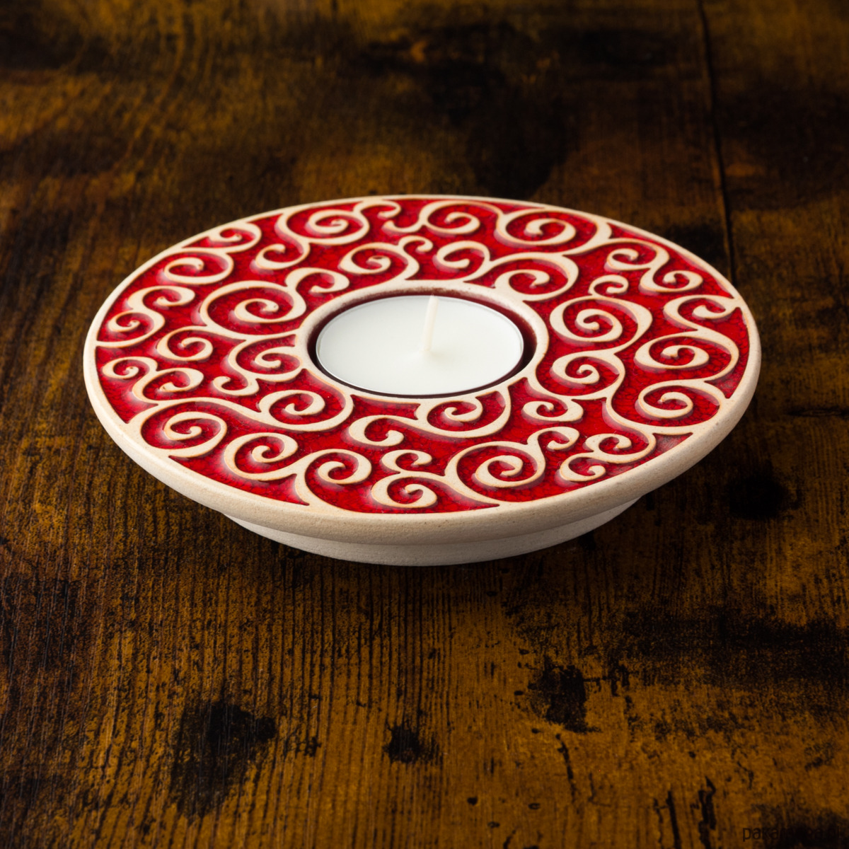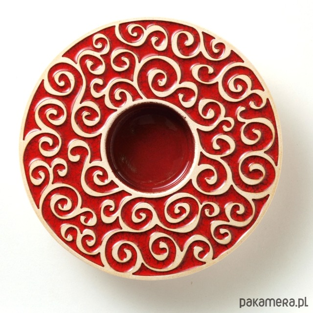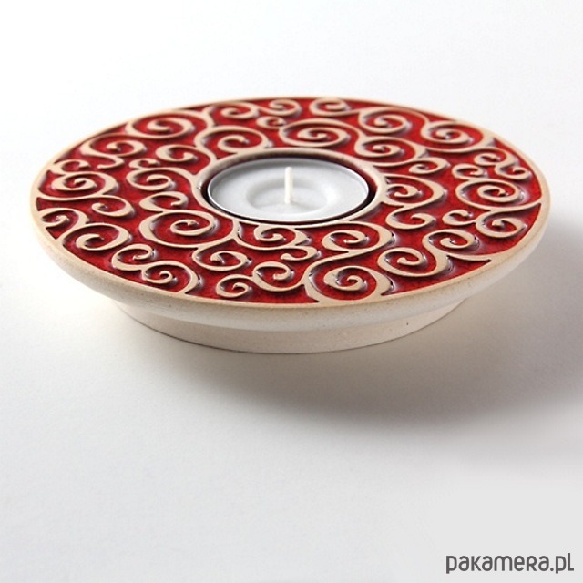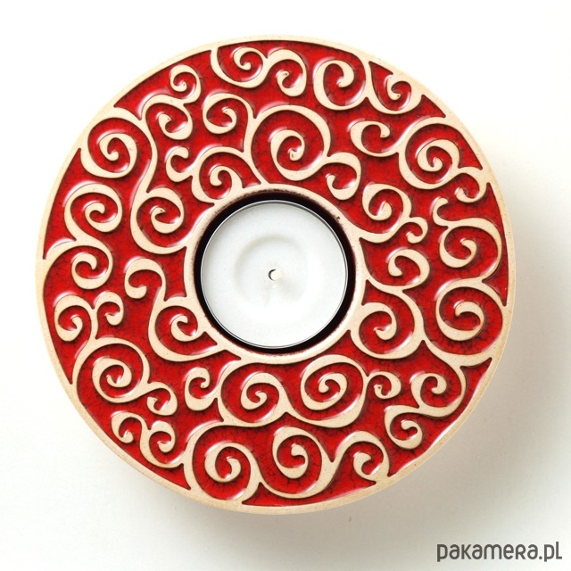 Ceramiczny, okrągły lampion (świecznik) z lekko wypukłym, bardzo dekoracyjnym ornamentem. Ręcznie wykonany z jasnej gliny, ręcznie szkliwiony. Polecam serdecznie.