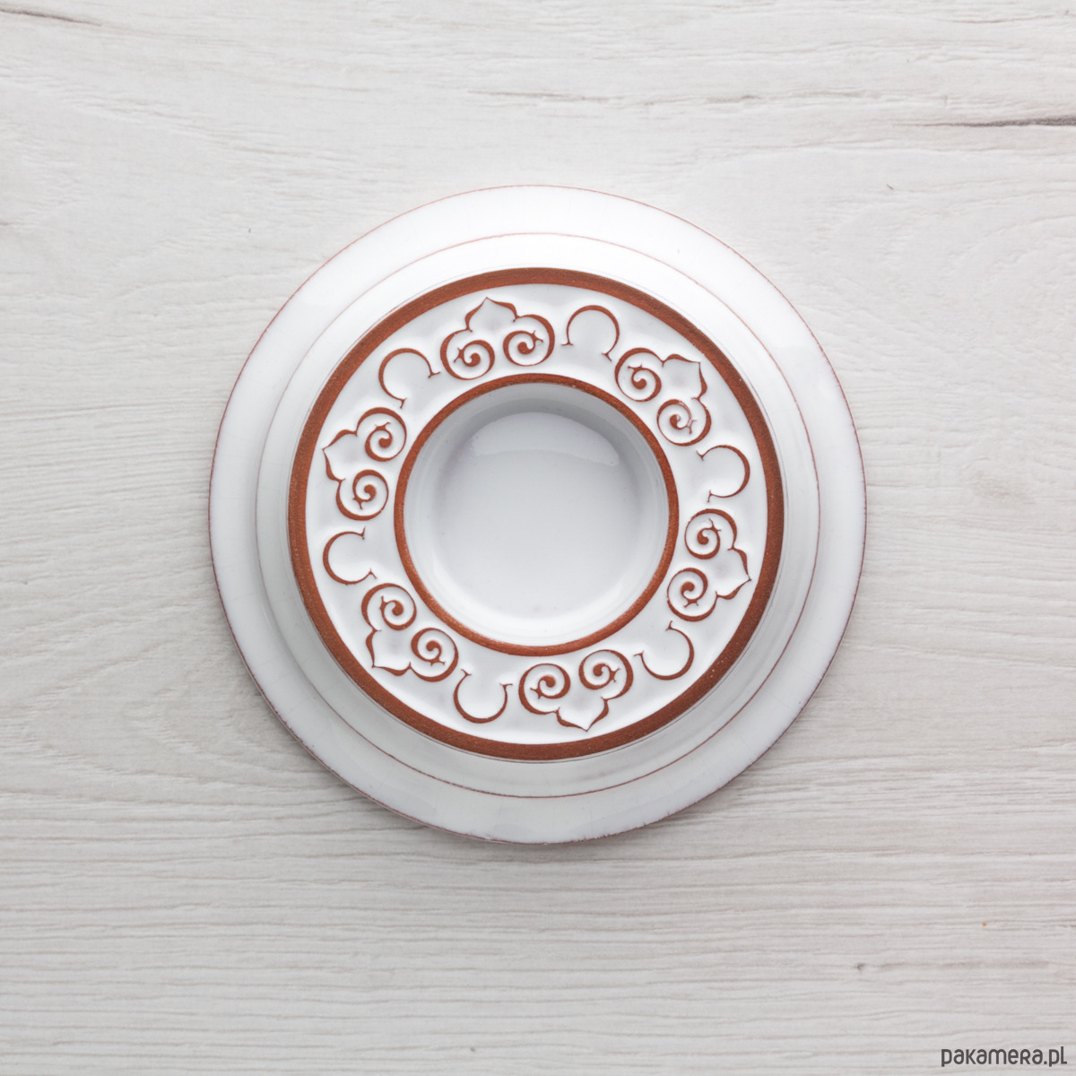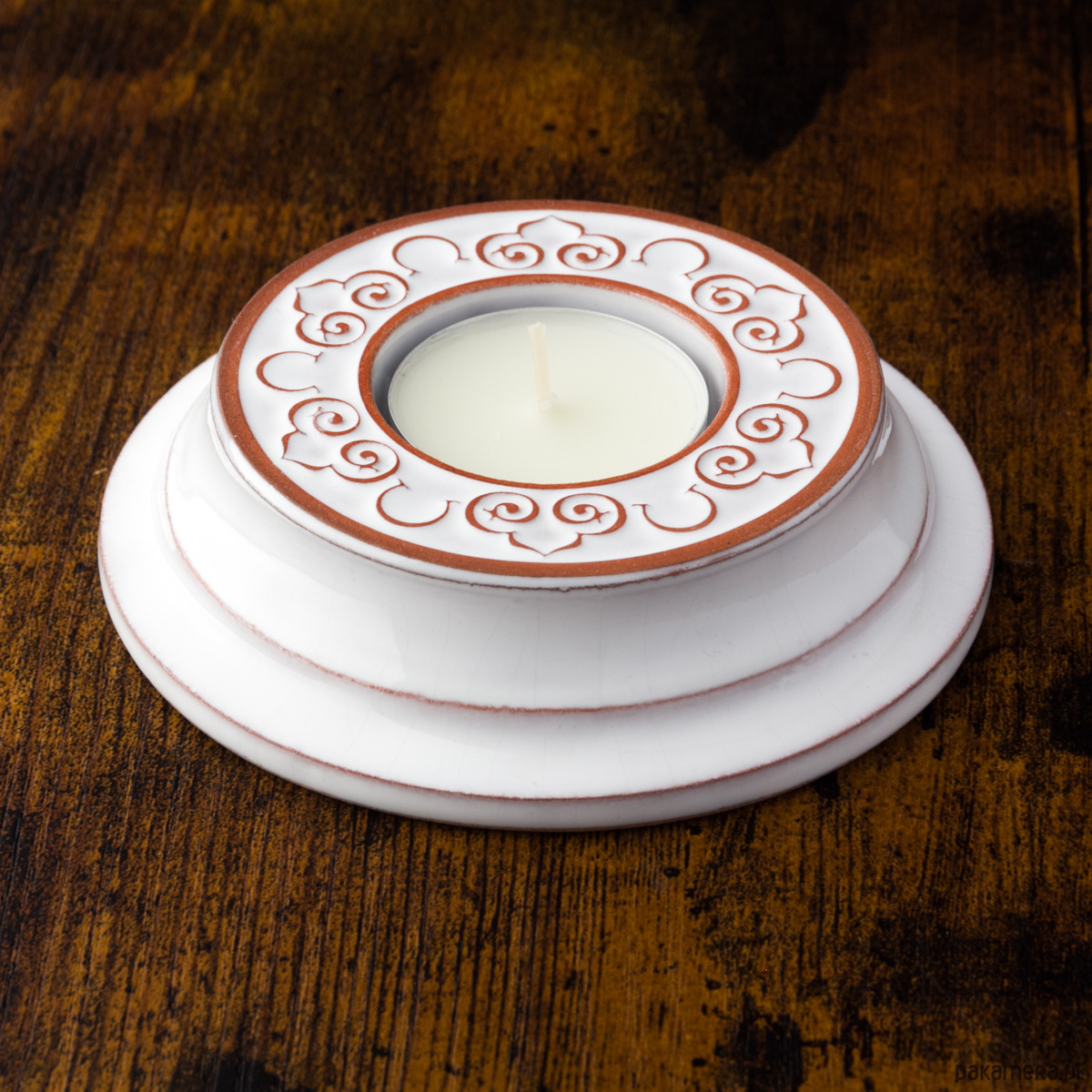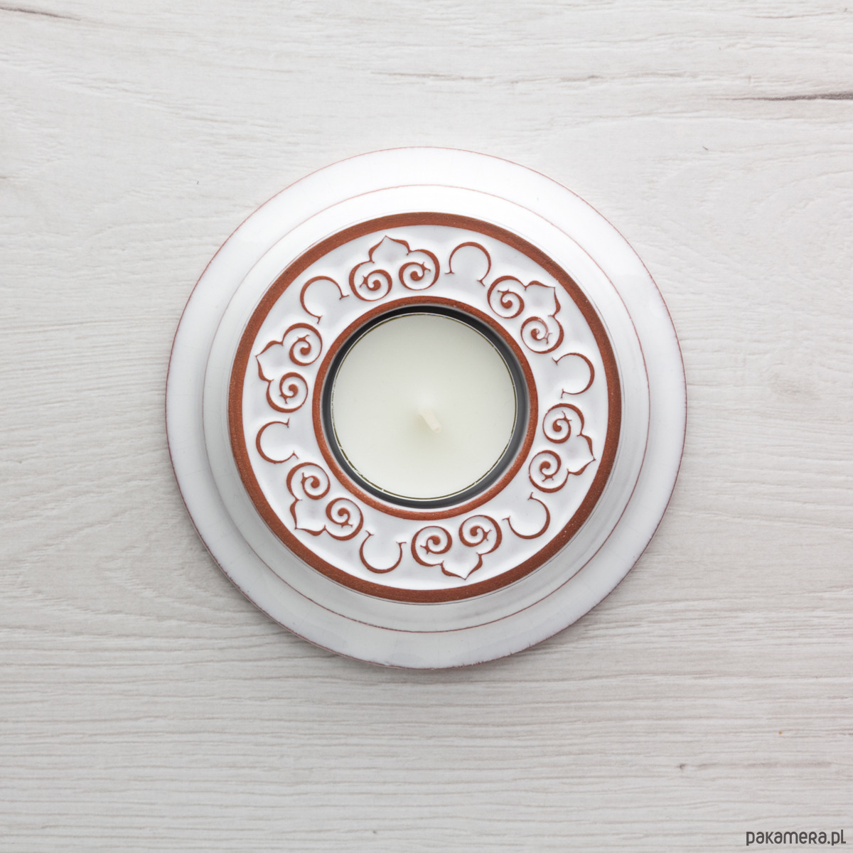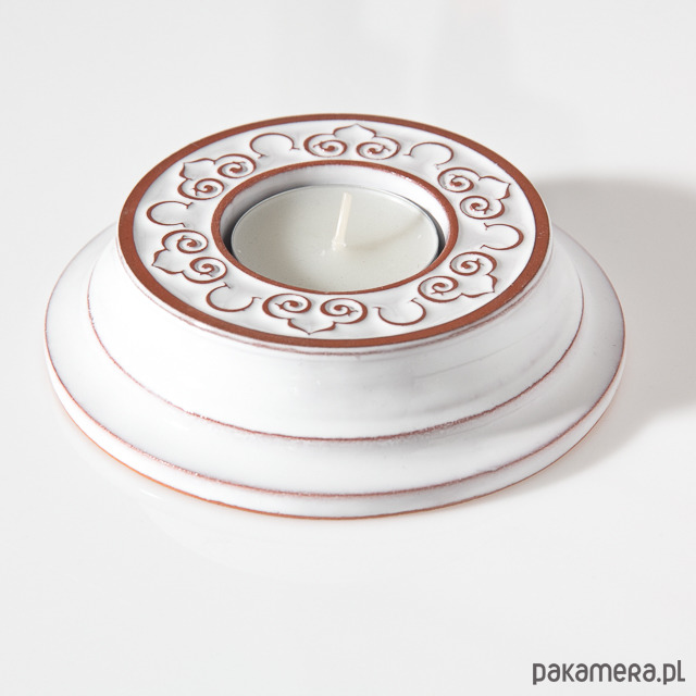 Ceramiczny, okrągły lampion (świecznik) z lekko wypukłym ornamentem. Wykonany z ciemnej gliny, pokryty błyszczącym, białym szkliwem. Od spodu sygnowany. Polecam serdecznie.