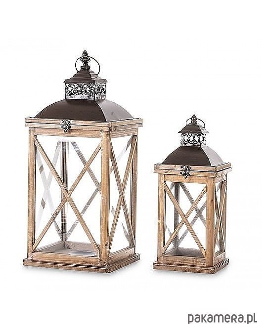 Komplet 2 latarni koloru brązowego. Celowo postarzane. Wykonane z drewna, ze szklanymi ścianami. Otwierane do góry. Zwieńczenie każdej wykonane jest z metalu z uchwytem, dzięki któremu można je łatwo przenosić. Nadadzą romantyczny klimat w każdym miejscu.