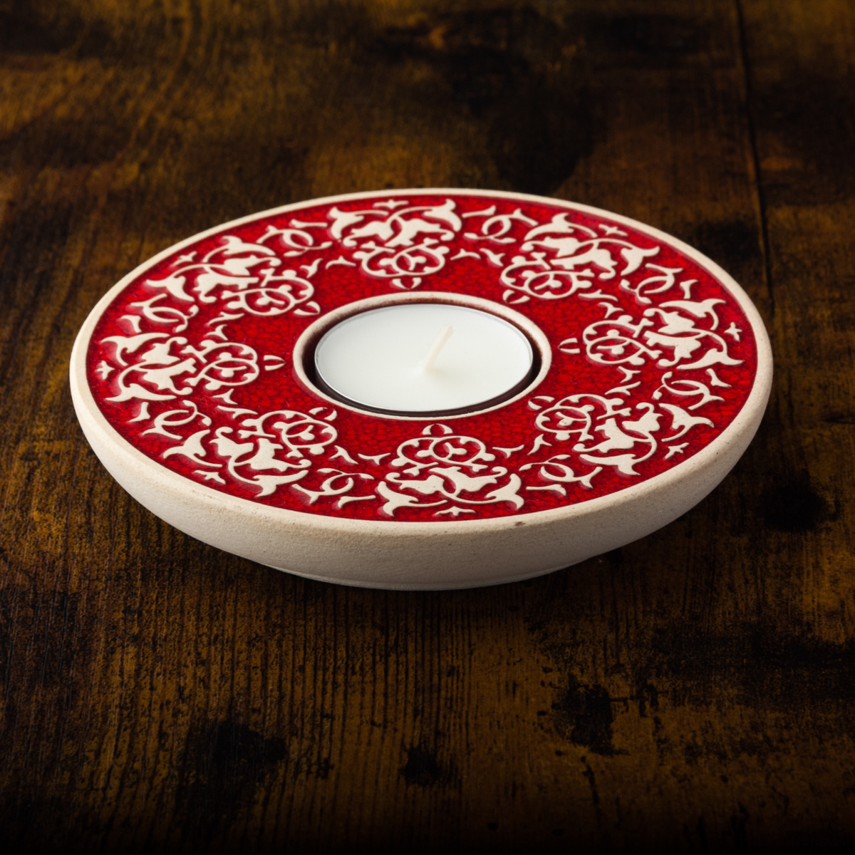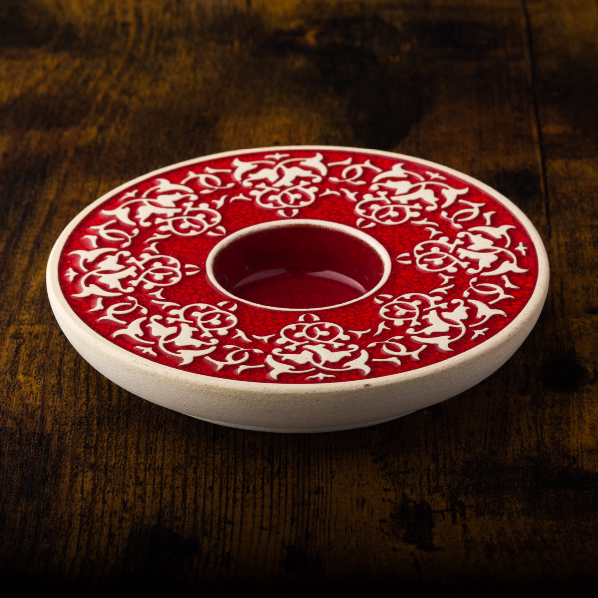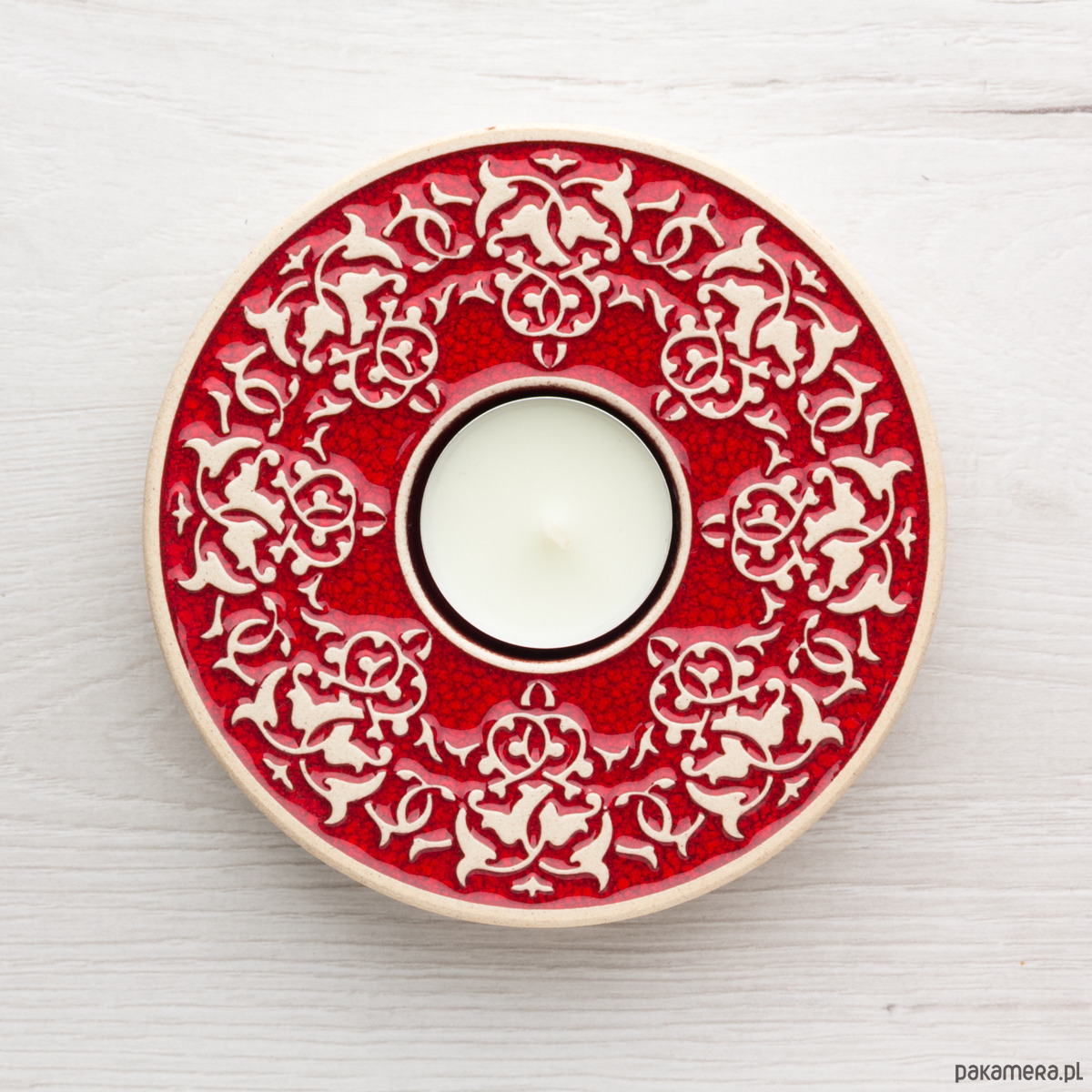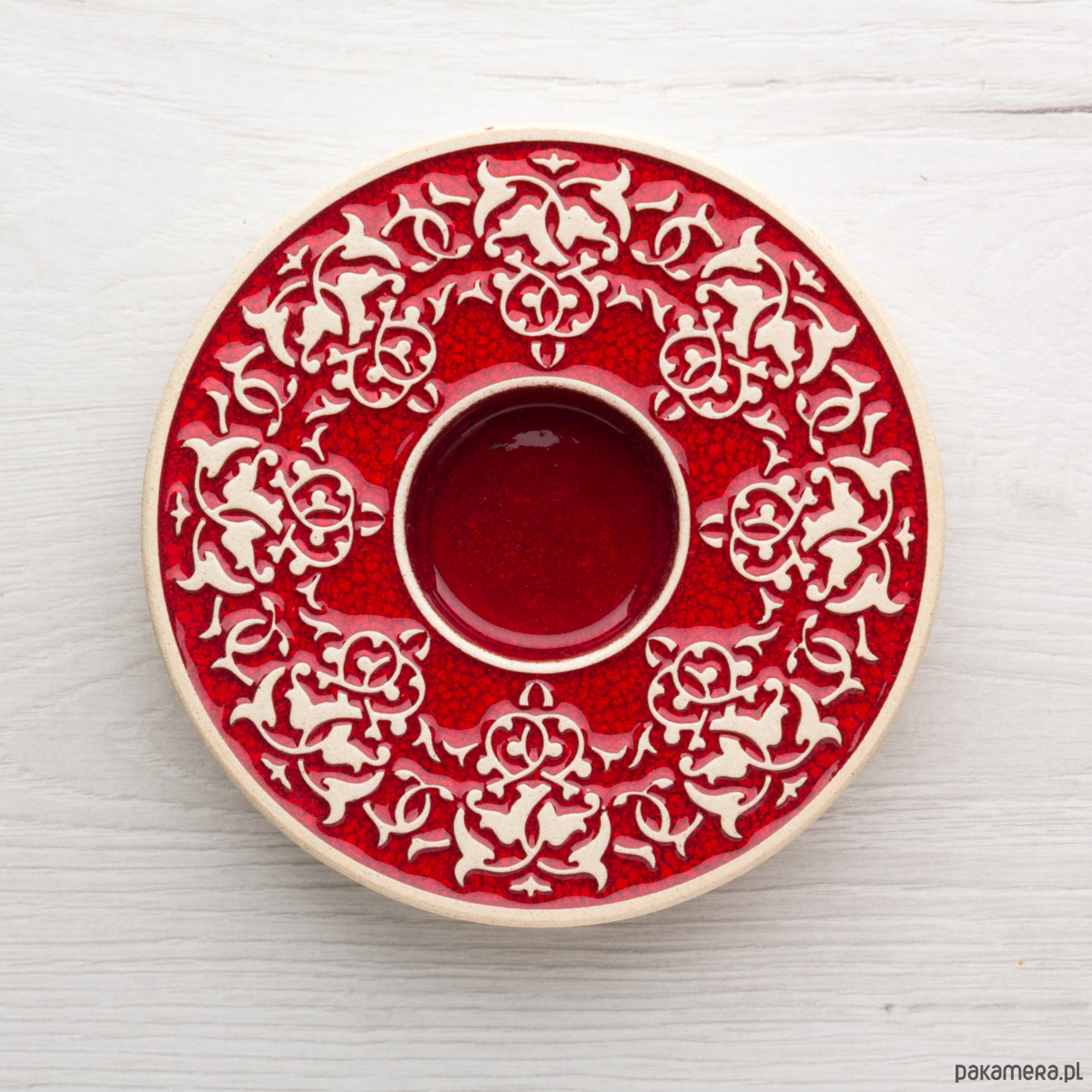 Okrągły, ceramiczny lampion (świecznik) z roślinnym, lekko wypukłym ornamentem. Ręcznie wykonany z jasnej gliny, górna powierzchnia i wnętrze pokryte błyszczącym, intensywnie czerwonym szkliwem. Od spodu sygnowany. Polecam serdecznie.