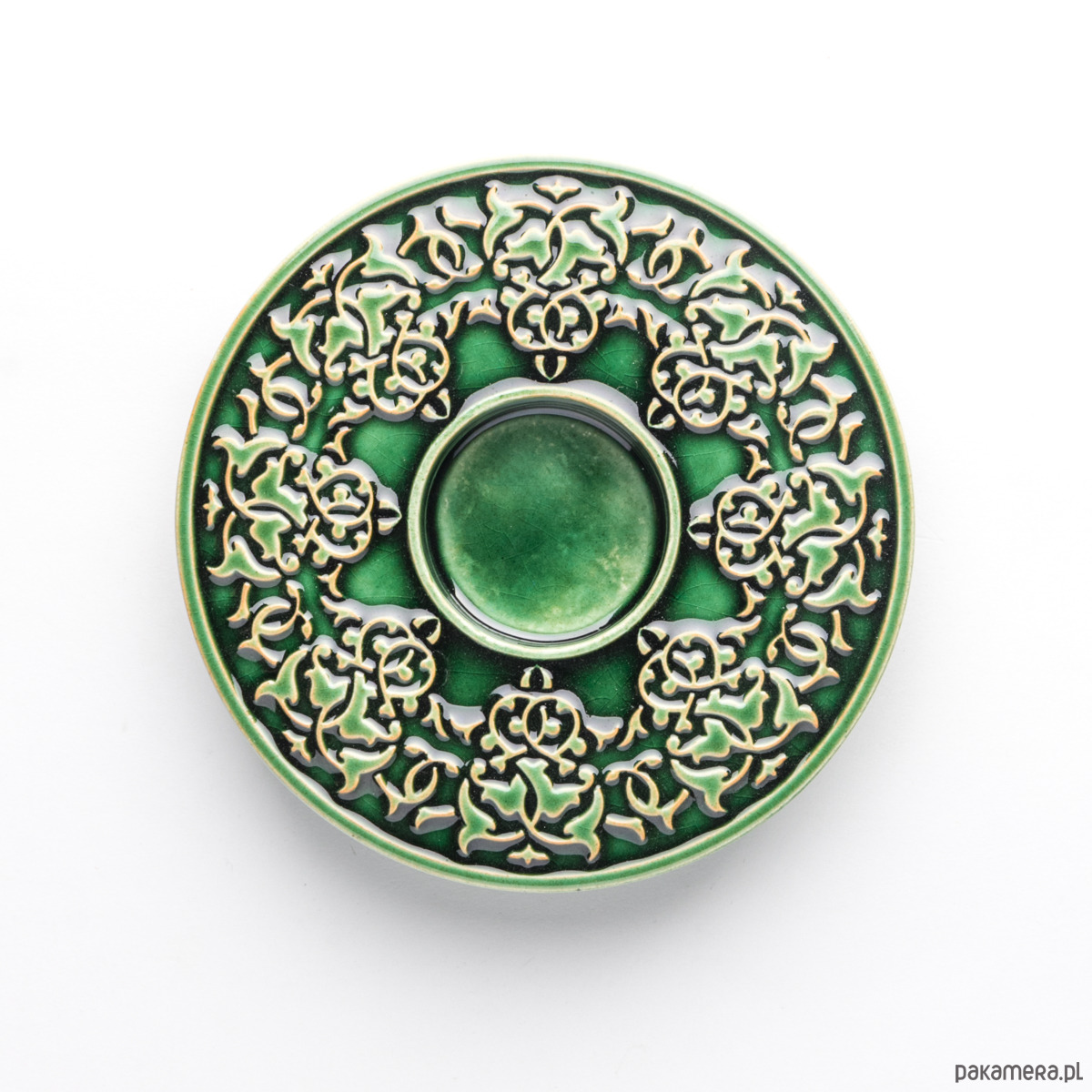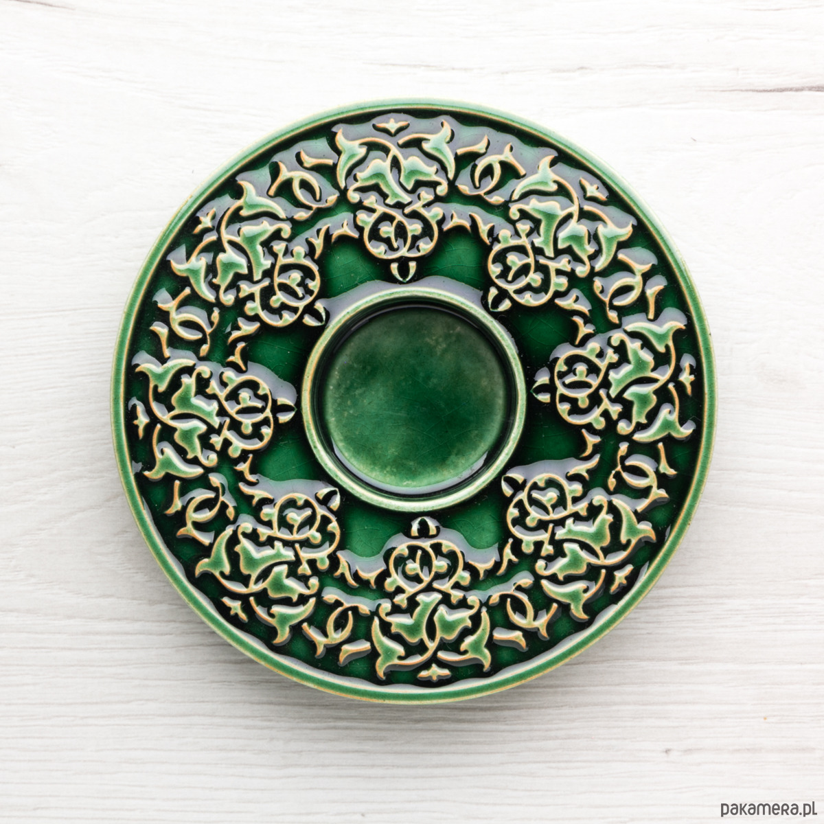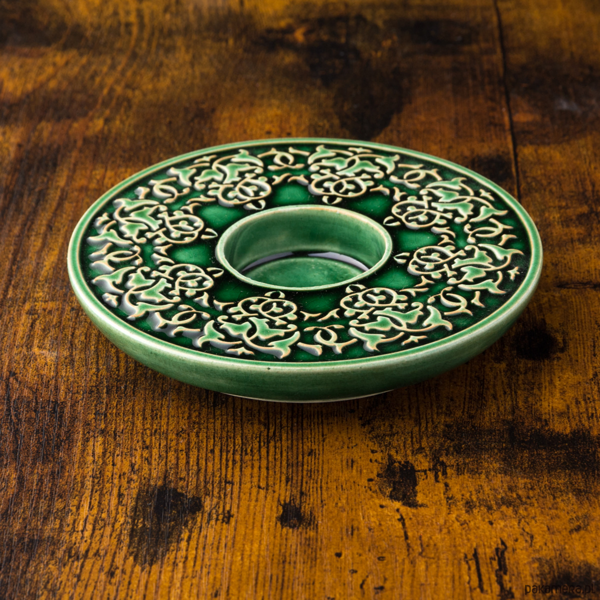Ceramiczny lampion (świecznik) z lekko wypukłym, roślinnym ornamentem. Wykonany z jasnej gliny, pokryty błyszczącym szkliwem. Od spodu sygnowany. Polecam serdecznie.