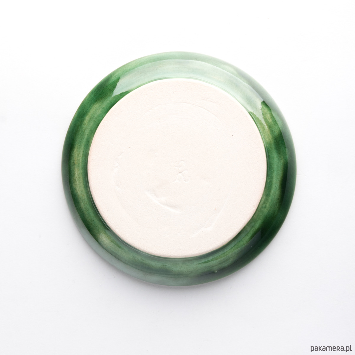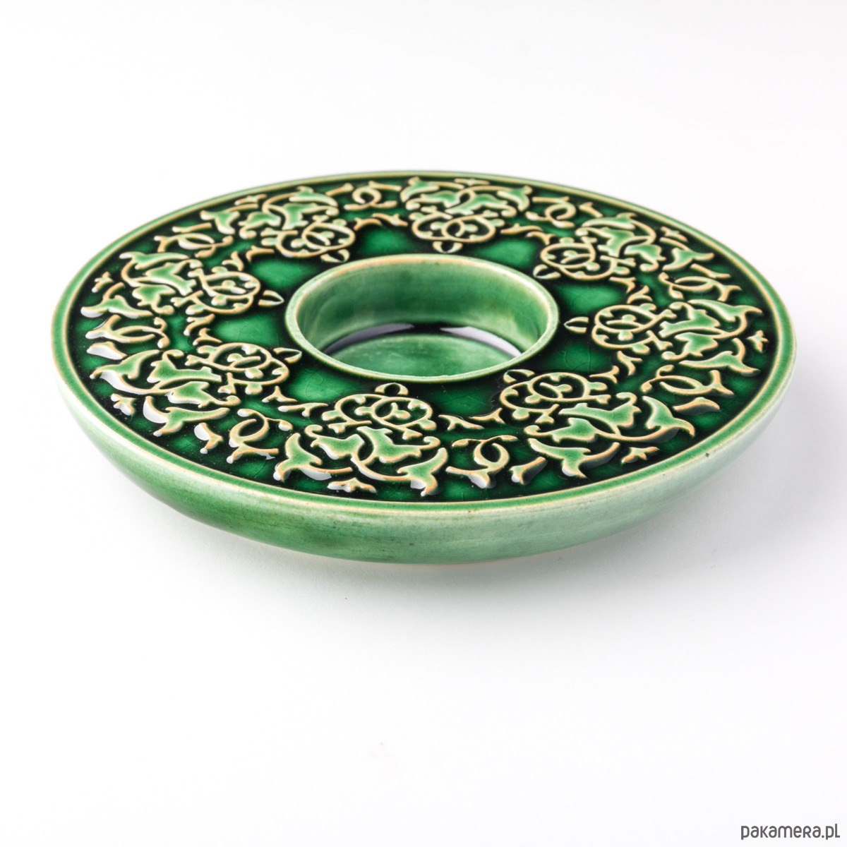 Ceramiczny lampion (świecznik) z lekko wypukłym, roślinnym ornamentem. Wykonany z jasnej gliny, pokryty błyszczącym szkliwem. Od spodu sygnowany. Polecam serdecznie.