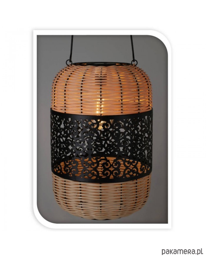 Lampion z lampą solarną na górze. Dwie części plecionki zostały rozdzielone pięknym metalowym ażurem, który daje wspaniałe refleksy świetlne. Doskonały na słoneczną werandę, a następnie na wieczorne spotkania z przyjaciółmi.