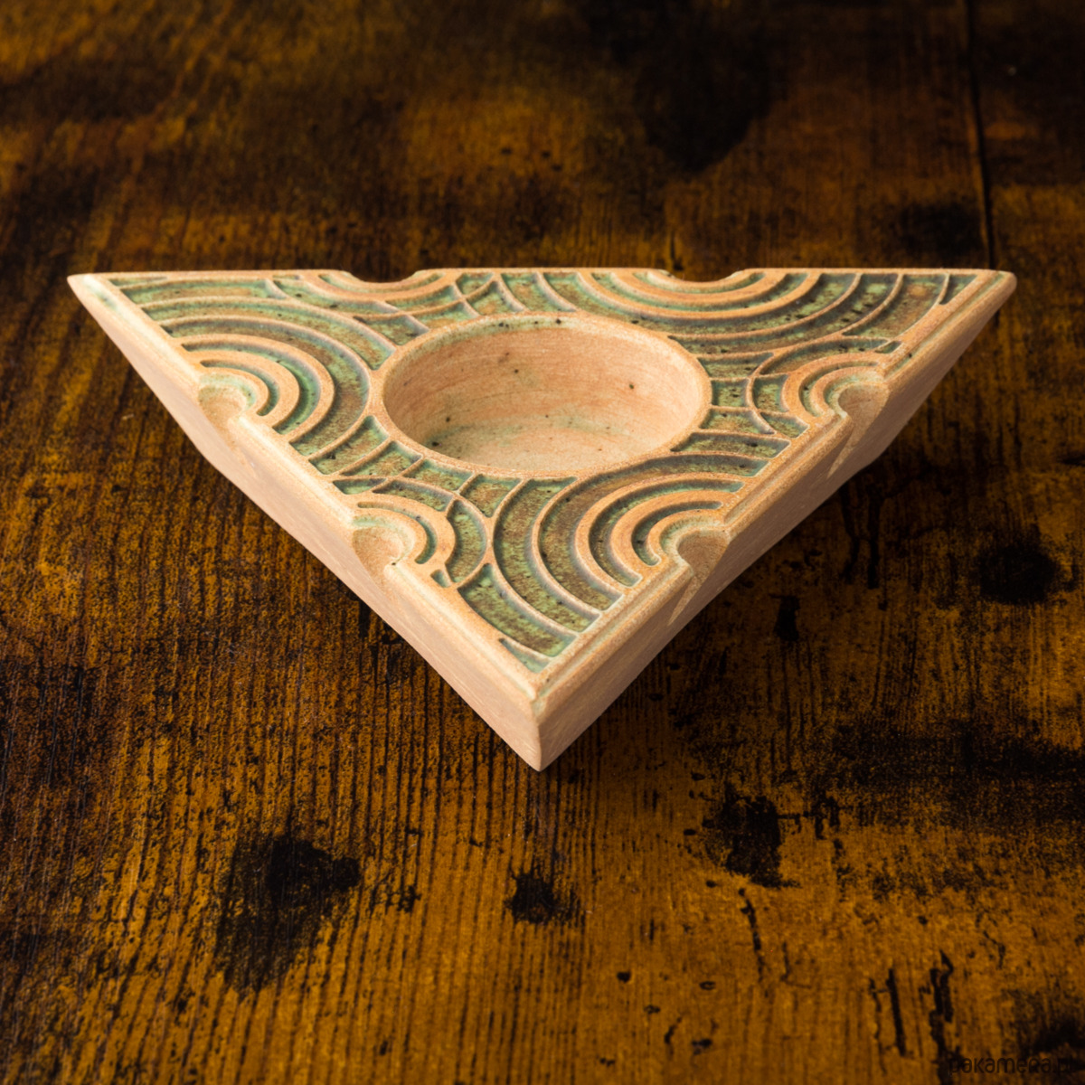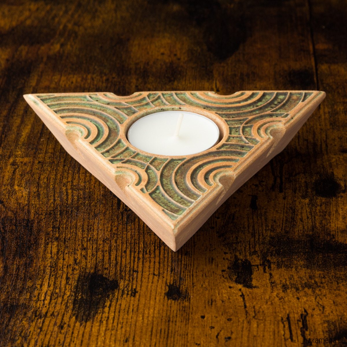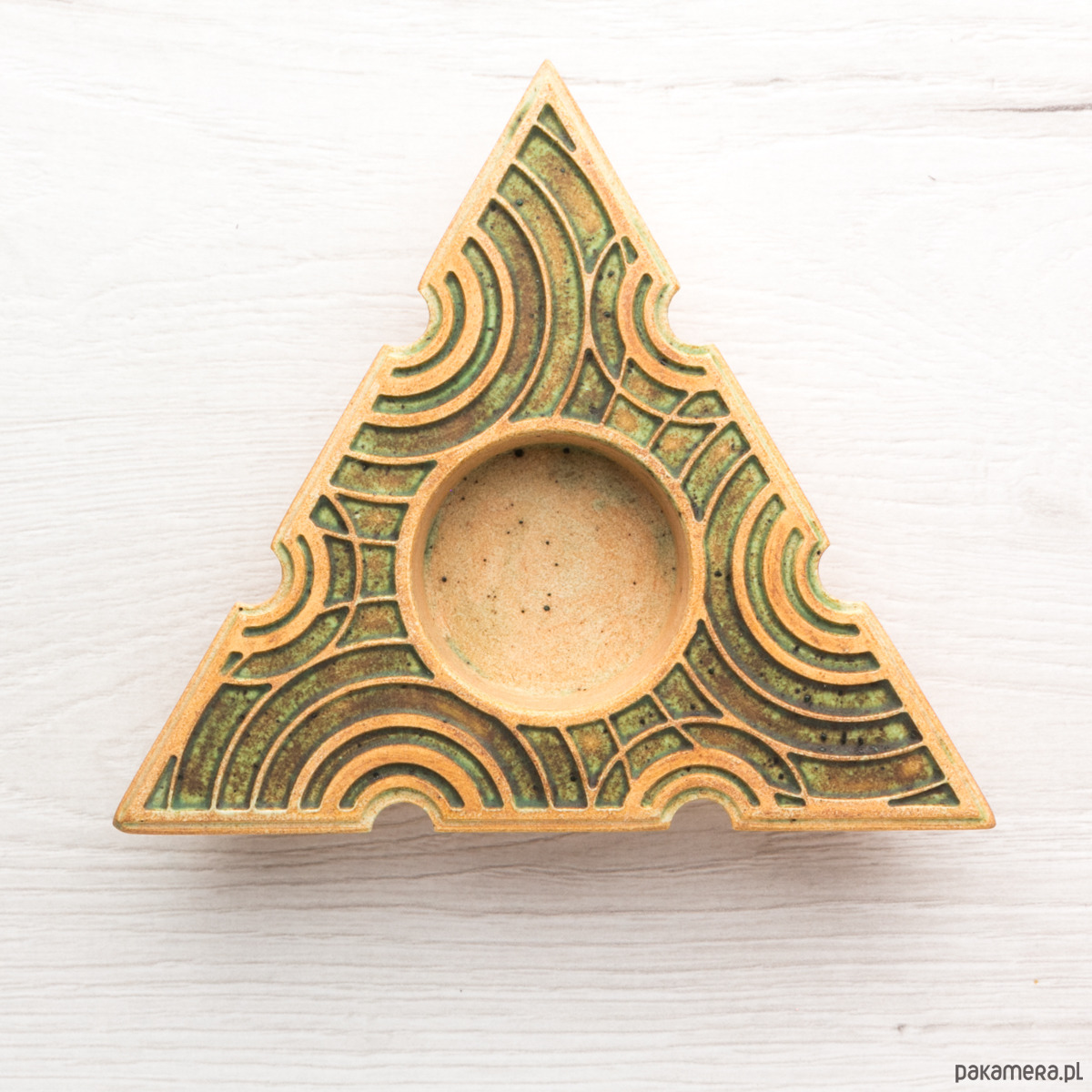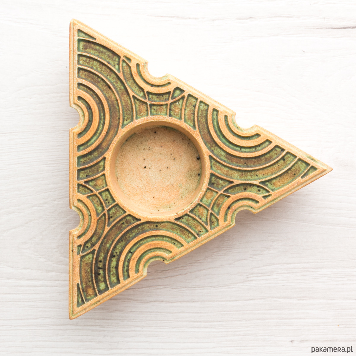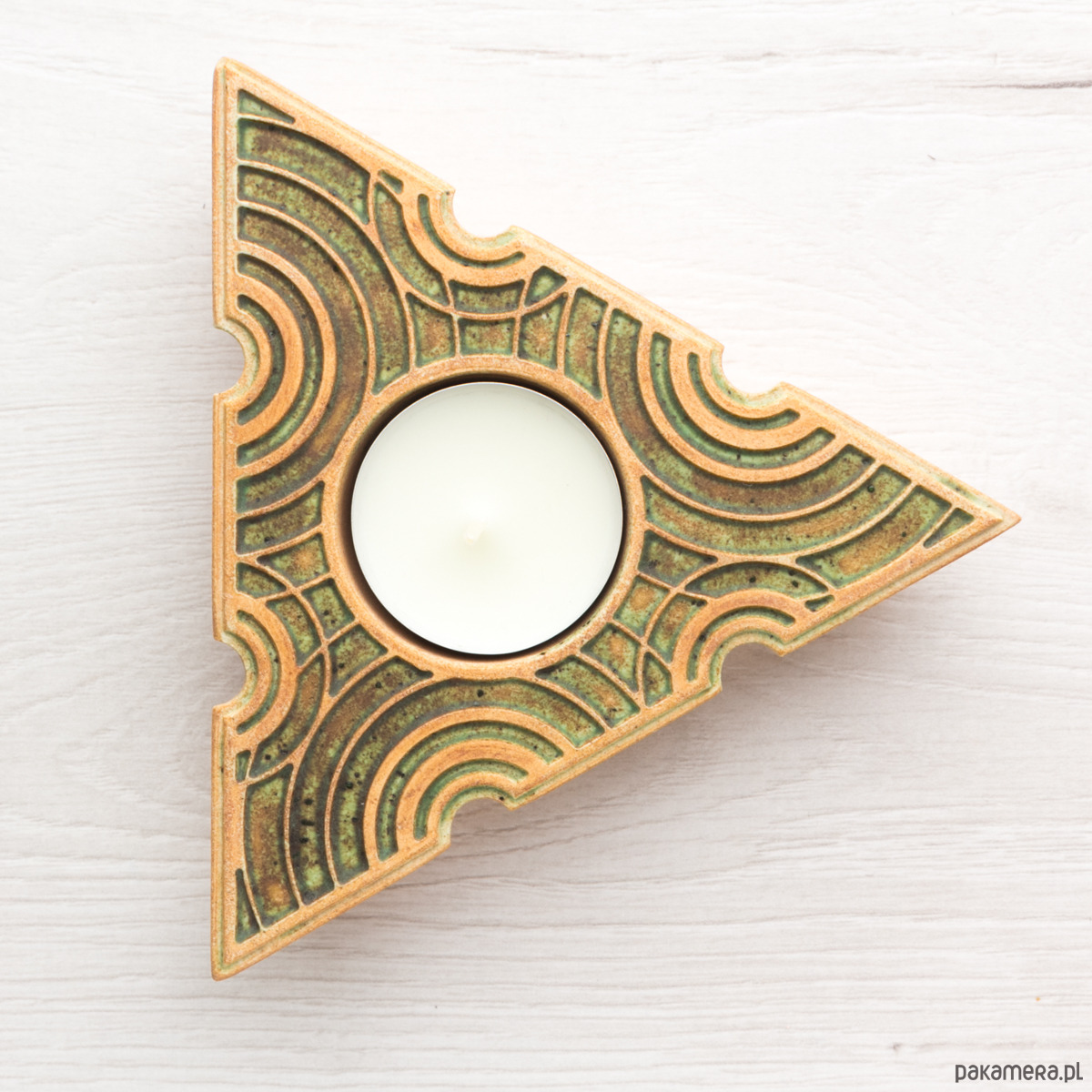 Trójkątny ceramiczny lampion (świecznik) z ozdobnym, lekko wypukłym ornamentem. Ręcznie wykonany z jasnej gliny, pokryty szkliwem o satynowym połysku.