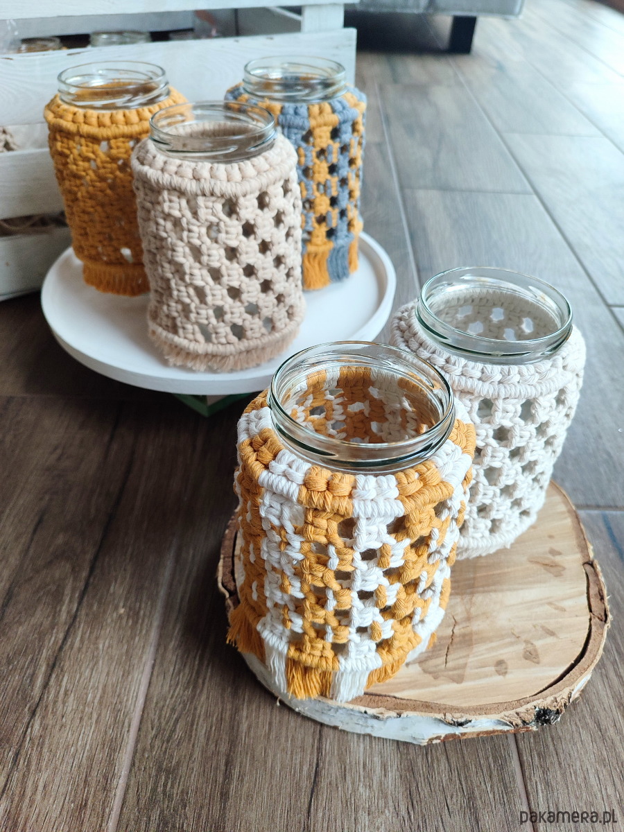Lampion / wazon wykonany metodą makramy ze sznurka skręcanego 3 mm, koloru naturalnego na słoiku o pojemności 0.9 L. Przedmiotem sprzedaży jest lampion bez dekoracji.
