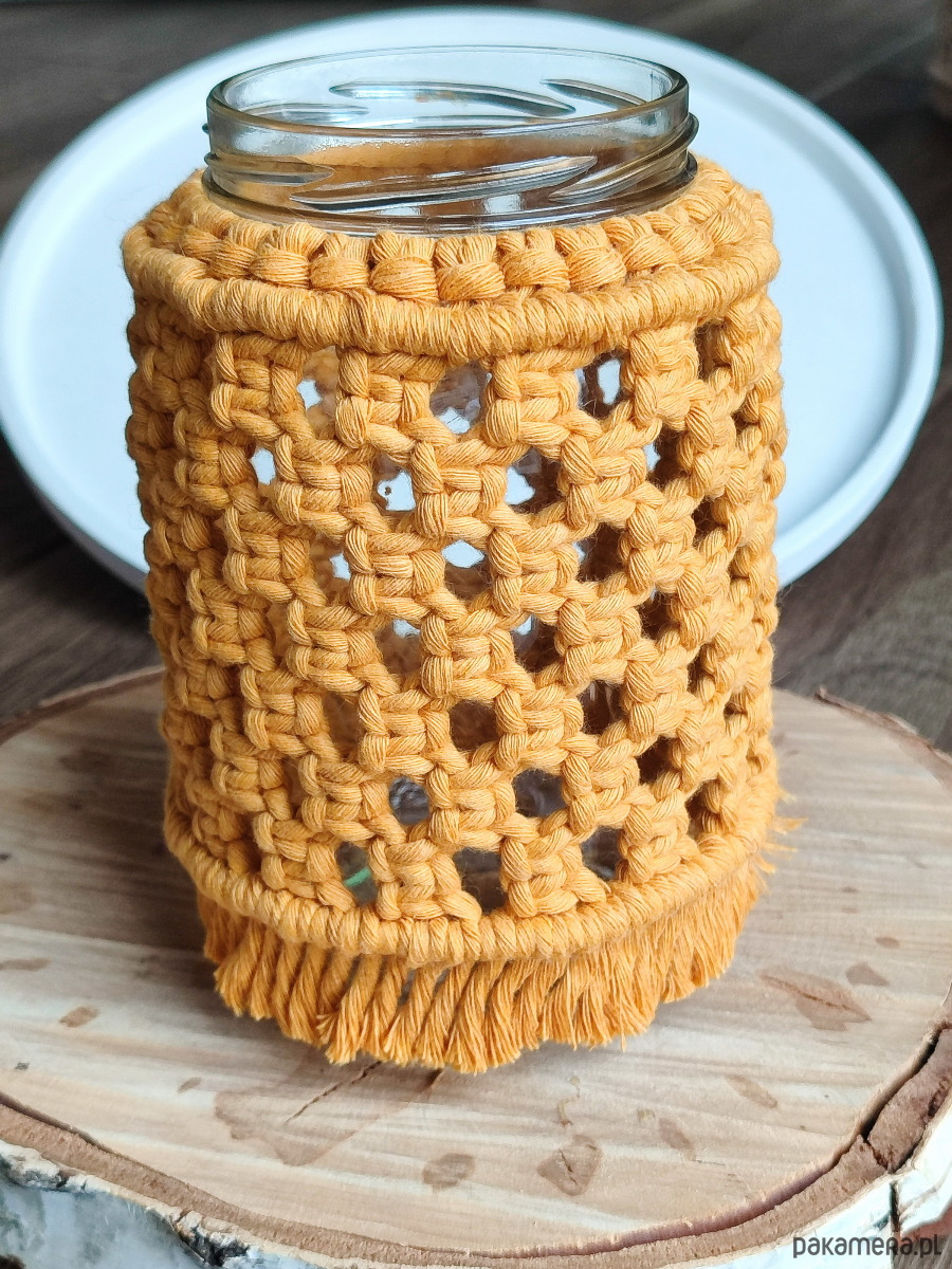 Lampion / wazon wykonany metodą makramy ze sznurka skręcanego 3 mm, koloru miodowego na słoiku o pojemności 0.9 L.