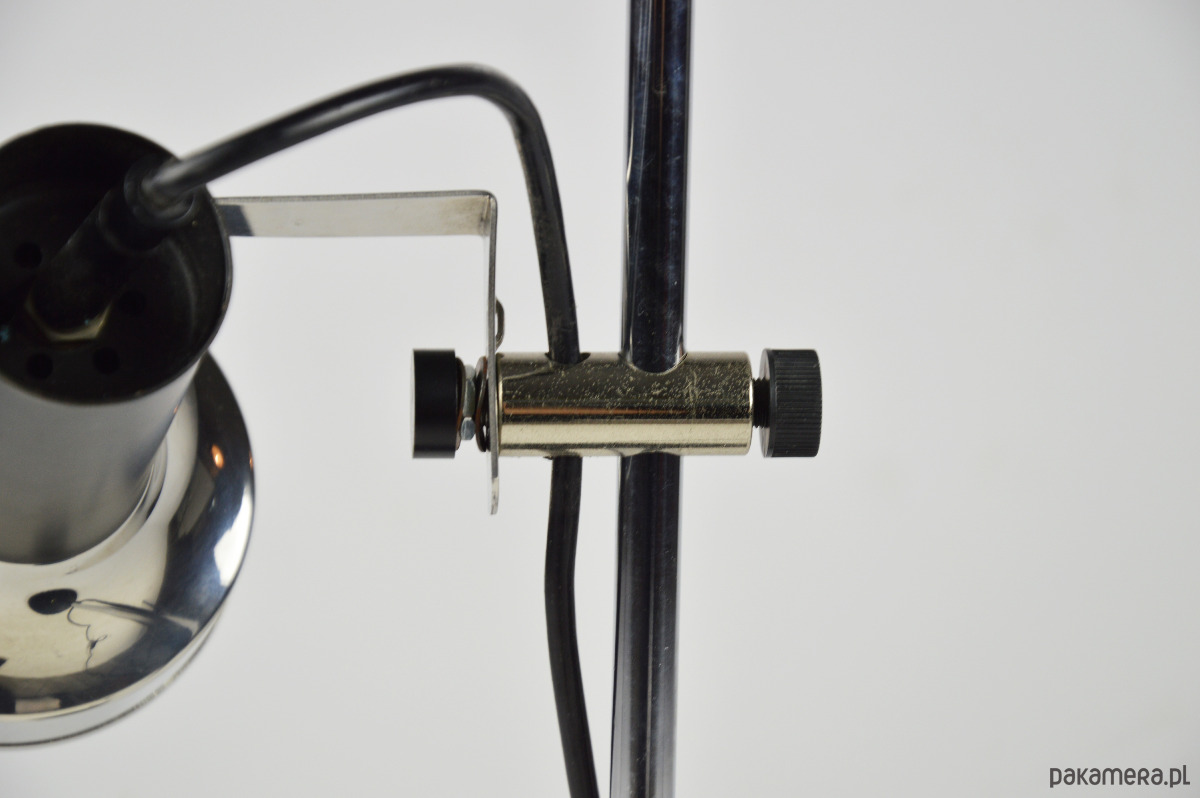 Lampka biurkowa z lat 70 z regulowaną wysokością klosza. Stan zachowania dobry, widoczne rysy i otarcia.