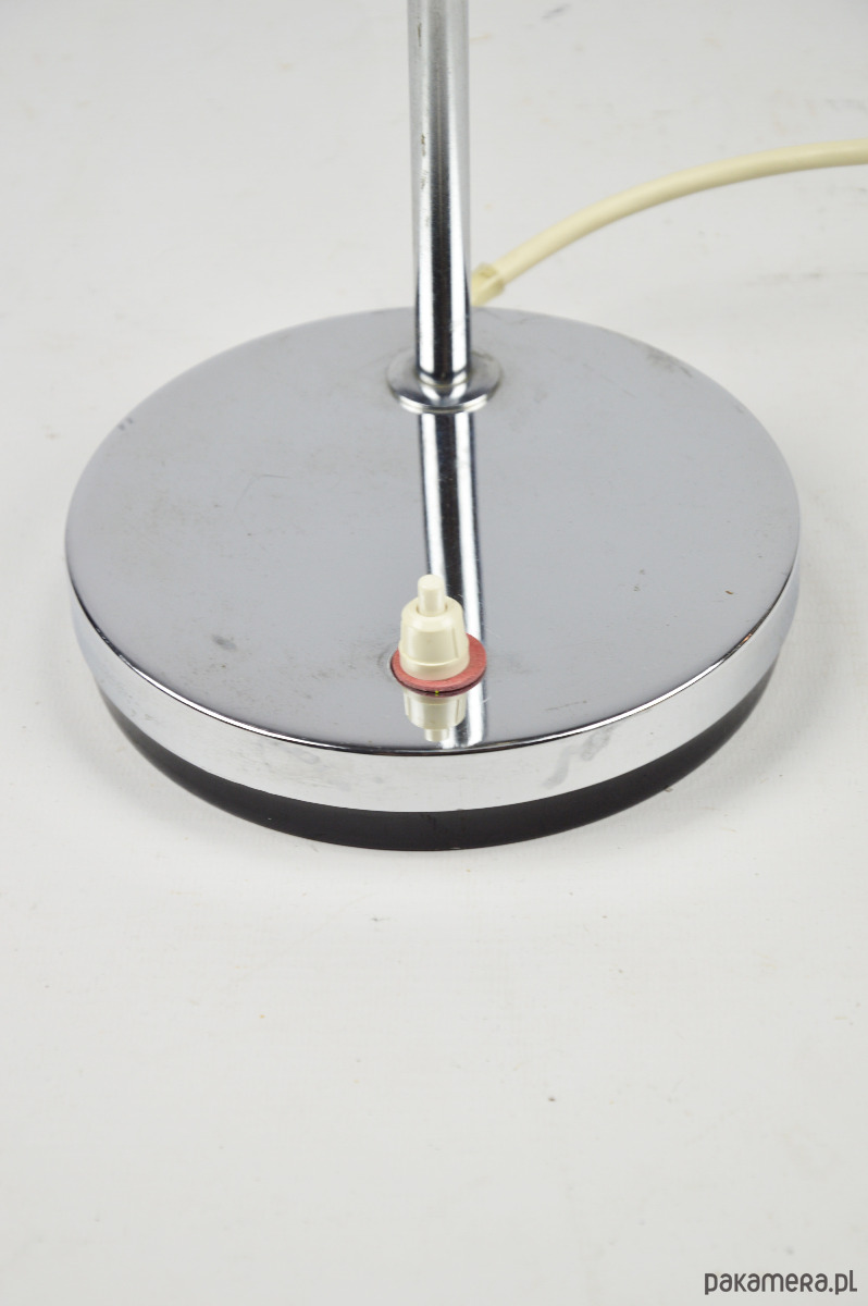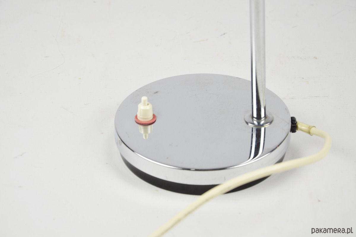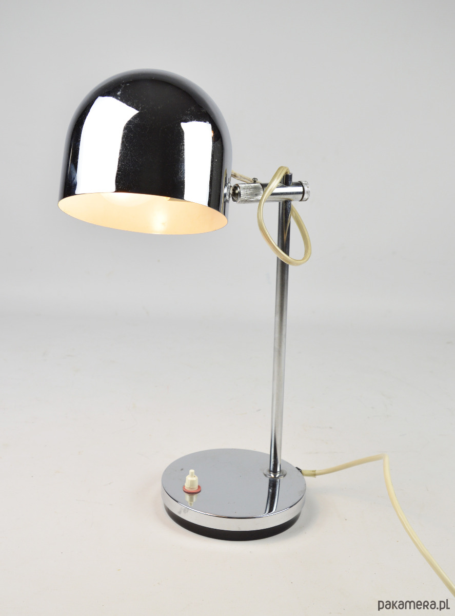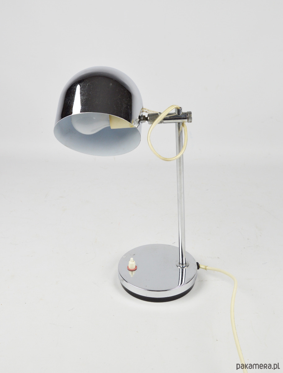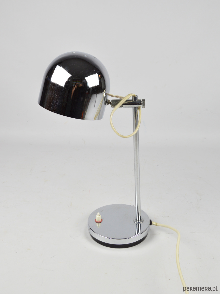 Chromowana lampka biurkowa w stylu space age z lat 80. Stan zachowania dobry, widoczne zmatowienia i rysy,