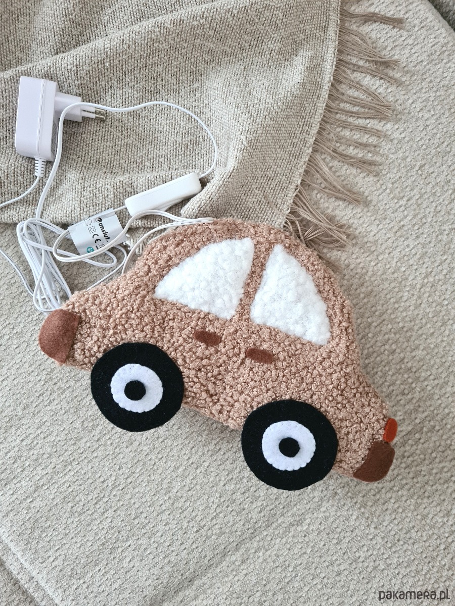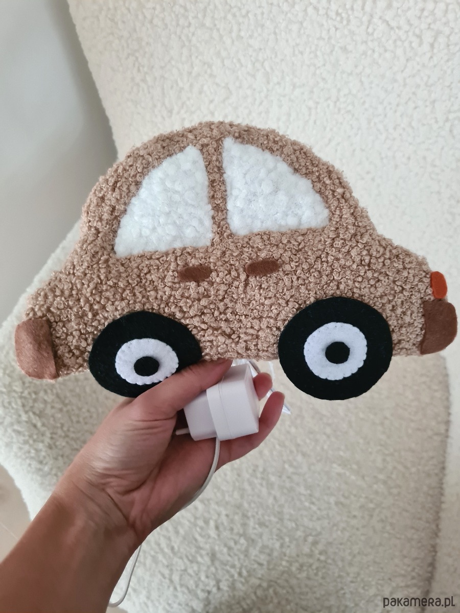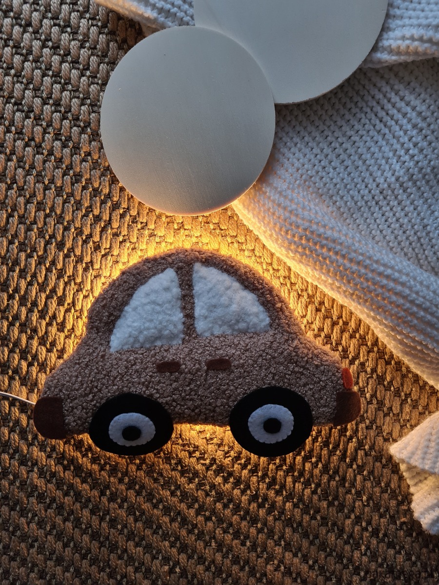 Ręcznie szyta lampka nocna w kształcie samochodu, wykonana z miękkiej i przyjemnej w dotyku tkaniny typu baranek. To idealne połączenie funkcjonalnego oświetlenia i dekoracji do pokoju chłopca.