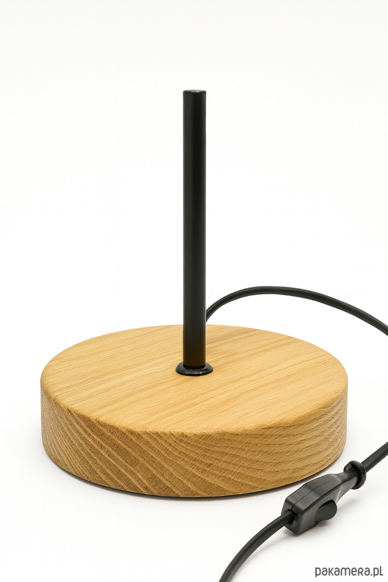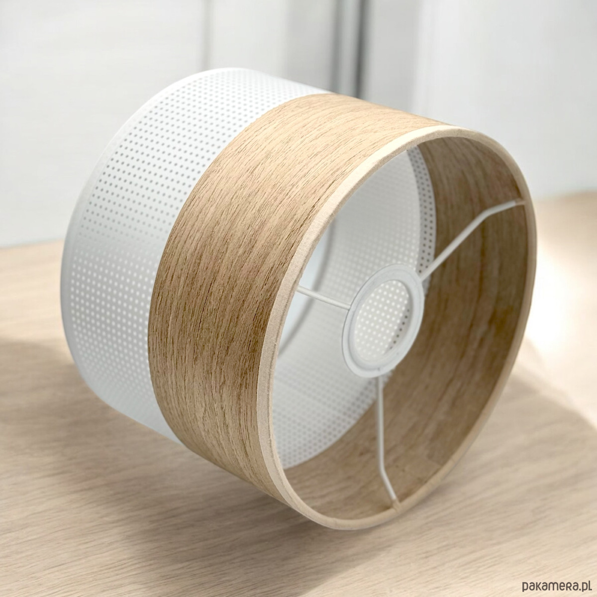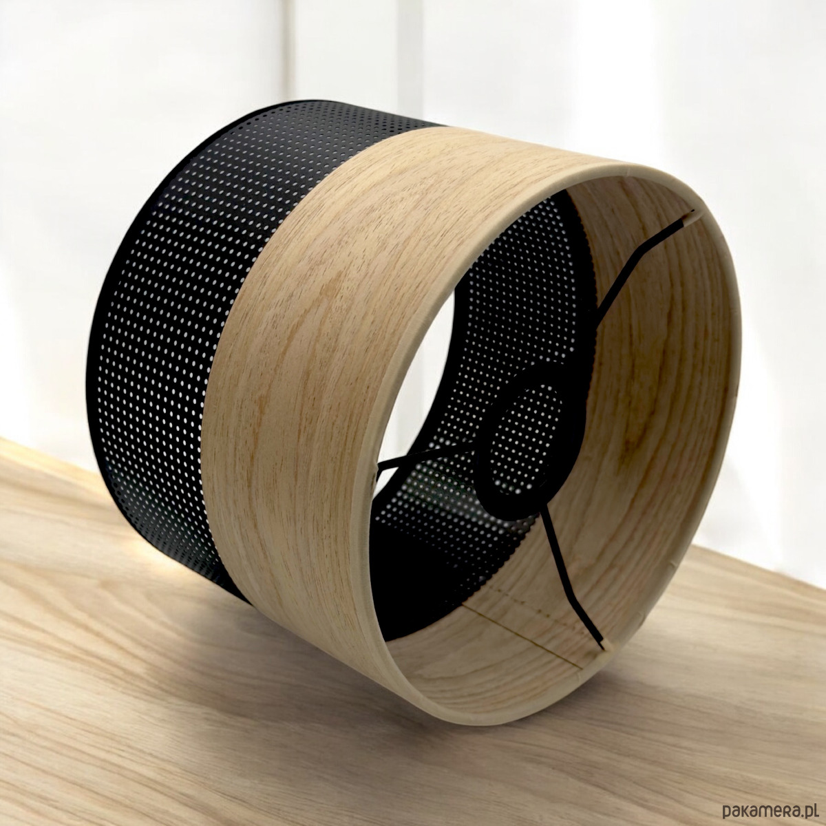 Lampka stojąca o nowoczesnym designie, z okrągłą dębową podstawą o średnicy 16cm lakierowaną bezbarwnym ekologicznym lakierem, a abażury wykonane są z połączenia czarnego lub białego materiału z malutkimi otworami i forniru w kolorze jasnego dębu. Lampa daje przepiękne światło dzięki abażurowi z dziurkami.
