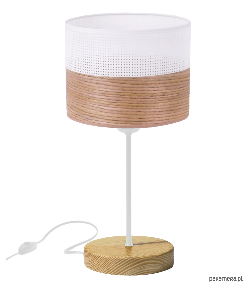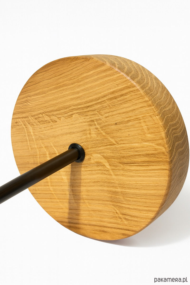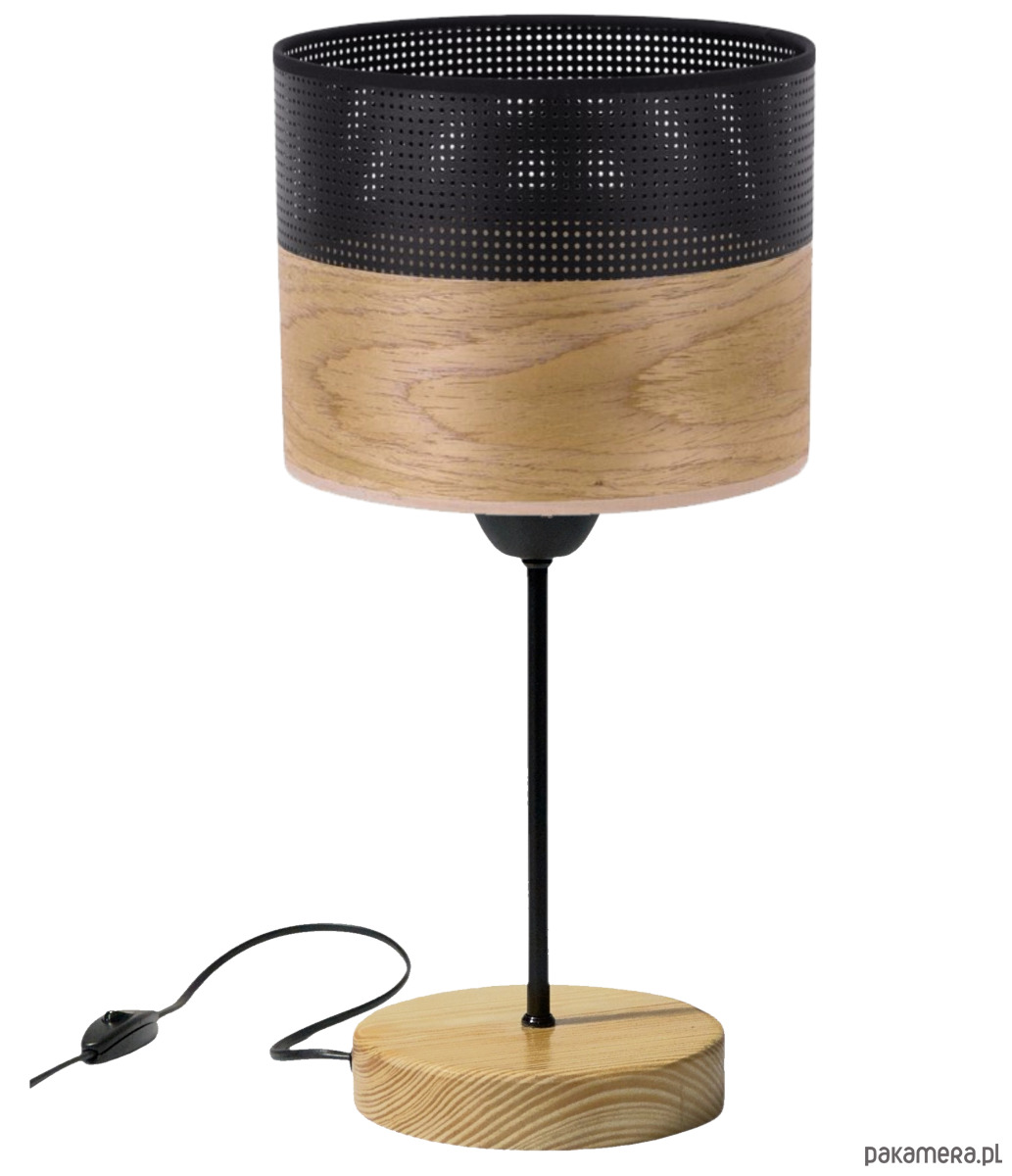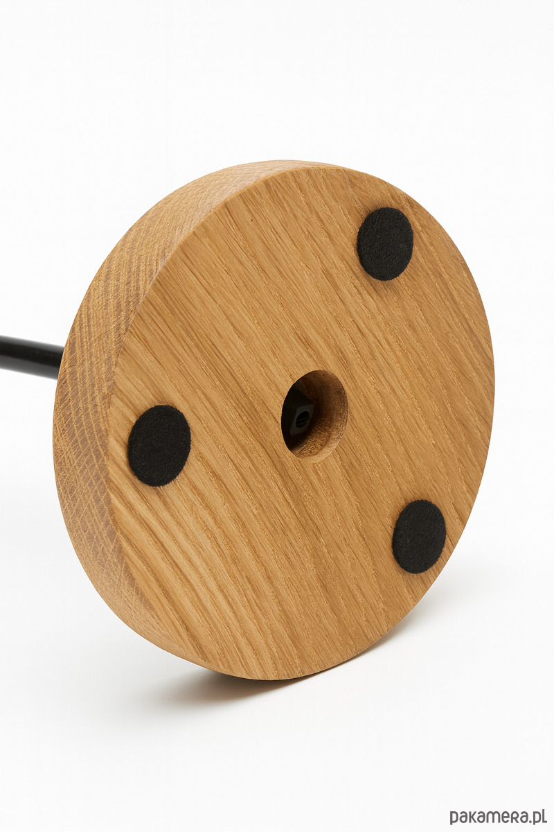 Lampka stojąca o nowoczesnym designie, z okrągłą dębową podstawą o średnicy 16cm lakierowaną bezbarwnym ekologicznym lakierem, a abażury wykonane są z połączenia czarnego lub białego materiału z malutkimi otworami i forniru w kolorze jasnego dębu. Lampa daje przepiękne światło dzięki abażurowi z dziurkami.