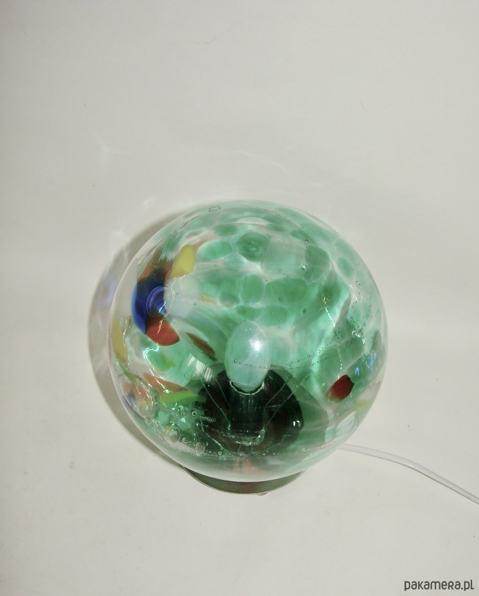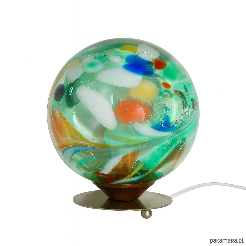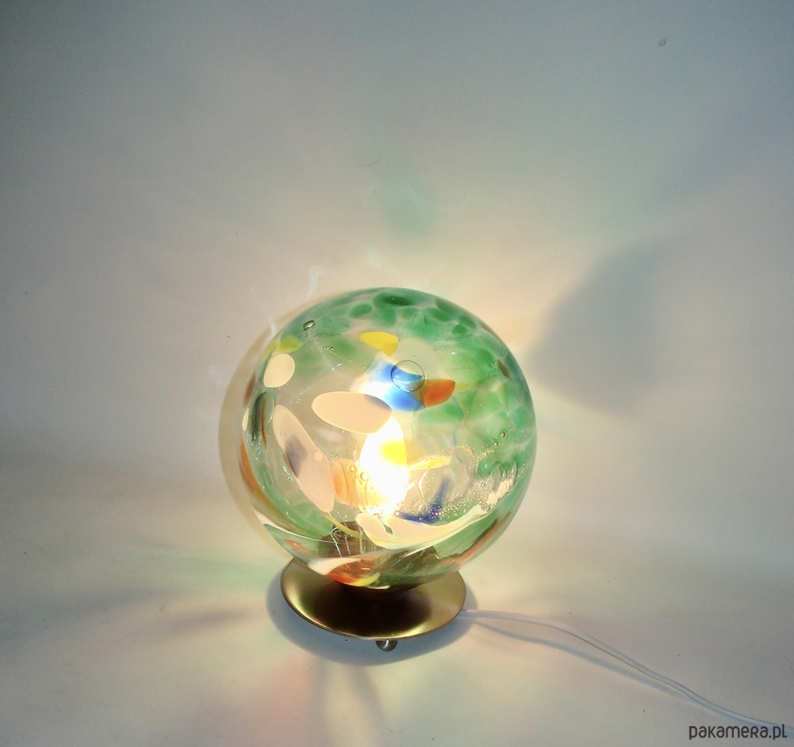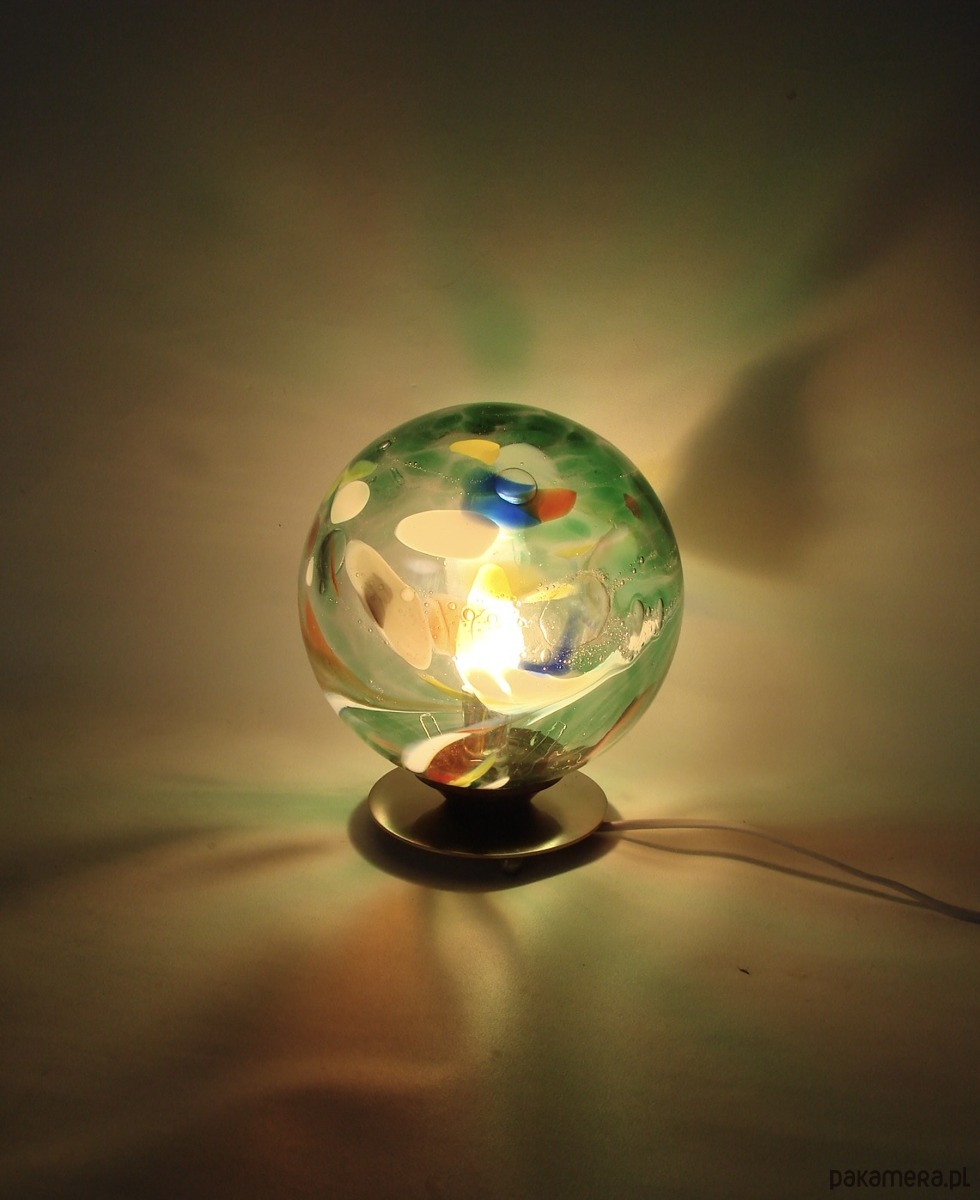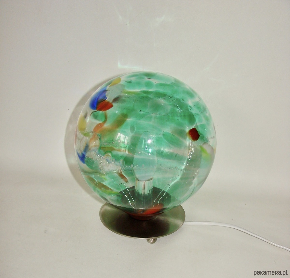 Lampka nocna w formie szklanej kuli z lat 80. to stylowy dodatek do wnętrz retro, modern i eklektycznych. Wykonana z połączenia metalu i szkła, zachowała charakterystyczny dla epoki design oraz dekoracyjny urok.