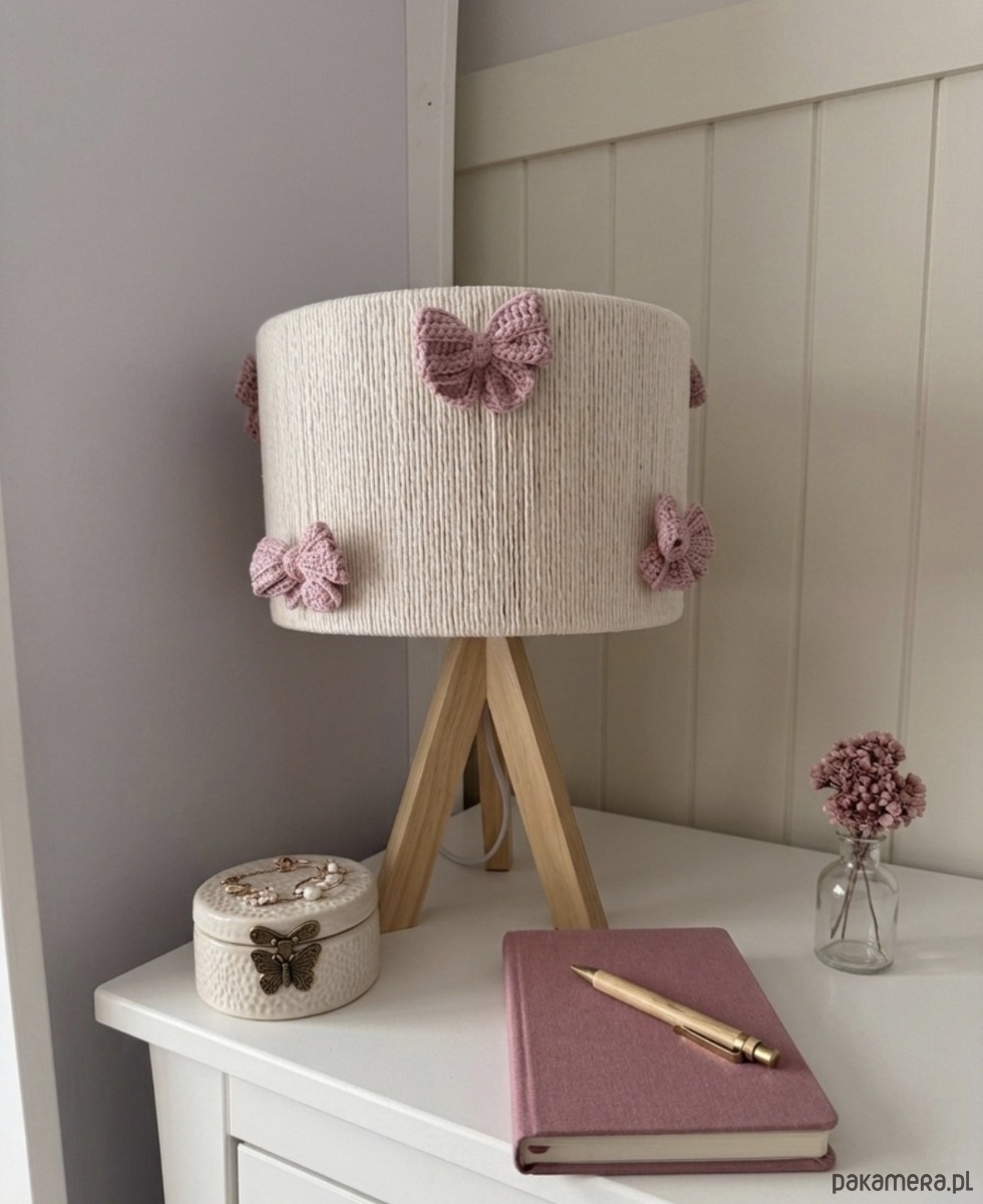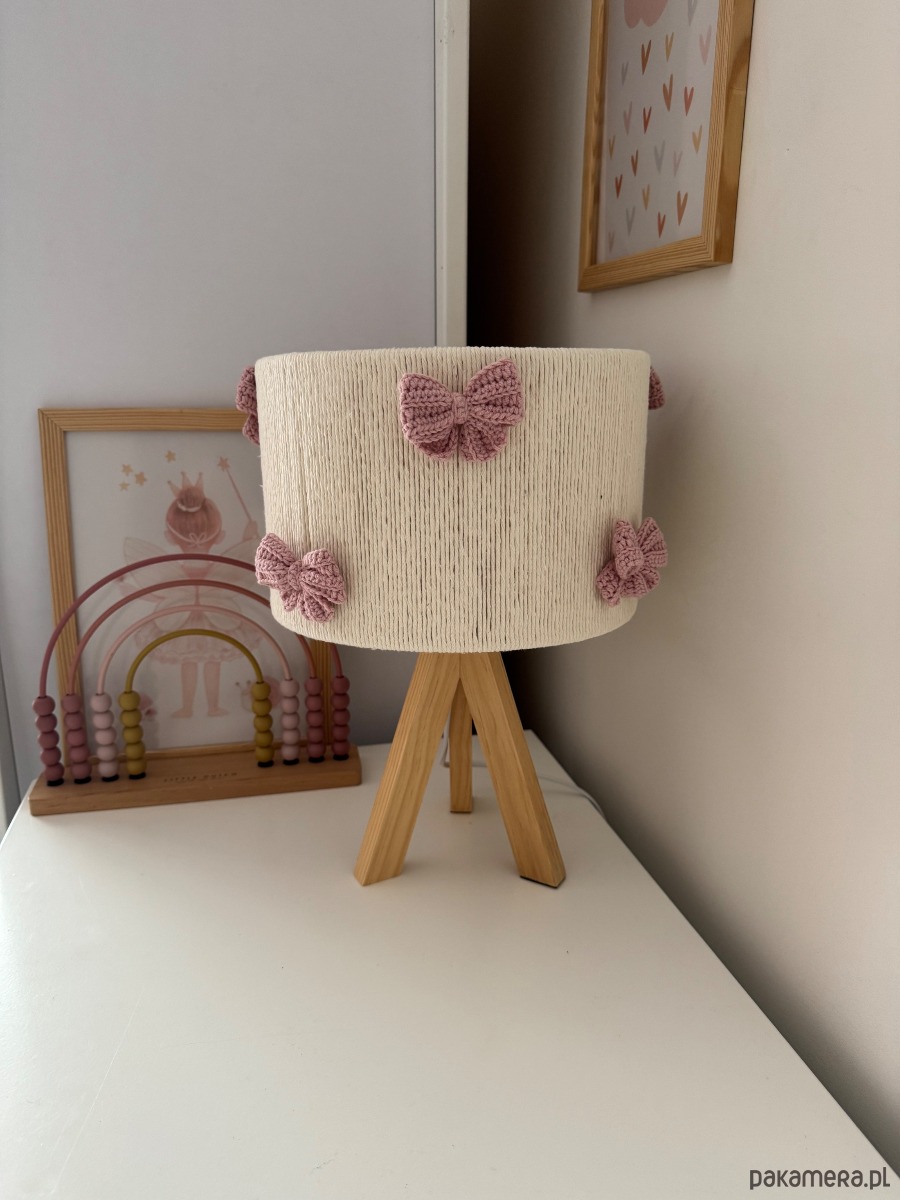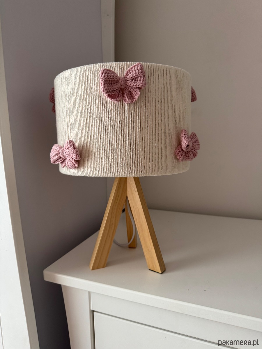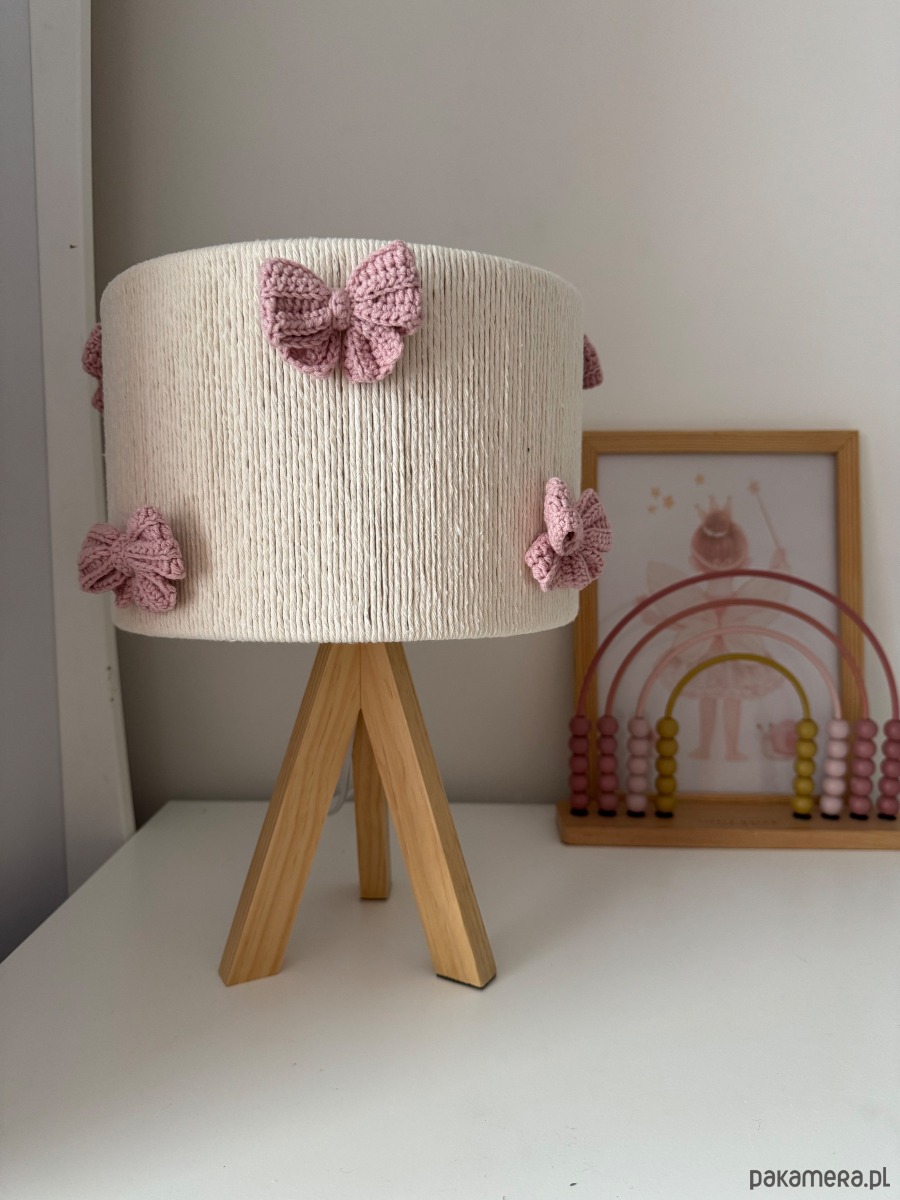 Klosz w kolorze kremowym został ozdobiony ręcznie wykonanymi, szydełkowymi kokardkami w odcieniu brudnego różu, co nadaje jej wyjątkowego, delikatnego charakteru. Stabilna podstawa na trzech drewnianych nogach w naturalnym kolorze świetnie komponuje się z całością.